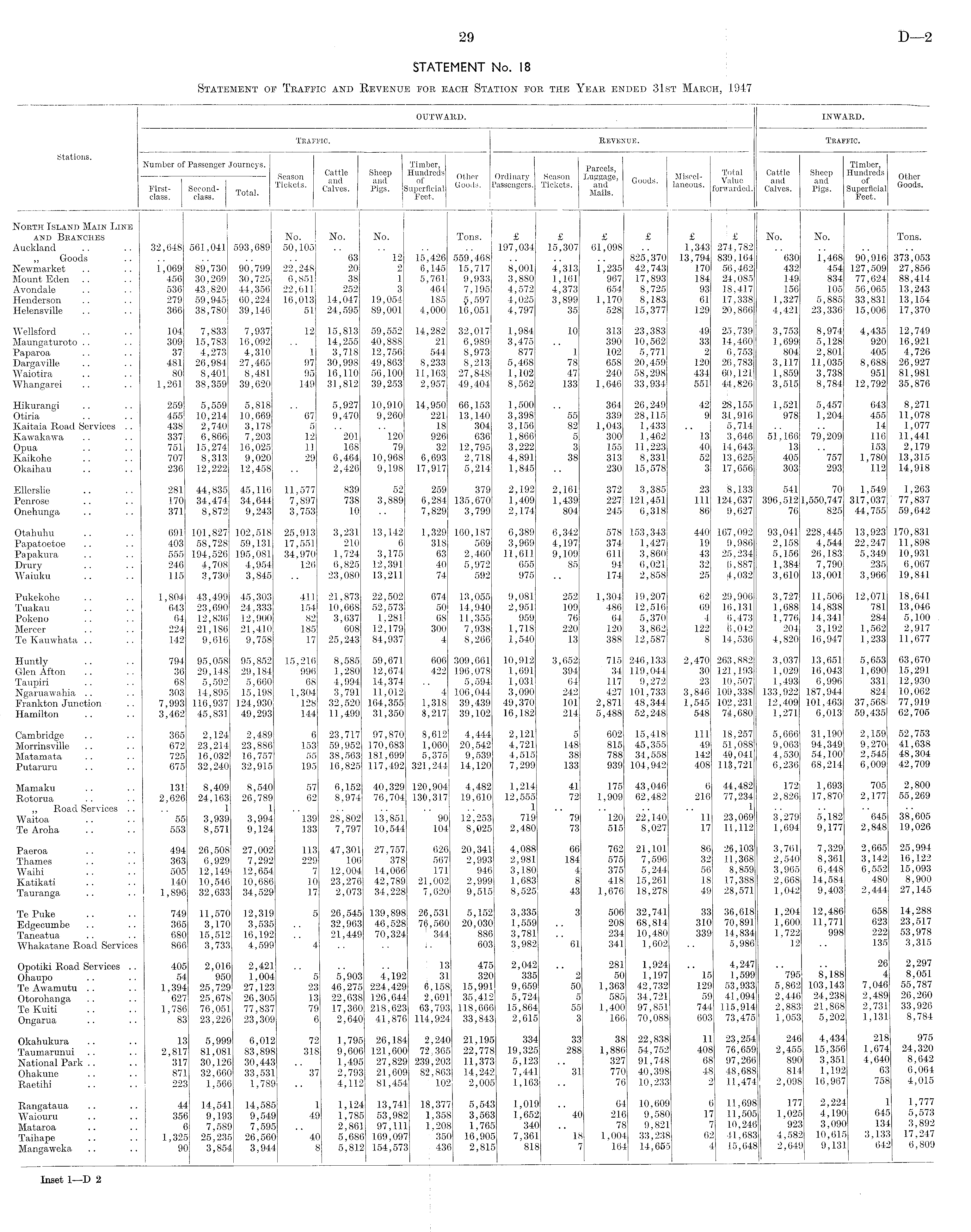 OUTWAKD. INWARD. Tkaffic. Revenue. Traffic. Stations. Number of Firstclass. Passenger Secondclass. "ourneys. Total. Season Tickets. Cattle and Calves. Sheep and Pigs. Timber, Hundreds of Superficial Feet. Other Goods. Ordinary Passengers. Season Tickets. Parcels, Luggage, and Mails. Goods. Miscellaneous. 1 V fon otal alue arded. Cattle and Calves. Sheep and Pigs. Timber, Hundreds of Superficial Feet. Other Goods. North Island Main Line and Branches Nc . No. No. Tons. £ £ £ £ £ £ No. No. Tons. Auckland 32,648 561,041 593,689 50, 105 197,034 15 307 61,098 1 343 27 4,782 „ Goods 63 12 15 ,426 559,468 825^370 13 794 85 9,164 "630 1,468 90,916 373,053 Newmarket i j 069 89,730 90,799 22, 248 20 2 6 ,145 15,717 sjooi 4 313 1,235 42,743 170 6,462 432 454 127,509 27,856 Mount Eden 456 30,269 30,725 6, 851 38 1 5 ,761 9,933 3,880 1 161 967 17,893 184 4,085 149 834 77,624 88,414 Avondale 536 43,820 44,356 22, 611 252 3 464 7,195 4,572 4 373 654 8,725 93 1 8,417 156 105 56,065 13,243 Henderson 279 59,945 60,224 16, 013 14,047 19,054 1S5 §,597 4,025 3 899 1,170 8,183 61 17,338 1,327 5,885 33,831 13,154 Helensville 366 38,780 39,146 51 24,595 89,001 4 ,000 16,051 4,797 35 528 15,377 129 2 0,866 4,421 23,336 15,006 17,370 Wellsford 104 7,833 7,937 12 15,813 59,552 14 ,282 32,017 1,984 10 313 23,383 49 2 5,739 3,753 8,974 4,435 12,749 Maungaturoto 309 15,783 16,092 14,255 40,888 21 6,989 3,475 390 10,562 33 1 4,460 1,699 5,128 920 16,921 Paparoa 37 4,273 4,310 1 3,718 12,756 544 8,973 877 1 102 5,771 2 3,753 804 2,801 405 4,726 Dargaville 481 26,984 27,465 97 30,998 49,863 8 ,233 8,213 5,468 78 658 20,459 120 2 3,783 3,117 11,035 8,688 26,927 Waiotira 80 8,401 8,481 95 16,110 56,100 11 ,163 27,848 1,102 47 240 58,298 434 6 ),121 1,859 3,738 951 81,981 Whangarei 1,261 38,359 39,620 149 31,812 39,253 2 ,957 49,404 8,562 133 1,646 33,934 551 4 1,826 3,515 8,784 12,792 35,876 Hikurangi 259 5,559 5,818 5,927 10,910 14 ,950 66,153 1,500 364 26,249 42 2 3,155 1,521 5,457 643 8,271 Otiria .. 455 10,214 10,669 67 9,470 9,260 221 13,140 3,398 55 339 28,115 9 3 1,916 978 1,204 455 11,078 Kaitaia Road Services .. 438 2,740 3,178 5 18 304 3,156 82 1,043 1,433 5,714 14 1,077 Kawakawa 337 6,866 7,203 12 201 120 926 636 1,866 5 300 1,462 13 3,646 51', 166 79 j 209 116 11,441 Opua .. ' 751 15,274 16,025 11 168 79 32 12,795 3,222 3 155 11,223 40 1 4,643 13 153 2,179 Kaikohe 707 8,313 9,020 29 6,464 10,968 6 ,693 2,718 4,891 38 313 8,331 52 1 3,625 405 ' '757 1,780 13,315 Okaihau 236 12,222 12,458 2,426 9,198 17 ,917 5,214 1,845 230 15,578 3 1 7,656 303 293 112 14,918 Ellerslie 281 44,835 45,116 11 577 839 52 259 379 2,192 2 161 372 3,385 23 B, 133 541 70 1,549 1,263 Penrose 170 34,474 34,644 7 897 738 3,889 6 ,284 135,670 1,409 1 439 227 121,451 111 12 4,637 396,512 1,550,747 317,037 ' 77,837 Onehunga 371 8,872 9,243 3 753 10 7 ,829 3,799 2,174 804 245 6,318 86 3,627 76 825 44,755 59,642 Otahuhu 691 101,827 102,518 25 913 3,231 13,142 1 ,329 160,187 6,389 6 342 578 153,343 440 16 7,092 93,041 228,445 13,923 170,831 Papatoetoe 403 58,728 59,131 17 551 210 6 318 569 3,969 4 197 374 1,427 19 ),986 2,158 4,544 22,247 11,898 Papakura 555 194,526 195,081 34 970 1,724 3,175 63 2,460 11,611 9 109 611 3,860 43 25,234 5,156 26,183 5,349 10,931 Drury 246 4,708 4,954 126 6,825 12,391 40 5,972 655 85 94 6,021 32 3,887 1,384 7,790 235 6,067 Waiuku 115 3,730 3,845 23,080 13,211 74 592 975 174 2,858 25 1,032 3,610 13,001 3,966 19,841 Pukekohe 1,804 43,499 45,303 411 21,873 22,502 674 13,055 9,081 252 1,304 19,207 62 2 3,906 3,727 11,506 12,071 18,641 Tuakau 643 23,690 24,333 154 10,668 52,573 50 14,940 2,951 109 486 12,516 69 1 3,131 1,688 14,838 781 13,046 Pokeno 64 12,836 12,900 82 3,637 1,281 68 11,355 959 76 64 5,370 4 1,473 1,776 14,341 284 5,100 Mercer 224 21,186 21,410 185 608 12,179 | 300 7,938 1,718 220 120 3,862 122 5,042 204 3,192 1,562 2,917 Te Kauwhata 142 9,616 9,758 17 25,243 84,937 4 8,266 1,540 13 388 12,587 8 1 1,536 4,820 16,947 1,233 11,677 Huntly 794 95,058 95,852 15 216 8,585 59,671 606 309,661 10,912 3 652 715 246,133 2 470 26 1,882 3,037 13,651 5,653 63,670 Glen Afton 36 29,148 29,184 996 1,280 12,674 422 196,078 1,691 394 34 119,044 30 12 1,193 1,029 16,043 1,690 15,291 Taupiri 68 5,592 5,660 68 4,994 14,374 5,594 1,031 64 117 9,272 23 1 ),507 1,493 6,996 331 12,930 Ngaruawahia 303 14,895 15,198 1 304 3,791 11,012 4 106,044 3,090 242 427 101,733 3 846 10 ), 338 133.922 187,944 824 10,062 Frankton Junction 7,993 116,937 124,930 128 32,520 164,355 i ,318 39,439 49,370 101 2,871 48,344 1 545 10 J,231 12,409 101,463 37,568 77,919 Hamilton 3,462 45,831 49,293 144 11,499 31,350 j ,217 39,102 16,182 214 5,488 52,248 548 7 4,680 1,271 6,013 59,435 62,705 Cambridge 365 2,124 2,489 6 23,717 97,870 ,612 4,444 2,121 5 602 15,418 111 18,257 5,666 31,190 2,159 52,753 Morrinsville 672 23,214 23,886 153 59,952 170,683 ,060 20,542 4,721 148 815 45,355 49 5 1,088 0,041 9,063 94,349 9,270 41,638 Matamata 725 16,032 16,757 55 38,563 181,699 £ ,375 9,539 4,515 38 788 34,558 142 4 4,530 54,100 2,545 48,304 Putaruru 675 32,240 32,915 195 16,825 117,492 321 ,244 14,120 7,299 133 939 104,942 408 11 3,721 6,236 68,214 6,009 42,709 Mamaku 131 8,409 8,540 57 6,152 40,329 12( ,904 4,482 1,214 41 175 43,046 6 4,482 172 1,693 705 2,800 Rotorua 2,626 24,163 26,789 62 8,974 76,704 13 ,317 19,610 12,555 72 1,909 62,482 216 77,234: 2,826 17,870 2,177 55,269 „ Road Services .. 1 1 1 1 38,605 Waitoa 55 3,939 3,994 139 28,802 13,851 90 12,253 719 79 120 22,140 11 23,069 3 i 279 5 j 182 645 Te Aroha 553 8,571 9,124 133 7,797 10,544 104 8,025 2,480 73 515 8,027 17 11,112 1,694 9,177 2,848 19,026 Paeroa 494 26,508 27,002 113 47,301 27,757 626 20,341 4,088 66 762 21,101 86 2$,103 3,761 7,329 2,665 25,994 Thames 363 6,929 7,292 229 106 378 567 2,993 2,981 184 575 7,596 32 11,368 2,540 8,361 3,142 16,122 Waihi 505 12,149 12,654 7 12,004 14,066 - 171 946 3,180 4 375 5,244 56 8,859 3,965 6,448 6,552 15,093 Katikati ... 140 10,546 10,686 10 23,27