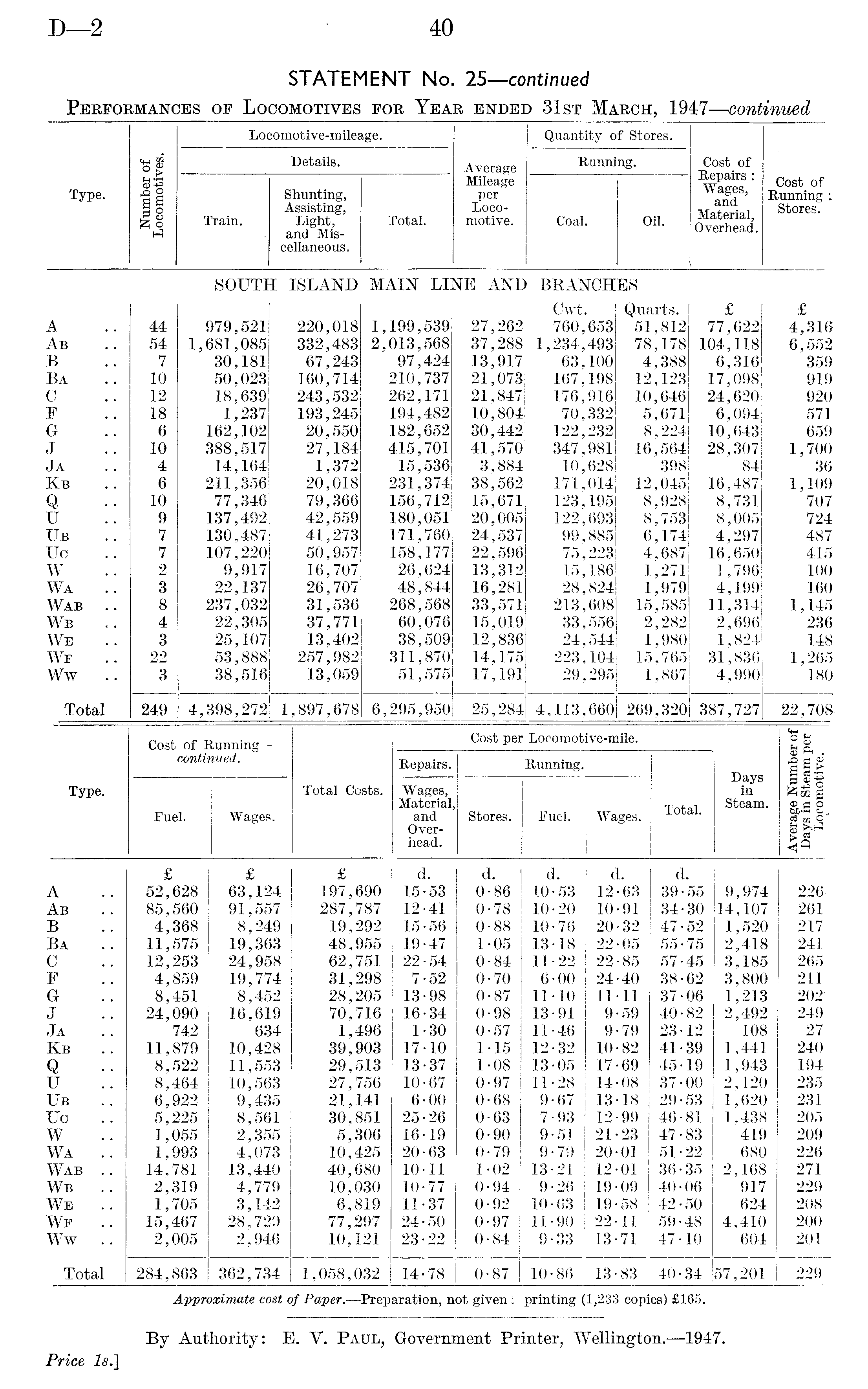 Locomotive-mileage. Quantity of Stores. ° § Details. Average Running. Cost of Repairs : Wages, and Material, Overhead. Type. o O 8 9 p 8 Train. Shunting, Assisting, Light, and Miscellaneous. Total. Mileage per Locomotive. Coal. Oil. Cost of Running ; Stores. SOUTH ISLAND MAIN LINE AND BRANCHES A Ab B Ba C F G J Ja Kb Q U Ub Uc W Wa Wab .. Wb We Wp Ww .. 44 54 7 10 12 18 6 10 4 6 10 9 7 7 2 3 8 4 3 22 3 979,521 1,681,085 30,181 50,023 18,639 1,237 162,102 388,517 14,164 211,356 77,346 137,492 130,487 107,220 9,917 22,137 237,032 22,305 25,107 53,888 38,516 220,018 332,483 67,243 160,714 243,532 193,245 20,550 27,184 1,372 20,018 79,366 42,559 41,273 50,957 16,707 26,707 31,536 37,771 13,402 257,982 13,059 1,199,539 2,013,568 97,424 210,737 262,171 194,482 182,652 415,701 15,536 231,374 156,712 180,051 171,760 158,177 26,624 48,844 268,568 60,076 38,509 311,870 51,575 27,262 37,288 13,917 21,073 21,847 10,804 30,442 41.570 3,884 38,562 15,671 20,005 24,537 22,596 13,312 16,281 33.571 15,019 12,836 14,175 17,191 Cwt. 760,653 1,234,493 63,100 167,198 176,916 70,332 122,232 347,981 10,628 171,014 123,195 122,693 99,885 75,223 15,186 28,824 213,608 33,556 24,544 223,104 29',295 Quarts. 51,812 78,178 4,388 12,123 10,646 5,671 8,224 16,564 398 12,045 8,928 8,753 6,174 4,687 1,271 1.979 15,585 2,282 1.980 15,765 1,867 £ 77,622 104,118 6,316 17,098 24,620 6,094 10,643 28,307 84 16,487 8,731 8,005 4,297 16,650 1,796 4,199 11,314 2,696 1,824 31,836 4,990 £ 4,316 6,552 359 919 920 571 659 1,700 36 1,109 707 724 487 415 100 160 1,145 236 148 1,265 180 Total 249 4,398,272 1 ,897,678 6,295,950 25,284 4,113,660 269,320 387,727 22,708Cost of Running - Cost per Locomotive-mile. ® <3 §3 ft . d « sis continued. Repairs. Running. Days in Steam. Type. Fuel. Wages. Total Costs. Wages, Material, and Overhead. Stores. Fuel. Wages. Total. £ ft® a ® a o l|3A Ab B Ba 0 F G J Ja Kb Q U Ub Uc W WA .. Wab .. Wb .. WB .. WF Ww .. £ 52,628 85,560 4,368 11,575 12,253 4,859 8,451 24,090 742 11,879 8,522 8,464 6,922 5,225 1,055 1,993 14,781 2,319 1,705 15,467 2,005 £ 63,124 91,557 8,249 19,363 24,958 19,774 8,452 16,619 634 10,428 11,553 10,563 9,435 8,561 2,355 4,073 13,440 4,779 3,142 28,729 2,946 £ 197,690 287,787 19,292 48,955 62,751 31,298 28,205 70,716 1,496 39,903 29,513 27,756 21,141 30,851 5,306 10,425 40,680 10,030 6,819 77,297 10,121 d. 15-53 12-41 15-56 19-47 22-54 7-52 13-98 16-34 1-30 17-10 13-37 10-67 6-00 25-26 16-19 20-63 10-11 10-77 11-37 24-50 23-22 d. 0-86 0-78 0-88 1-05 0-84 0-70 0-87 0-98 0-57 1-15 1-08 0-97 0-68 0-63 0-90 0-79 1-02 0-94 0-92 0-97 0-84 d. 10-53 10-20 10-76 13-18 11-22 6-00 11-10 13-91 11-46 12-32 13-05 11-28 9-67 7-93 9-51 9-79 13-21 9-26 10-63 11-90 9-33 d. 12-63 10-91 20-32 22-05 22-85 24-40 11-11 9-59 9-79 10-82 17-69 14-08 13-18 12-99 21-23 20-01 12-01 19-09 19-58 22-11 13-71 d. 39-55 34-30 47-52 55-75 57-45 38-62 37-06 40-82 23-12 41-39 45-19 37-00 29-53 46-81 47-83 51-22 36-35 40-06 42-50 59-48 47-10 9,974 14,107 1,520 2,418 3,185 3,800 1,213 2,492 108 1,441 1,943 2,120 1,620 1.438 419 680 2,168 917 624 4,410 604 226 261 217 241 265 211 202 249 27 240 194 235. 231 205209 226. 271 229 208 200 201 Total 284,863 362,734 1,058,032 14-78 0-87 10-86 13 •83 40-34 57,201 229