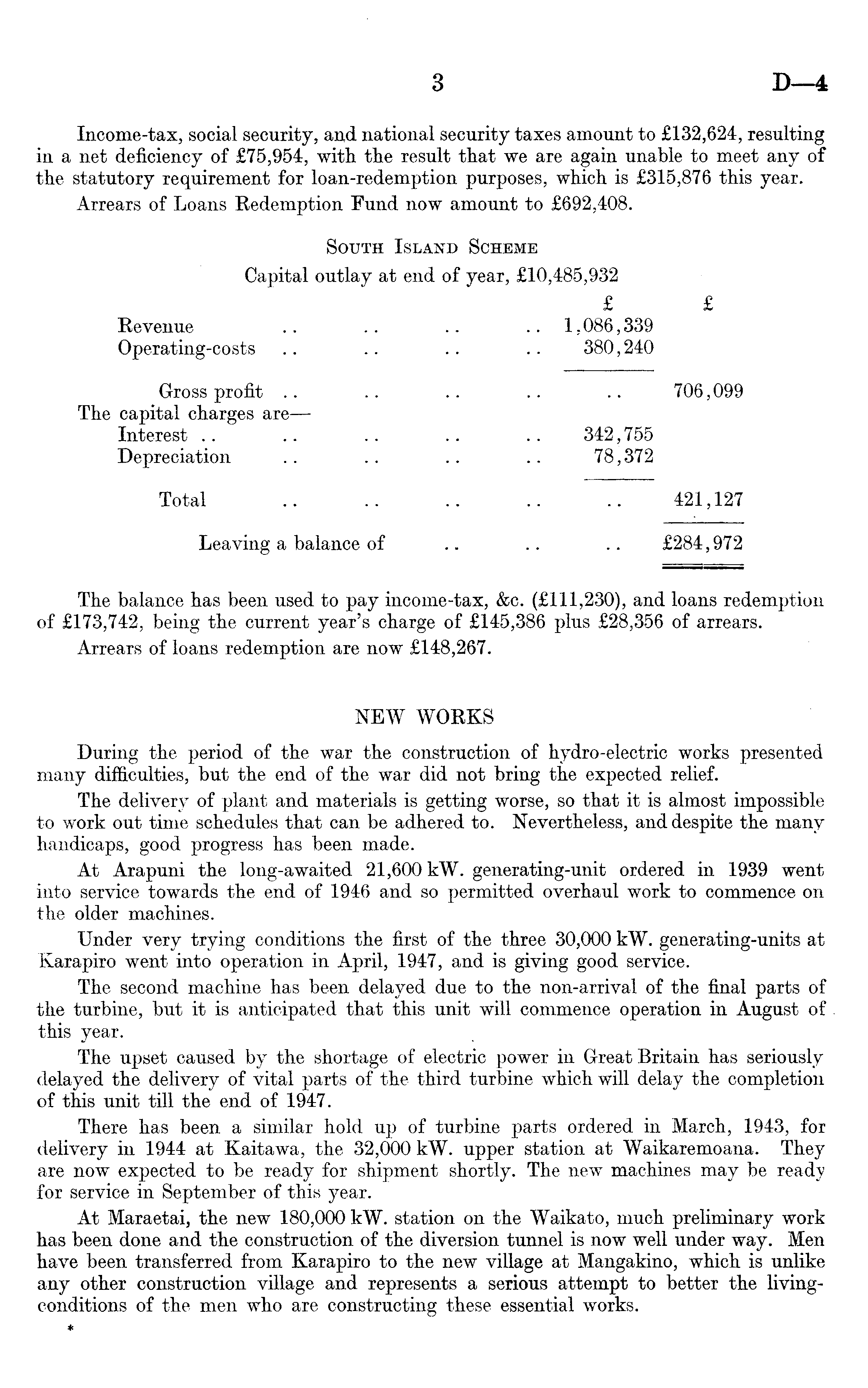 Income-tax, social security, and national security taxes amount to £132,624, resulting in a net deficiency of £75,954, with the result that we are again unable to meet any of the statutory requirement for loan-redemption purposes, which is £315,876 this year. Arrears of Loans Redemption Fund now amount to £692,408. South Island Scheme Capital outlay at end of year, £10,485,932 £ £ Revenue .. .. .. .. 1,086,339 Operating-costs .. .. .. .. 380,240 Gross profit .. .. .. .. .. 706,099 The capital charges are — Interest .. .. .. .. .. 342,755 Depreciation .. .. .. .. 78,372 Total .. .. .. .. .. 421,127 Leaving a balance of .. .. .. £284,972 The balance has been used to pay income-tax, &c. (£111,230), and loans redemption of £173,742, being the current year's charge of £145,386 plus £28,356 of arrears. Arrears of loans redemption are now £148,267. NEW WORKS During the period of the war the construction of hydro-electric works presented many difficulties, but the end of the war did not bring the expected relief. The delivery of plant and materials is getting worse, so that it is almost impossible to work out time schedules that can be adhered to. Nevertheless, and despite the many handicaps, good progress has been made. At Arapuni the long-awaited 21,600 kW. generating-unit ordered in 1939 went into service towards the end of 1946 and so permitted overhaul work to commence on the older machines. Under very trying conditions the first of the three 30,000 kW. generating-units at Karapiro went into operation in April, 1947, and is giving good service. The second machine has been delayed due to the non-arrival of the final parts of the turbine, but it is anticipated that this unit will commence operation in August of this year. The upset caused by the shortage of electric power in Great Britain has seriously delayed the delivery of vital parts of the third turbine which will delay the completion of this unit till the end of 1947. There has been a similar hold up of turbine parts ordered in March, 1943, for delivery in 1944 at Kaitawa, the 32,000 kW. upper station at Waikaremoana. They are now expected to be ready for shipment shortly. The new machines may be ready for service in September of this year. At Maraetai, the new 180,000 kW. station on the Waikato, much preliminary work has been done and the construction of the diversion tunnel is now well under way. Men have been transferred from Karapiro to the new village at Mangakino, which is unlike any other construction village and represents a serious attempt to better the livingconditions of the men who are constructing these essential works.