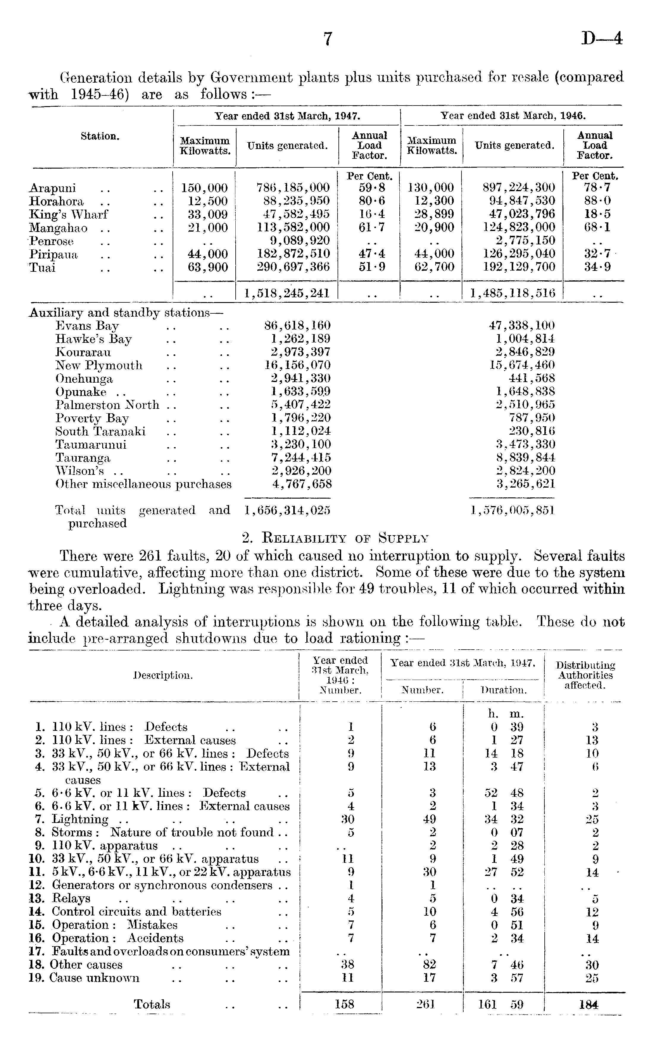 Auxiliary and standby stations — Evans Bay .. .. 86,618,160 47,338,100 Hawke'sßay .. .. 1,262,189 1,004,814 Kourarau ' .. .. 2,973,397 2,846,829 New Plymouth .. .. 16,156,070 15,674,460 Onehunga .. .. 2,941,330 441,568 Opunake .. .. .. 1,633,59.9 1,648,838 Palmerston North .. .. 5,407,422 2,510,965 Poverty Bay .. .. 1,796,220 787,950 South Taranaki .. .. 1,112,024 230,816 Taumarunui .. .. 3,230,100 3,473,330 Tauranga .. .. 7,244,415 8,839,844 Wilson's .. .. .. 2,926,200 2,824,200 Other miscellaneous purchases 4,767,658 3,265,621 Total units generated and 1,656,314,025 1,576,005,851 purchased' 2. Reliability of Supply There were 261 faults, 20 of which caused no interruption to supply. Several faults were cumulative, affecting more than one district. Some of these were due to the system being overloaded. Lightning was responsible for 49 troubles, 11 of which occurred within three days. A detailed analysis of interruptions is shown on the following table. These do not include pre-arranged shutdowns due to load rationing :
