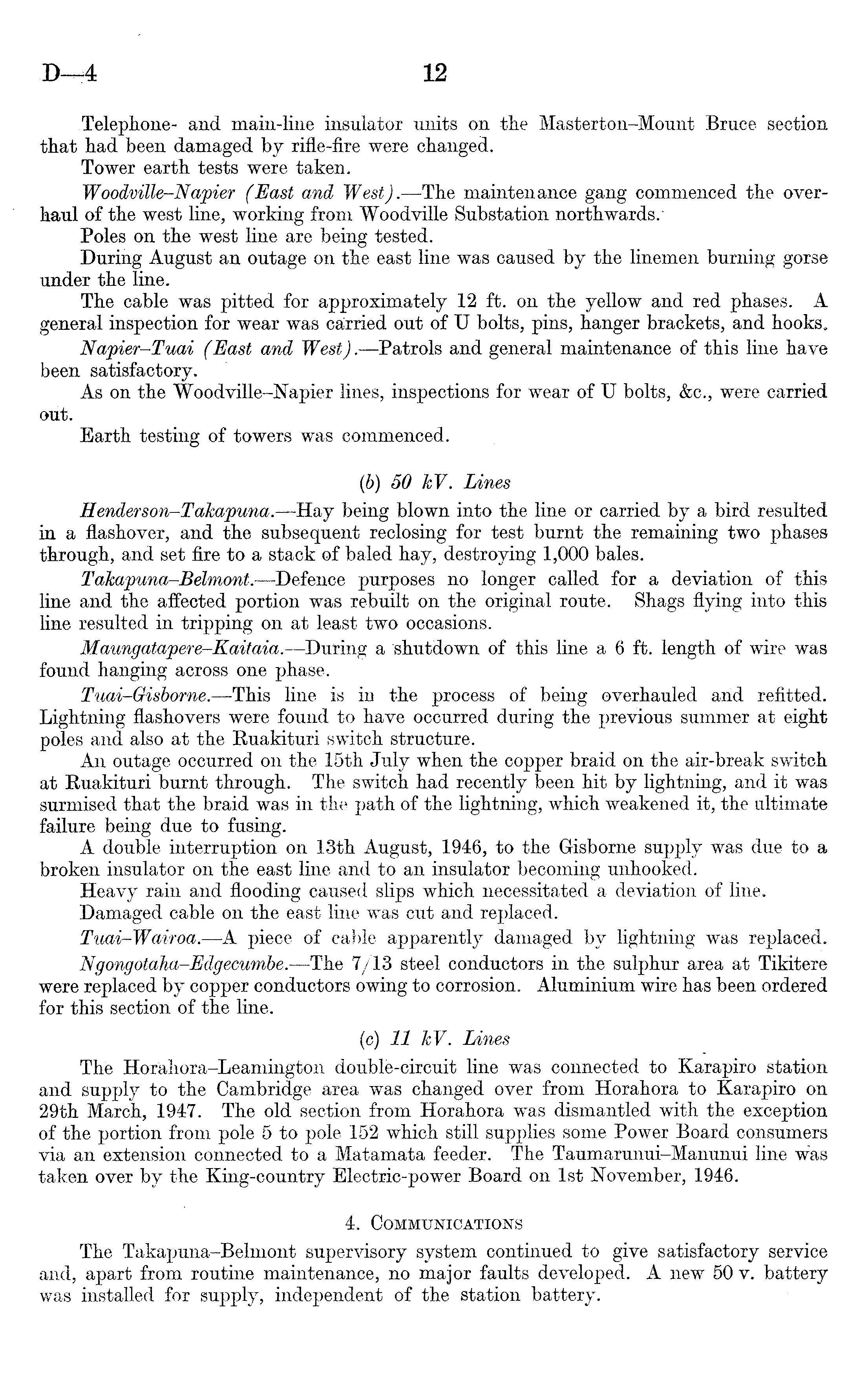 Telephone- and main-line insulator units on tlie Masterton-Mount Bruce section that had been damaged by rifle-fire were changed, Tower earth tests were taken. Woodville-Napier (East and West). —The maintenance gang commenced the overhaul of the west line, working from Woodville Substation northwards. Poles on the west line are being tested. During August an outage on the east line was caused by the linemen burning gorse under the line. The cable was pitted for approximately 12 ft. on the yellow and red phases. A general inspection for wear was carried out of U bolts, pins, hanger brackets, and hooks. Napier-Tuai (East and West). —Patrols and general maintenance of this line have been satisfactory. As on the Woodville-Napier lines, inspections for wear of U bolts, &c., were carried out. Earth testing of towers was commenced. (b) 50 kV. Lines Henderson-Takapuna.—Hay being blown into the line or carried by a bird resulted in a flashover, and the subsequent reclosing for test burnt the remaining two phases through, and set fire to a stack of baled hay, destroying 1,000 bales. Takapuna-Belmont.—Defence purposes no longer called for a deviation of this line and the affected portion was rebuilt on the original route. Shags flying into this line resulted in tripping on at least two occasions. Maungatapere-Kaitaia.—During a "shutdown of this line a 6 ft. length of wire was found hanging across one phase. Tuai-Gisborne.—This line is in the process of being overhauled and refitted. Lightning flashovers were found to have occurred during the previous summer at eight poles and also at the Ruakituri switch structure. An outage occurred on the 15th July when the copper braid on the air-break switch at Ruakituri burnt through. The switch had recently been hit by lightning, and it was surmised that the braid was in the path of the lightning, which weakened it, the ultimate failure being due to fusing. A double interruption on 13th August, 1946, to the G-isborne supply was due to a broken insulator on the east line and to an insulator becoming unhooked. Heavy rain and flooding caused slips which necessitated a deviation of line. Damaged cable on the east line was cut and replaced. Tuai-Wairoa.—A piece of cable apparently damaged by lightning was replaced. Ngongotaha-Edgecumbe.—The 7/13 steel conductors in the sulphur area at Tikitere were replaced by copper conductors owing to corrosion. Aluminium wire has been ordered for this section of the line. (c) 11 kV. Lines The Horahora-Leamington double-circuit line was connected to Karapiro station and supply to the Cambridge area was changed over from Horahora to Karapiro on 29th March, 1947. The old section from Horahora was dismantled with the exception of the portion from pole 5 to pole 152 which still supplies some Power Board consumers via an extension connected to a Matamata feeder. The Taumarunui-Manunui line was taken over by the King-country Electric-power Board on Ist November, 1946. 4. Communications The Takapuna-Belmont supervisory system continued to give satisfactory service and, apart from routine maintenance, no major faults developed. A new 50 v. battery was installed for supply, independent of the station battery.