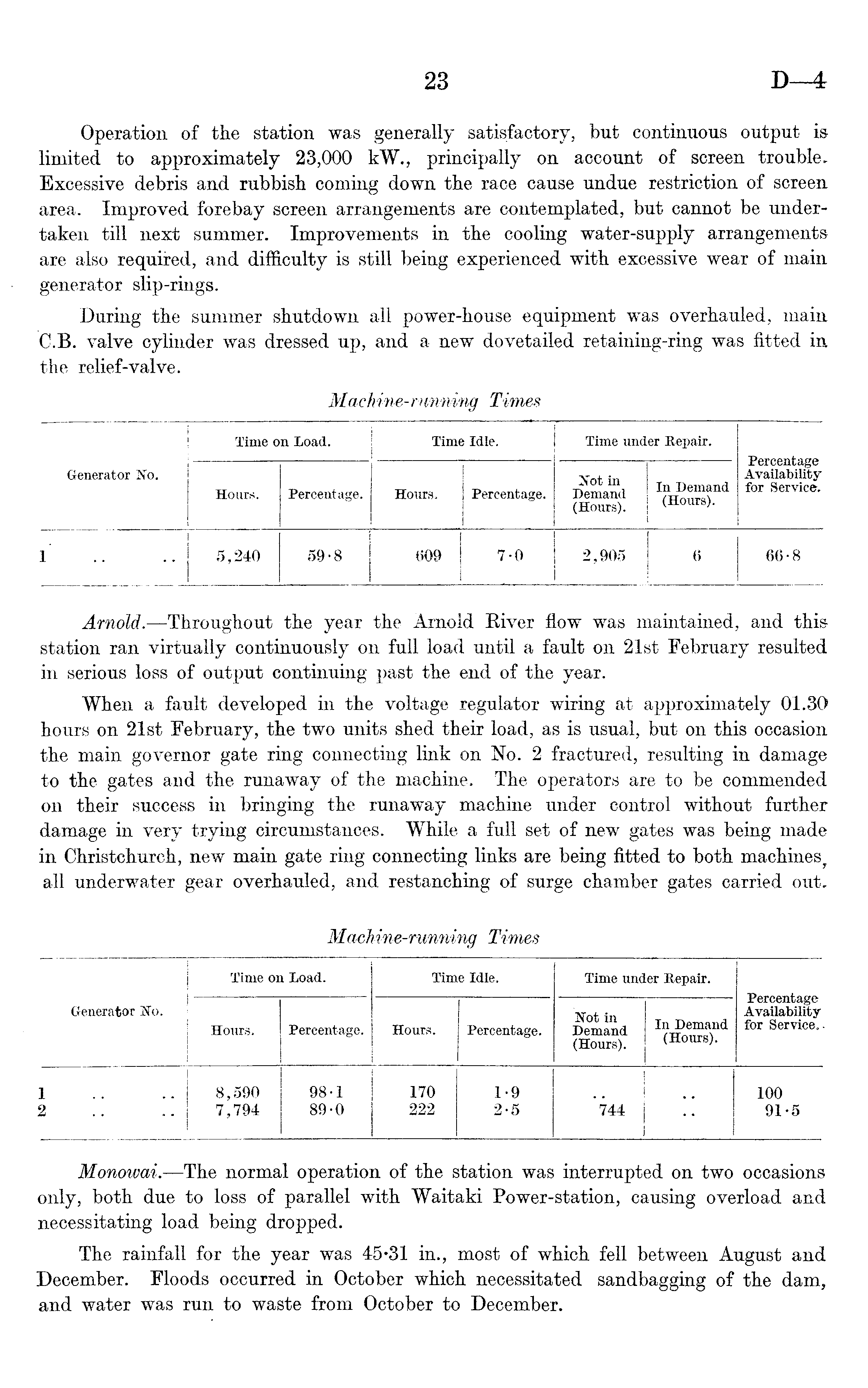 Monowai. —The normal operation of the station was interrupted on two occasions only, both due to loss of parallel with Waitaki Power-station, causing overload and necessitating load being dropped. The rainfall for the year was 45*31 in., most of which fell between August and December. Floods occurred in October which necessitated sandbagging of the dam, and water was run to waste from October to December.