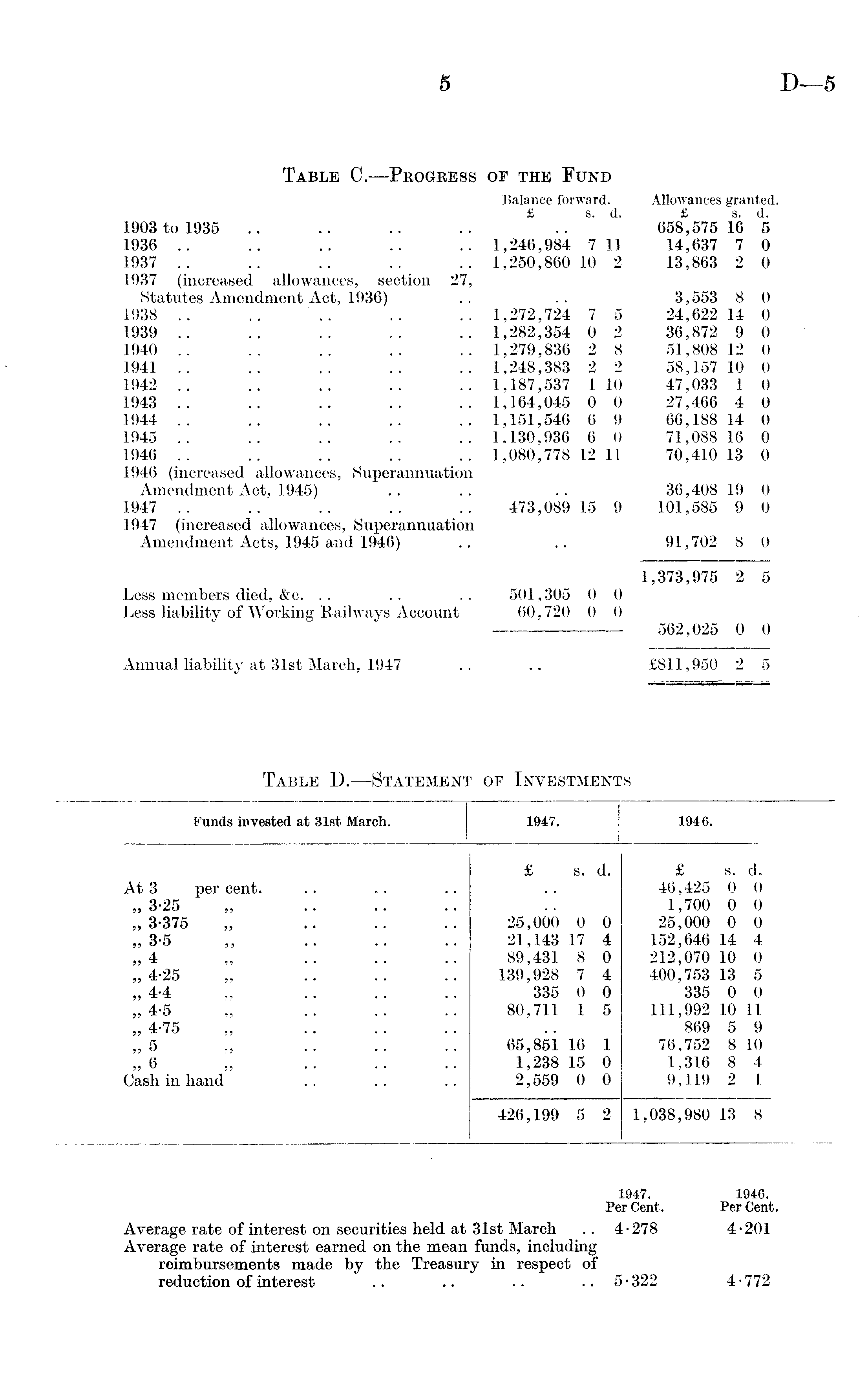 Table C.—Progress of the Fund Balance forward. Allowances granted. £ s. d. £ s. d. 1903 to 1935 .. .. .. .. .. 658,575 16 5 1936 .. .. .. .. .. 1,246,984 711 14,637 7 0 1937 .. .. .. .. .. 1,250,860 10 2 13,863 2 0 1937 (increased allowances, section 27, Statutes Amendment Act, 1936) .. .. 3,553 8 0 1938 .. .. .. .. .. 1,272,724 7 5 24,622 14 0 1939 .. .. .. .. .. 1,282,354 0 2 36,872 9 0 1940 .. .. .. .. .. 1,279,836 2 8 51,808 12 0 1941 .. .. .. .. .. 1,248,383 22 58,157 10 0 1942 .. .. .. .. .. 1,187,537 1 10 47,033 1 0 1943 .. .. .. .. .. 1,164,045 0 0 27,466 4 0 1944 .. .. .. .. .. 1,151,546 6 9 66,188 14 0 1945 .. .. .. .. .. 1,130,936 6 0 71,088 16 0 1946 .. .. .. .. .. 1,080,778 12 11 70,410 13 0 1946 (increased allowances, Superannuation Amendment Act, 1945) .. .. .. 36,408 19 0 1947 .. .. .. .. .. 473,089 15 9 101,585 9 0 1947 (increased allowances, Superannuation Amendment Acts, 1945 and 1946) .. .. 91,702 8 0 1,373,975 2 5 Less members died, &c. . . .. .. 501,305 0 0 Less liability of Working Railways Account 60,720 0 0 562,025 0 0 Annual liability at 31st March, 1947 .. .. £811,950 2 5