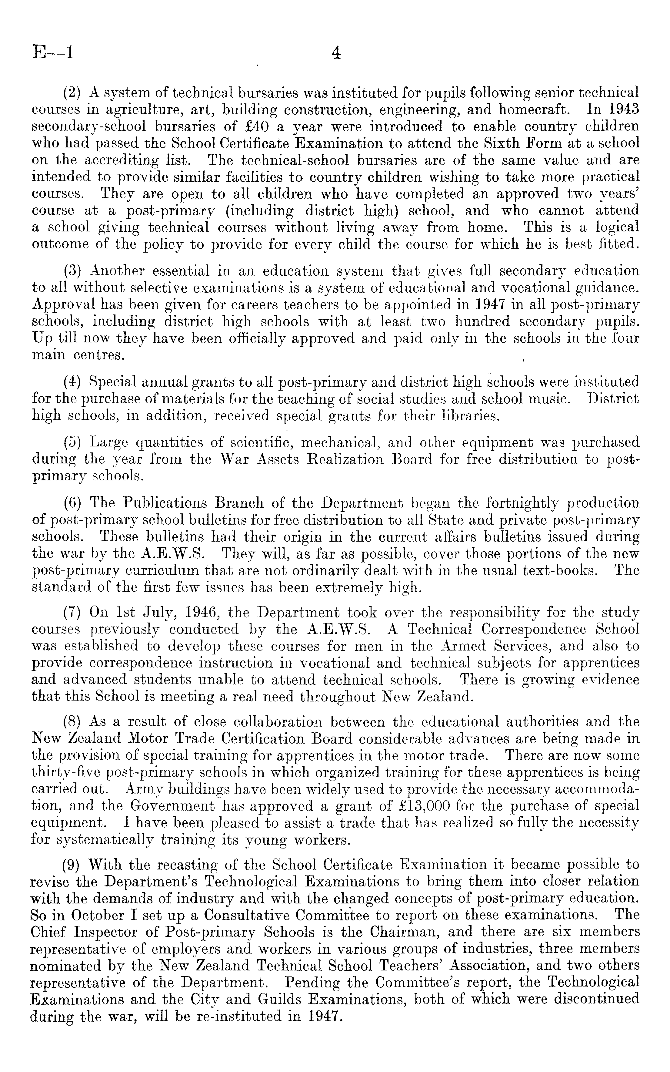 (2) A system of technical bursaries was instituted for pupils following senior technical courses in agriculture, art, building construction, engineering, and homecraft. In 1943 secondary-school bursaries of £4O a year were introduced to enable country children who had passed the School Certificate Examination to attend the Sixth Form at a school on the accrediting list. The technical-school bursaries are of the same value and are intended to provide similar facilities to country children wishing to take more practical courses. They are open to all children who have completed an approved two years' course at a post-primary (including district high) school, and who cannot attend a school giving technical courses without living away from home. This is a logical outcome of the policy to provide for every child the course for which he is best fitted. (3) Another essential in an education system that gives full secondary education to all without selective examinations is a system of educational and vocational guidance. Approval has been given for careers teachers to be appointed in 1947 in all post-primary schools, including district high schools with at least two hundred secondary pupils. Up till now they have been officially approved and paid only in the schools in the four main centres. (4) Special annual grants to all post-primary and district high schools were instituted for the purchase of materials for the teaching of social studies and school music. District high schools, in addition, received special grants for their libraries. (5) Large quantities of scientific, mechanical, and other equipment was purchased during the year from the War Assets Realization Board for free distribution to postprimary schools. (6) The Publications Branch of the Department began the fortnightly production of post-primary school bulletins for free distribution to all State and private post-primary schools. These bulletins had their origin in the current affairs bulletins issued during the war by the A.E.W.S. They will, as far as possible, cover those portions of the new post-primary curriculum that are not ordinarily dealt with in the usual text-books. The standard of the first few issues has been extremely high. (7) On Ist July, 1946, the Department took over the responsibility for the study courses previously conducted by the A.E.W.S. A Technical Correspondence School was established to develop these courses for men in the Armed Services, and also to provide correspondence instruction in vocational and technical subjects for apprentices and advanced students unable to attend technical schools. There is growing evidence that this School is meeting a real need throughout New Zealand. (8) As a result of close collaboration between the educational authorities and the New Zealand Motor Trade Certification Board considerable advances are being made in the provision of special training for apprentices in the motor trade. There are now some thirty-five post-primary schools in which organized training for these apprentices is being carried out. Army buildings have been widely used to provide the necessary accommodation, and the Government has approved a grant of £13,000 for the purchase of special equipment. I have been pleased to assist a trade that has realized so fully the necessity for systematically training its young workers. (9) With the recasting of the School Certificate Examination it became possible to revise the Department's Technological Examinations to bring them into closer relation with the demands of industry and with the changed concepts of post-primary education. So in October I set up a Consultative Commit'tee to report on these examinations. The Chief Inspector of Post-primary Schools is the Chairman, and there are six members representative of employers and workers in various groups of industries, three members nominated by the New Zealand Technical School Teachers' Association, and two others representative of the Department. Pending the Committee's report, the Technological Examinations and the City and Guilds Examinations, both of which were discontinued during the war, will be re-instituted in 1947.