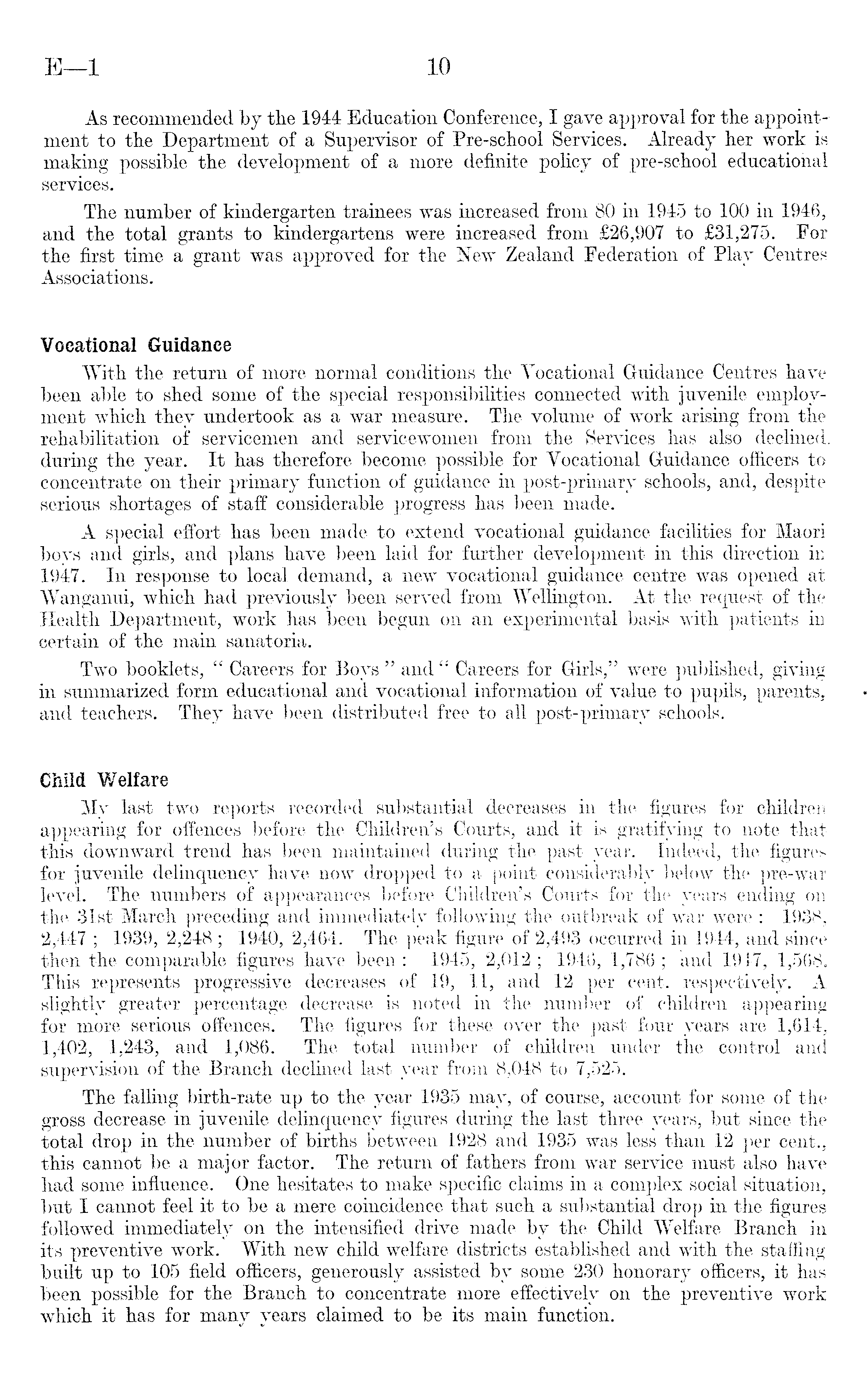 As recommended by the 1944 Education Conference, I gave approval for the appointment to the Department of a Supervisor of Pre-school Services. Already her work is making possible the development of a more definite policy of pre-school educational services. The number of kindergarten trainees was increased from 80 in 1945 to 100 in 1946, and the total grants to kindergartens were increased from £26,907 to £31,275. For the first time a grant was approved for the New Zealand Federation of Play Centres Associations. Vocational Guidance With the return of more normal conditions the Vocational Guidance Centres havebeen able to shed some of the special responsibilities connected with juvenile employment which they undertook as a war measure. The volume of work arising from the rehabilitation of servicemen and servicewomen from the Services has also declined, during the year. It has therefore become possible for Vocational Guidance officers to concentrate on their primary function of guidance in post-primary schools, and, despite serious shortages of staff considerable progress has been made. A special effort has been made to extend vocational guidance facilities for Maori boys and girls, and plans have bfeen laid for further development in this direction in 1947. In response to local demand, a new vocational guidance centre was opened at Wanganui, which had previously been served from Wellington. At the request of the Health Department, work has been begun on an experimental basis with patients in certain of the main sanatoria. Two booklets, " Careers for Boys " and " Careers for Girls," were published, giving in summarized form educational and vocational information of value to pupils, parents, and teachers. They have been distributed free to all post-primary schools. Child Welfare My last two reports recorded substantial decreases in the figures for children appearing for offences before the Children's Courts, and it is gratifying to note that this downward trend has been maintained during the past year. Indeed, the figures for juvenile delinquency have now dropped to a point considerably below the pre-war level. The numbers of appearances before Children's Courts for the years ending on the 31st March preceding and immediately following the outbreak of war were : 1938,. 2,447 ; 1939, 2,248 ; 1940, 2,464. The peak figure of 2,493 occurred in 1944, and since then the comparable figures have been : 1945, 2,012 ; 1946, 1,786 ; and 1947, 1,568, This represents progressive decreases of 19, 11, and 12 per cent, respectively. A slightly greater percentage decrease is noted in the number of children appearing for more serious offences. The figures for these over the past four years are 1,614, 1,402, 1,243, and 1,086. The total number of children under the control and supervision of the Branch declined last year from 8,048 to 7,525. The falling birth-rate up to the year 1935 may, of course, account for some of the gross decrease in juvenile delinquency figures during the last three years, but since the total drop in the number of births between 1928 and 1935 was less than 12 per cent., this cannot be a major factor. The return of fathers from war service must also have had some influence. One hesitates to make specific claims in a complex social situation, but I cannot feel it to be a mere coincidence that such a substantial drop in the figures followed immediately on the intensified drive made by the Child Welfare Branch in its preventive work. With new child welfare districts established and with the staffing built up to 105 field officers, generously assisted by some 230 honorary officers, it has been possible for the Branch to concentrate more effectively on the preventive work which it has for many years claimed to be its main function.