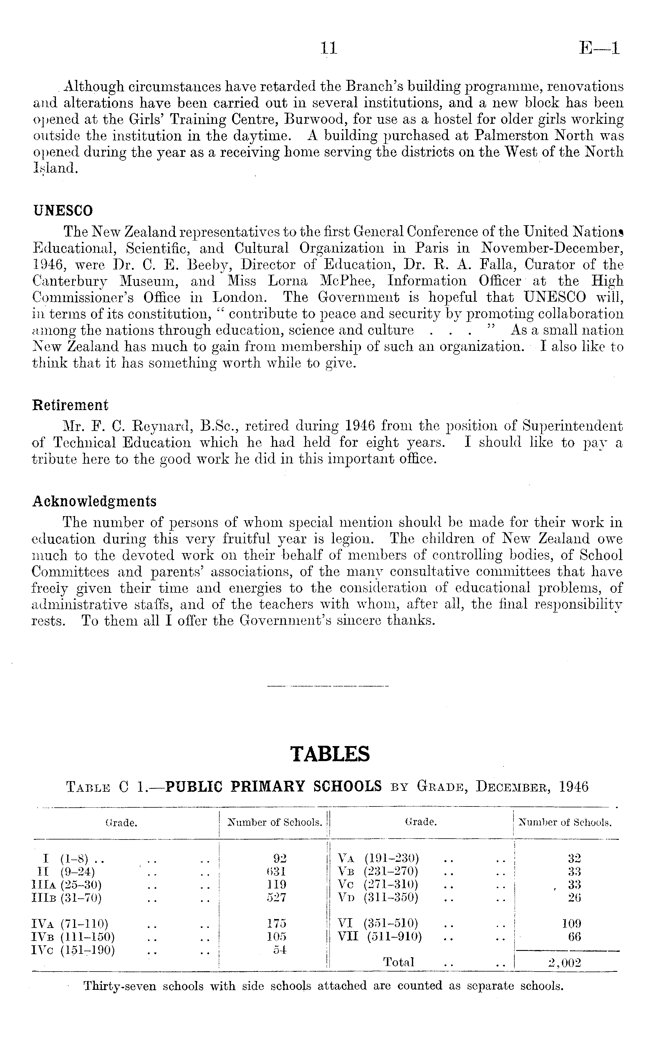 Although circumstances have retarded the Branch's building programme, renovations and alterations have been carried out in several institutions, and a new block has been opened at the Girls' Training Centre, Burwood, for use as a hostel for older girls working outside the institution in the daytime. A building purchased at Palmerston North was opened during the year as a receiving home serving the districts on the West of the North Island. UNESCO The New Zealand representatives to the first General Conference of the United Nations Educational, Scientific, and Cultural Organization in Paris in November-December, 1946, were Dr. C. E. Beeby, Director of Education, Dr. R. A. Falla, Curator of the Canterbury Museum, and Miss Lorna McPhee, Information Officer at the High Commissioner's Office in London. The Government is hopeful that UNESCO will, in terms of its constitution, " contribute to peace and security by promoting collaboration among the nations through education, science and culture . . . " As a small nation New Zealand has much to gain from membership of such an organization. I also like to think that it has something worth while to give. Retirement Mr. F. C. Reynard, B.Se., retired during 1946 from the position of Superintendent of Technical Education which he had held for eight years. I should like to pay a tribute here to the good work he did in this important office. Acknowledgments The number of persons of whom special mention should be made for their work in education during this very fruitful year is legion. The children of New Zealand owe much to the devoted work on their behalf of members of controlling bodies, of School Committees and parents' associations, of the many consultative committees that have freely given their time and energies to the consideration of educational problems, of administrative staffs, and of the teachers with whom, after all, the final responsibility rests. To them all I offer the Government's sincere thanks.