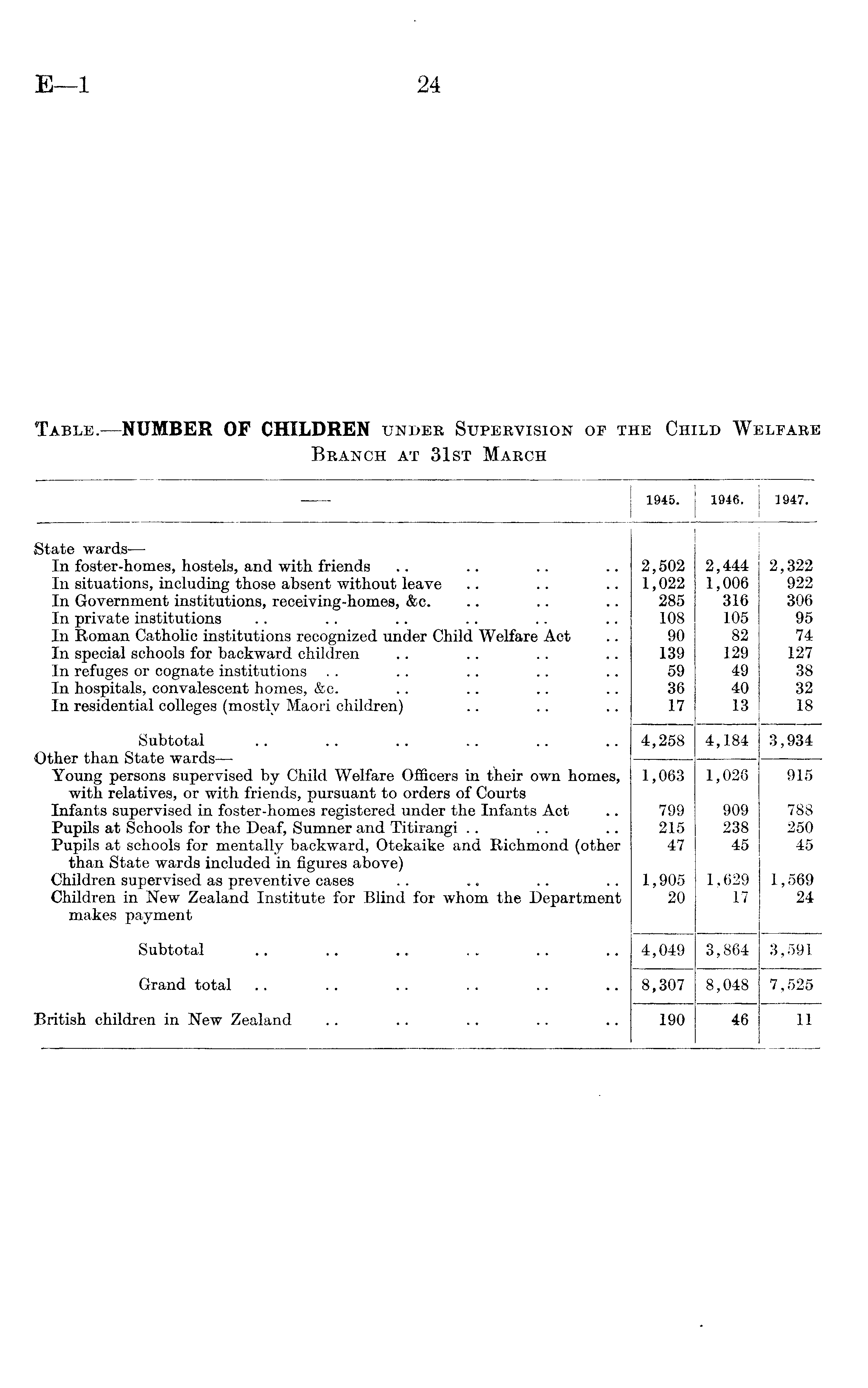 — 1945. 1946. | 1947. | State wards — In foster-homes, hostels, and with friends In situations, including those absent without leave In Government institutions, receiving-homes, &c. In private institutions In Roman Catholic institutions recognized under Child Welfare Act In special schools for backward children In refuges or cognate institutions In hospitals, convalescent homes, &c. In residential colleges (mostly Maori children) Subtotal Other than State wards — Young persons supervised by Child Welfare Officers in their own homes, with relatives, or with friends, pursuant to orders of Courts Infants supervised in foster-homes registered under the Infants Act Pupils at Schools for the Deaf, Sumner and Titirangi Pupils at schools for mentally backward, Otekaike and Richmond (other than State wards included in figures above) Children supervised as preventive cases Children in New Zealand Institute for Blind for whom the Department makes payment Subtotal Grand total British children in New Zealand 2,502 1,022 285 108 90 139 59 36 17 2,444 1,006 316 105 82 129 49 40 13 2,322 922 306 95 74 127 38 32 18 4,258 4,184 3,934 1,063 799 215 47 1,905 20 1,028 909 238 45 1.629 17 915 788 250 45 1,569 24 4,049 3,864 3,591 8,307 8,048 7,525 190 46 11