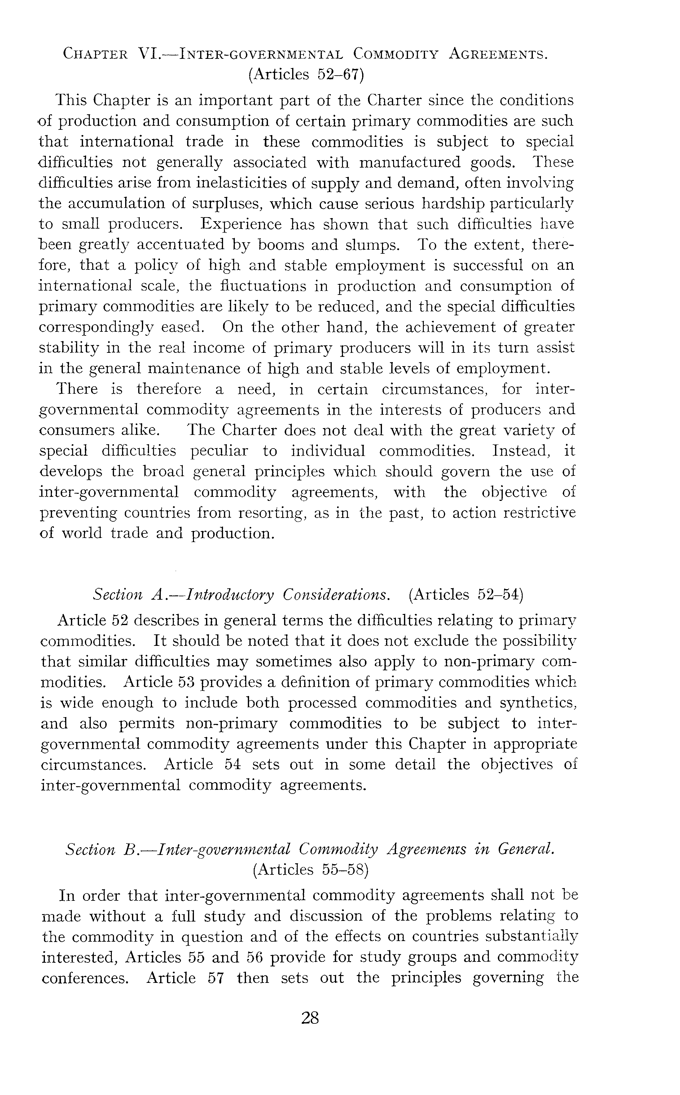 Chapter VI. —Inter-governmental Commodity Agreements. (Articles 52-67) This Chapter is an important part of the Charter since the conditions of production and consumption of certain primary commodities are such that international trade in these commodities is subject to special difficulties not generally associated with manufactured goods. These difficulties arise from inelasticities of supply and demand, often involving the accumulation of surpluses, which cause serious hardship particularly to small producers. Experience has shown that such difficulties have been greatly accentuated by booms and slumps. To the extent, therefore, that a policy of high and stable employment is successful on an international scale, the fluctuations in production and consumption of primary commodities are likely to be reduced, and the special difficulties correspondingly eased. On the other hand, the achievement of greater stability in the real income of primary producers will in its turn assist in the general maintenance of high and stable levels of employment. There is therefore a need, in certain circumstances, for intergovernmental commodity agreements in the interests of producers and consumers alike. The Charter does not deal with the great variety of special difficulties peculiar to individual commodities. Instead, it develops the broad general principles which should govern the use of inter-governmental commodity agreements, with the objective of preventing countries from resorting, as in the past, to action restrictive of world trade and production. Section A. —Introductory Considerations. (Articles 52-54) Article 52 describes in general terms the difficulties relating to primary commodities. It should be noted that it does not exclude the possibility that similar difficulties may sometimes also apply to non-primary commodities. Article 53 provides a definition of primary commodities which is wide enough to include both processed commodities and synthetics, and also permits non-primary commodities to be subject to intergovernmental commodity agreements under this Chapter in appropriate circumstances. Article 54 sets out in some detail the objectives of inter-governmental commodity agreements. Section B. —Inter-governmental Commodity Agreements in General. (Articles 55-58) In order that inter-governmental commodity agreements shall not be made without a full study and discussion of the problems relating to the commodity in question and of the effects on countries substantially interested, Articles 55 and 56 provide for study groups and commodity conferences. Article 57 then sets out the principles governing the