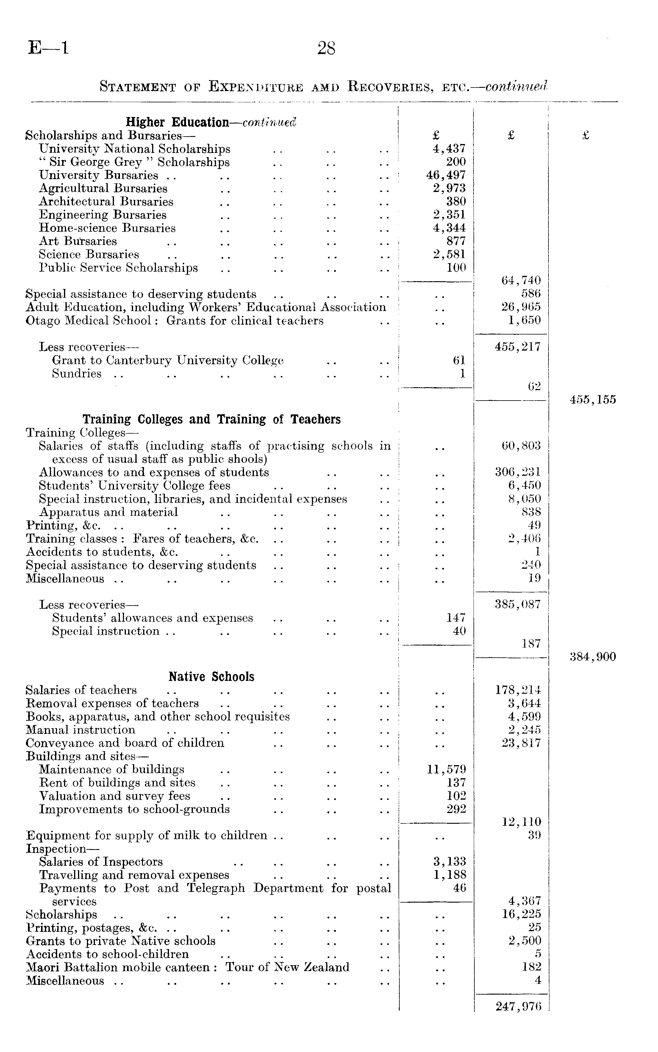Higher Education —continued Scholarships and Bursaries— University National Scholarships " Sir George Grey " Scholarships University Bursaries Agricultural Bursaries .. .. Architectural Bursaries Engineering Bursaries Home-science Bursaries Art Butsaries Science Bursaries Public Service Scholarships £ 4,437 200 46,497 2,973 380 2,351 4,344 877 2,581 100 1 £ 64,740 586 26,965 1,650 £ Special assistance to deserving students Adult Education, including Workers' Educational Association Otago Medical School: Grants for clinical teachers Less recoveries— Grant to Canterbury University College .. Sundries .. .. .. .. .. .. 61 1 455,217 62 455,155 Training Colleges and Training of Teachers Training Colleges— Salaries of staffs (including staffs of practising schools in excess of usual staff as public shools) Allowances to and expenses of students Students' University College fees Special instruction, libraries, and incidental expenses Apparatus and material Printing, &c. Training classes : Fares of teachers, &c. .. Accidents to students, &c. Special assistance to deserving students Miscellaneous 60,803 306,231 6,450 8,050 838 49 2,406 1 240 19 Less recoveries— Students' allowances and expenses Special instruction 147 40 385,087 187 384,900 Native Schools Salaries of teachers Removal expenses of teachers Books, apparatus, and other school requisites Manual instruction Conveyance and board of children Buildings and sites— Maintenance of buildings Rent of buildings and sites Valuation and survey fees Improvements to school-grounds 11,579 137 102 292 178,214 3,644 4,599 2,245 23,817 12,110 39 4,367 16,225 25 2,500 5 182 4 Equipment for supply of milk to children .. .. Inspection— Salaries of Inspectors .. .. .. Travelling and removal expenses .. .. Payments to Post and Telegraph Department for postal services Scholarships Printing, postages, &c. Grants to private Native schools Accidents to school-children Maori Battalion mobile canteen : Tour of New Zealand Miscellaneous 3,133 1,188 46 247,976