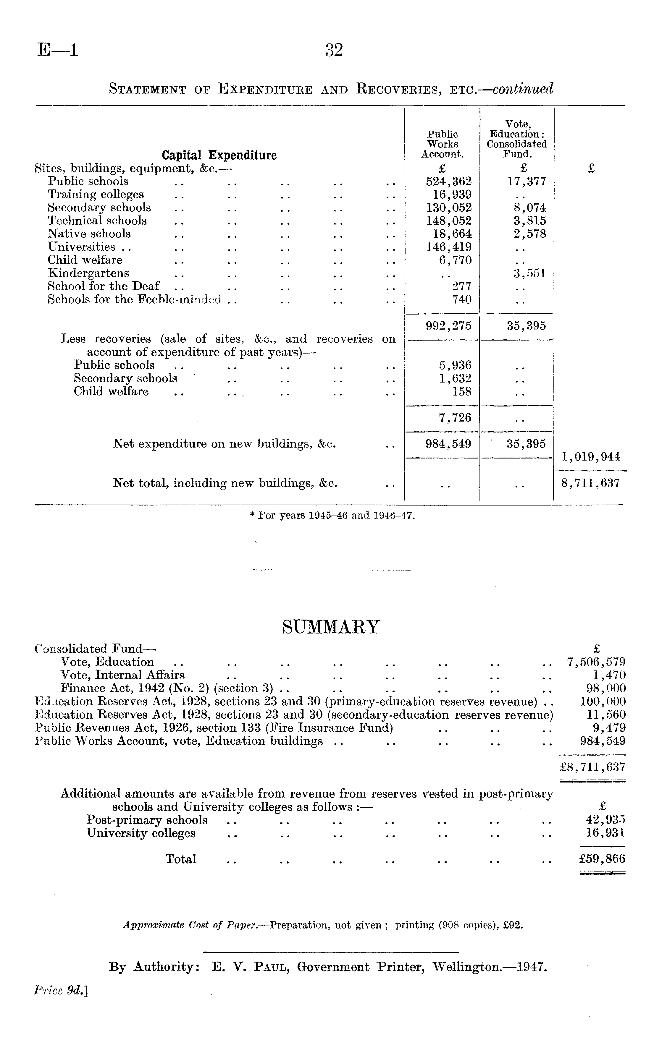 SUMMARY Consolidated Fund— £ Vote, Education .. .. .. .. .. .. .. .. 7,506,579 Vote, Internal Affairs .. .. .. .. .. .. .. 1,470 Finance Act, 1942 (No. 2) (section 3) .. .. .. .. .. .. 98,000 Education Reserves Act, 1928, sections 23 and 30 (primary-education reserves revenue) .. 100,000 Education Reserves Act, 1928, sections 23 and 30 (secondary-education reserves revenue) 11,560 Public Revenues Act, 1926, section 133 (Fire Insurance Fund) .. .. .. 9,479 Public Works Account, vote, Education buildings .. .. .. .. .. 984,549 £8,711,637 Additional amounts are available from revenue from reserves vested in post-primary schools and University colleges as follows : £ Post-primary schools .. .. .. .. .. .. .. 42,935 University colleges .. .. .. .. .. .. .. 16,931 Total .. .. .. .. .. .. .. £59,866