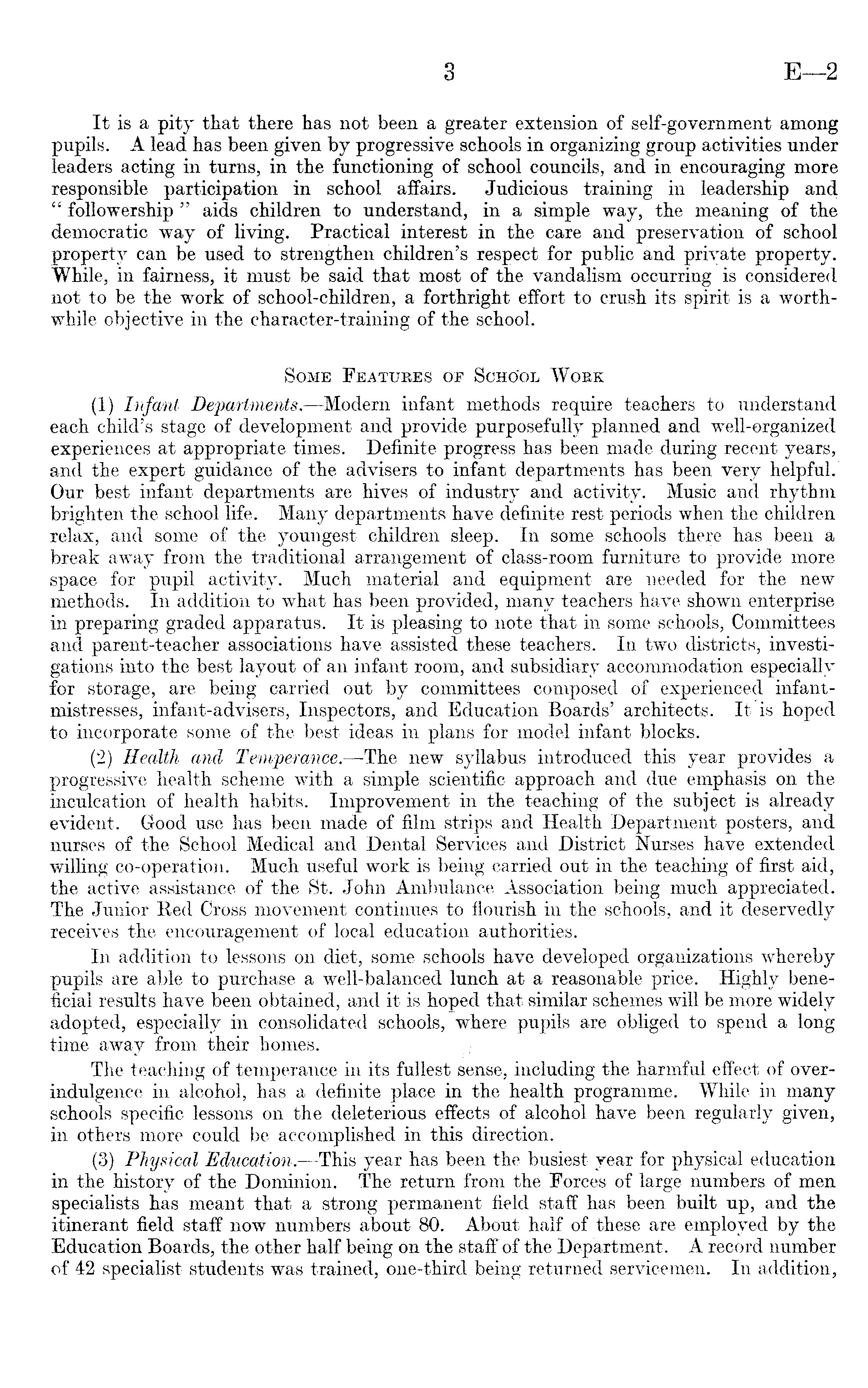 It is a pity that there has not been a greater extension of self-government among pupils. A lead has been given by progressive schools in organizing group activities under leaders acting in turns, in the functioning of school councils, and in encouraging more responsible participation in school affairs. Judicious training in leadership and " folio wership " aids children to understand, in a simple way, the meaning of the democratic way of living. Practical interest in the care and preservation of school property can be used to strengthen children's respect for public and private property. While, in fairness, it must be said that most of the vandalism occurring is considered not to be the work of school-children, a forthright effort to crush its spirit is a worthwhile objective in the character-training of the school. Some Features of School Work (1) Infant Departments. —-Modern infant methods require teachers to understand each child's stage of development and provide purposefully planned and well-organized experiences at appropriate times. Definite progress has been made during recent years, and the expert guidance of the advisers to infant departments has been very helpful. Our best infant departments are hives of industry and activity. Music and rhythm brighten the school life. Many departments have definite rest periods when the children relax, and some of the youngest children sleep. In some schools there has been a break away from the traditional arrangement of class-room furniture to provide more space for pupil activity. Much material and equipment are needed for the new methods. In addition to what has been provided, many teachers have shown enterprise in preparing graded apparatus. It is pleasing to note that in some schools, Committees and parent-teacher associations have assisted these teachers. In two districts, investigations into the best layout of an infant room, and subsidiary accommodation especially for storage, are being carried out by committees composed of experienced infantmistresses, infant-advisers, Inspectors, and Education Boards' architects. It is hoped to incorporate some of the best ideas in plans for model infant blocks. (2) Health and Temperance.—The new syllabus introduced this year provides a progressive health scheme with a simple scientific approach and due emphasis on the inculcation of health habits. Improvement in the teaching of the subject is already evident. Good use has been made of film strips and Health Department posters, and nurses of the School Medical and Dental Services and District Nurses have extended willing co-operation. Much useful work is being carried out in the teaching of first aid, the active assistance of the St. John Ambulance Association being much appreciated. The Junior Red Cross movement continues to flourish in the schools, and it deservedly receives the encouragement of local education authorities. In addition to lessons on diet, some schools have developed organizations whereby pupils are able to purchase a well-balanced lunch at a reasonable price. Highly beneficial results have been obtained, and it is hoped that similar schemes will be more widely adopted, especially in consolidated schools, where pupils are obliged to spend a long time away from their homes. The teaching of temperance in its fullest sense, including the harmful effect of overindulgence in alcohol, has a definite place in the health programme. While in many schools specific lessons on the deleterious effects of alcohol have been regularly given, in others more could be accomplished in this direction. (3) Physical Education. —This year has been the busiest year for physical education in the history of the Dominion. The return from the Forces of large numbers of men specialists has meant that a strong permanent field staff has been built up, and the itinerant field staff now numbers about 80. About half of these are employed by the Education Boards, the other half being on the staff of the Department. A record number of 42 specialist students was trained, one-third being returned servicemen. In addition,