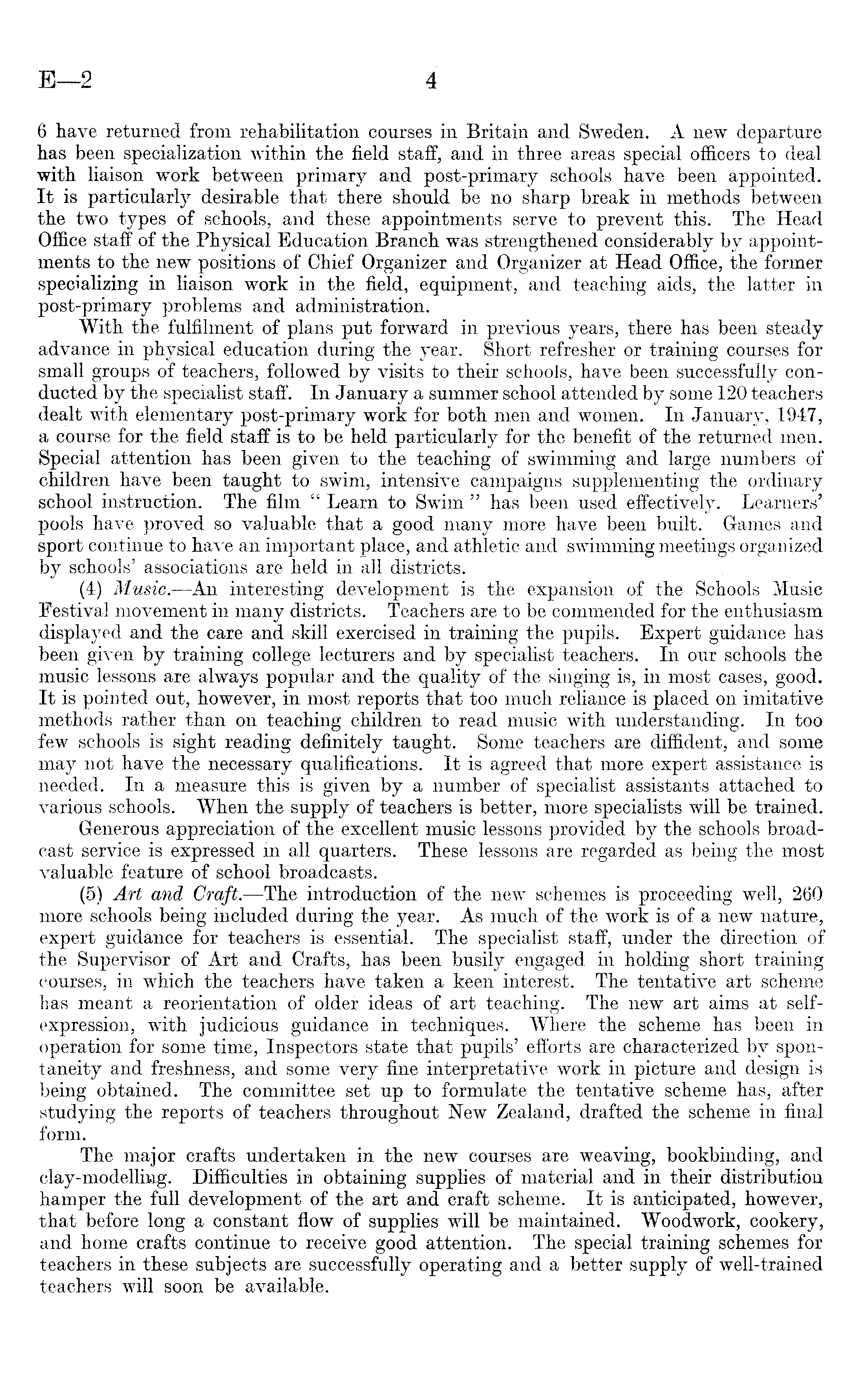 6 have returned from rehabilitation courses in Britain and Sweden. A new departure has been specialization within the field staff, and in three areas special officers to deal with liaison work between primary and post-primary schools have been appointed. It is particularly desirable that there should be no sharp break in methods between the two types of schools, and these appointments serve to prevent this. The Head Office staff of the Physical Education Branch was strengthened considerably by appointments to the new positions of Chief Organizer and Organizer at Head Office, the former specializing in liaison work in the field, equipment, and teaching aids, the latter in post-primary problems and administration. With the fulfilment of plans put forward in previous years, there has been steady advance in physical education during the year. Short refresher or training courses for small groups of teachers, followed by visits to their schools, have been successfully conducted by the specialist staff. In January a summer school attended by some 120 teachers dealt with elementary post-primary work for both men and women. In January, 1947, a course for the field staff is to be held particularly for the benefit of the returned men. Special attention has been given to the teaching of swimming and large numbers of children have been taught to swim, intensive campaigns supplementing the ordinary school instruction. The film " Learn to Swim " has been used effectively. Learners' pools have proved so valuable that a good many more have been built. Games and sport continue to have an important place, and athletic and swimming meetings organized by schools' associations are held in all districts. (4) Music. —An interesting development is the expansion of the Schools Music Festival movement in many districts. Teachers are to be commended for the enthusiasm displayed and the care and skill exercised in training the pupils. Expert guidance has been given by training college lecturers and by specialist teachers. In our schools the music lessons are always popular and the quality of the singing is, in most cases, good. It is pointed out, however, in most reports that too much reliance is placed on imitative methods rather than on teaching children to read music with understanding. In too few schools is sight reading definitely taught. Some teachers are diffident, and some may not have the necessary qualifications. It is agreed that more expert assistance is needed. In a measure this is given by a number of specialist assistants attached to various schools. When the supply of teachers is better, more specialists will be trained. Generous appreciation of the excellent music lessons provided by the schools broadcast service is expressed in all quarters. These lessons are regarded as being the most valuable feature of school broadcasts. (5) Art and Craft. —The introduction of the new schemes is proceeding well, 260 more schools being included during the year. As much of the work is of a new nature, expert guidance for teachers is essential. The specialist staff, under the direction of the Supervisor of Art and Crafts, has been busily engaged in holding short training courses, in which the teachers have taken a keen interest. The tentative art scheme has meant a reorientation of older ideas of art teaching. The new art aims at selfexpression, with judicious guidance in techniques. Where the scheme has been in operation for some time, Inspectors state that pupils' efforts are characterized by spontaneity and freshness, and some very fine interpretative work in picture and design is being obtained. The committee set up to formulate the tentative scheme has, after studying the reports of teachers throughout New Zealand, drafted the scheme in final form. The major crafts undertaken in the new courses are weaving, bookbinding, and clay-modelling. Difficulties in obtaining supplies of material and in their distribution hamper the full development of the art and craft scheme. It is anticipated, however, that before long a constant flow of supplies will be maintained. Woodwork, cookery, and home crafts continue to receive good attention. The special training schemes for teachers in these subjects are successfully operating and a better supply of well-trained teachers will soon be available.