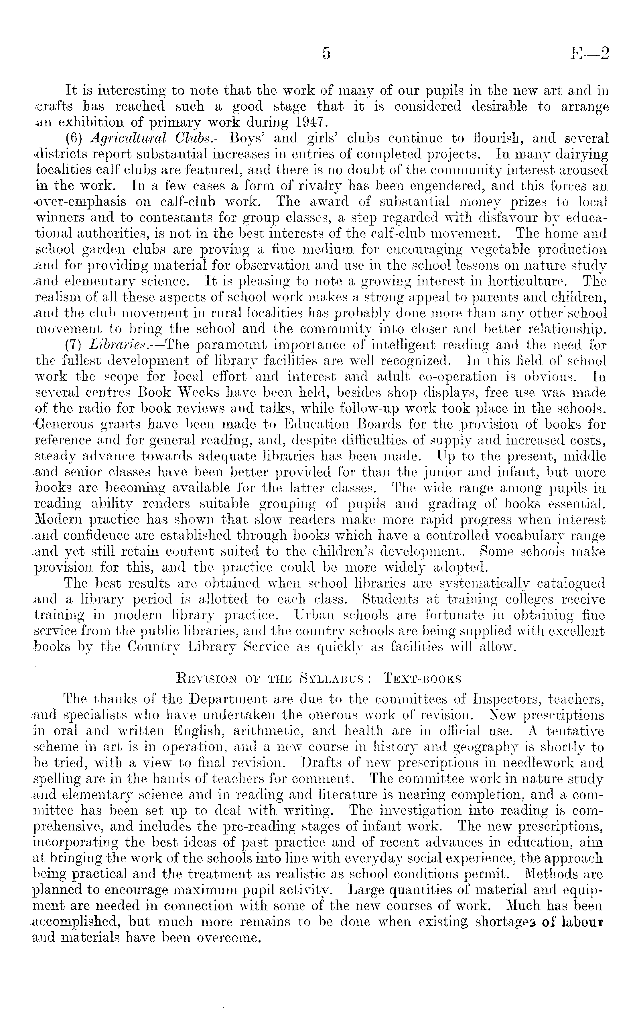 It is interesting to note that the work of many of our pupils in the new art and in «crafts has reached such a good stage that it is considered desirable to arrange .an exhibition of primary work during 1947. (6) Agricultural Clubs—Boys' and girls' clubs continue to flourish, and several •districts report substantial increases in entries of completed projects. In many dairying localities calf clubs are featured, and there is no doubt of the community interest aroused in the work. In a few cases a form of rivalry has been engendered, and this forces an over-emphasis on calf-club work. The award of substantial money prizes to local winners and to contestants for group classes, a step regarded with disfavour by educational authorities, is not in the best interests of the calf-club movement. The home and school garden clubs are proving a fine medium for encouraging vegetable production .and for providing material for observation and use in the school lessons on nature study .and elementary science. It is pleasing to note a growing interest in horticulture. The realism of all these aspects of school work makes a strong appeal to parents and children, .and the club movement in rural localities has probably done more than any other'school movement to bring the school and the community into closer and better relationship. (7) Libraries. —The paramount importance of intelligent reading and the need for the fullest development of library facilities are well recognized. In this field of school work the scope for local effort and interest and adult co-operation is obvious. In several centres Book Weeks have been held, besides shop displays, free use was made of the radio for book reviews and talks, while follow-up work took place in the schools: ■Generous grants have been made to Education Boards for the .provision of books for reference and for general reading, and, despite difficulties of supply and increased costs, steady advance towards adequate libraries has been made. Up to the present, middle .and senior classes have been better provided for than the junior and infant, but more books are becoming available for the latter classes. The wide range among pupils in reading ability renders suitable grouping of pupils and grading of books essential. Modern practice has shown that slow readers make more rapid progress when interest .and confidence are established through books which have a controlled vocabulary range .and yet still retain content suited to the children's development. Some schools make provision for this, and the practice could be more widely adopted. The best results are obtained when school libraries are systematically catalogued and a library period is allotted to each class. Students at training colleges receive training in modern library practice. Urban schools are fortunate in obtaining fine service from the public libraries, and the country schools are being supplied with excellent books by the Country Library Service as quickly as facilities will allow. Kevision of the Syllabus : Text-books The thanks of the Department are due to the committees of Inspectors, teachers, and specialists who have undertaken the onerous work of revision. New prescriptions in oral and written English, arithmetic, and health are in official use. A tentative scheme in art is in operation, and a new course in history and geography is shortly to be tried, with a view to final revision. Drafts of new prescriptions in needlework and spelling are in the hands of teachers for comment. The committee work in nature study .and elementary science and in reading and literature is nearing completion, and a committee has been set up to deal with writing. The investigation into reading is comprehensive, and includes the pre-reading stages of infant work. The new prescriptions, incorporating the best ideas of past practice and of recent advances in education, aim at bringing the work of the schools into line with everyday social experience, the approach being practical and the treatment as realistic as school conditions permit. Methods are planned to encourage maximum pupil activity. Large quantities of material and equipment are needed in connection with some of the new courses of work. Much has been .accomplished, but much more remains to be done when existing shortages of labour .and materials have been overcome.