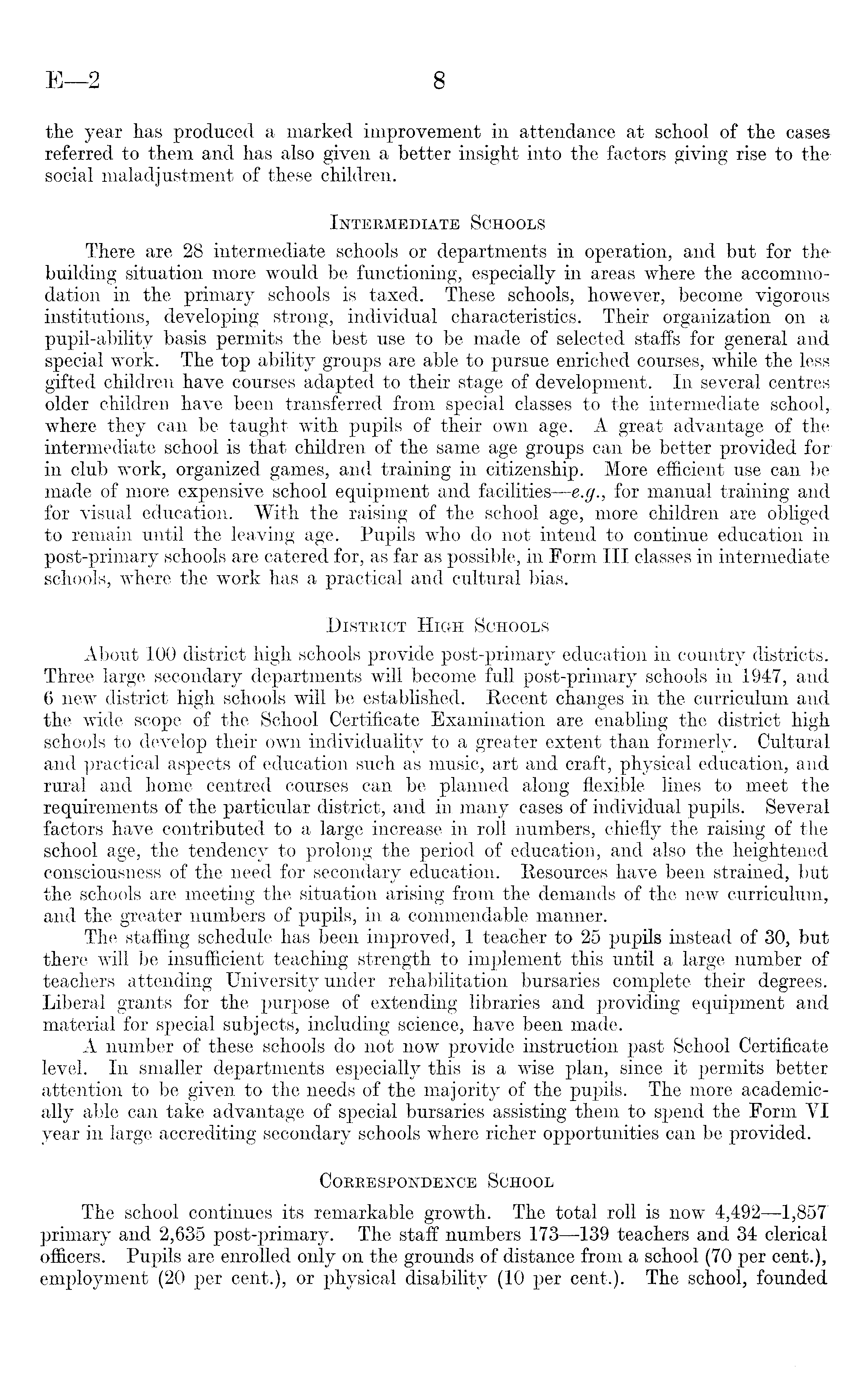 the year has produced a marked improvement in attendance at school of the cases referred to them and has also given a better insight into the factors giving rise to the social maladjustment of these children. Intermediate Schools There are 28 intermediate schools or departments in operation, and but for the building situation more would be functioning, especially in areas where the accommodation in the primary schools is taxed. These schools, however, become vigorous institutions, developing strong, individual characteristics. Their organization on a pupil-ability basis permits the best use to be made of selected staffs for general and special work. The top ability groups are able to pursue enriched courses, while the less gifted children have courses adapted to their stage of development. In several centres older children have been transferred from special classes to the intermediate school,, where they can be taught with pupils of their own age. A great advantage of the intermediate school is that children of the same age groups can be better provided for in club work, organized games, and training in citizenship. More efficient use can be made of more expensive school equipment and facilities —e.g., for manual training and for visual education. With the raising of the school age, more children are obliged to remain until the leaving age. Pupils who do not intend to continue education in post-primary schools are catered for, as far as possible, in Form 111 classes in intermediate schools, where the work has a practical and cultural bias. District High Schools About 100 district high schools provide post-primary education in country districts. Three large secondary departments will become full post-primary schools in 1947, and 6 new district high schools will be established. Recent changes in the curriculum and the wide scope of the School Certificate Examination are enabling the district high schools to develop their own individuality to a greater extent than formerly. Cultural and practical aspects of education such as music, art and craft, physical education, and rural and home centred courses can be planned along flexible lines to meet the requirements of the particular district, and in many cases of individual pupils. Several factors have contributed to a large increase in roll numbers, chiefly the raising of the school age, the tendency to prolong the period of education, and also the heightened consciousness of the need for secondary education. Resources have been strained, but the schools are meeting the situation arising from the demands of the new curriculum, and the greater numbers of pupils, in a commendable manner. The staffing schedule has been improved, 1 teacher to 25 pupils instead of 30, but there will be insufficient teaching strength to implement this until a large number of teachers attending University under rehabilitation bursaries complete their degrees. Liberal grants for the purpose of extending libraries and providing equipment and material for special subjects, including science, have been made. A number of these schools do not now provide instruction past School Certificatelevel. In smaller departments especially this is a wise plan, since it permits better attention to be given to the needs of the majority of the pupils. The more academically" able can take advantage of special bursaries assisting them to spend the Form VI year in large accrediting secondary schools where richer opportunities can be provided. Correspondence School The school continues its remarkable growth. The total roll is now 4,492 —1,857 primary and 2,635 post-primary. The staff numbers 173 —139 teachers and 34 clerical officers. Pupils are enrolled only on the grounds of distance from a school (70 per cent.),, employment (20 per cent.), or physical disability (10 per cent.). The school, founded