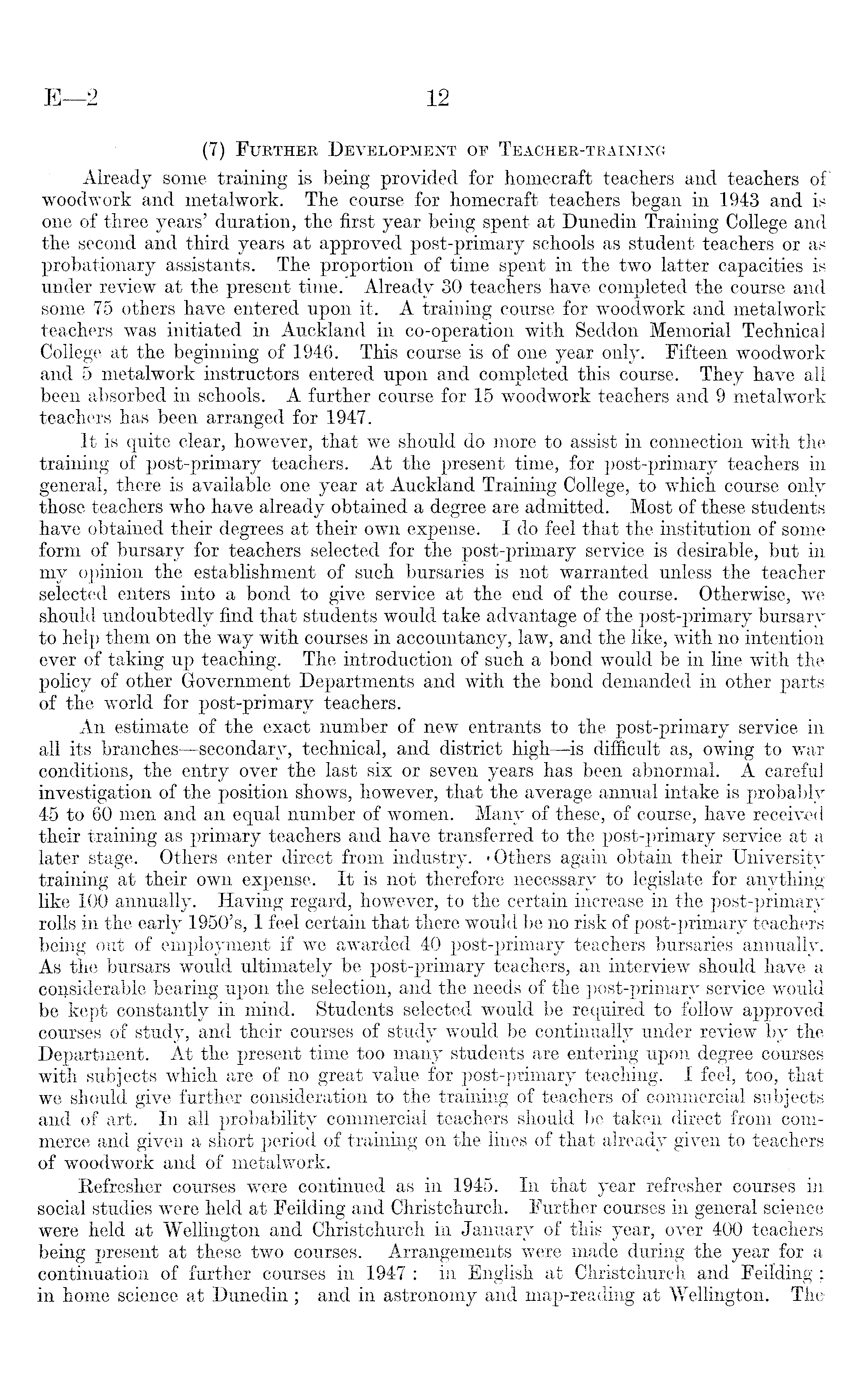 (7) Further Development op Teacher-training Already some training is being provided for homecraft teachers and teachers of woodwork and metalwork. The course for homecraft teachers began in 1943 and is one of three years' duration, the first year being spent at Dunedin Training College and the second and third years at approved post-primary schools as student teachers or as probationary assistants. The proportion of time spent in the two latter capacities is under review at the present time. Already 30 teachers have completed the course and some 75 others have entered upon it. A training course for woodwork and metalwork teachers was initiated in Auckland in co-operation with Seddon Memorial Technical College at the beginning of 1946. This course is of one year only. Fifteen woodwork and 5 metalwork instructors entered upon and completed this course. They have all been absorbed in schools. A further course for 15 woodwork teachers and 9 metalwork teachers has been arranged for 1947. It is quite clear, however, that we should do more to assist in connection with the training of post-primary teachers. At the present time, for post-primary teachers in general, there is available one year at Auckland Training College, to which course only those teachers who have already obtained a degree are admitted. Most of these students have obtained their degrees at their own expense. Ido feel that the institution of some form of bursary for teachers selected for the post-primary service is desirable, but in my opinion the establishment of such bursaries is not warranted unless the teacher selected enters into a bond to give service at the end of the course. Otherwise, we should undoubtedly find that students would take advantage of the post-primary bursary to help them on the way with courses in accountancy, law, and the like, with no intention ever of taking up teaching. The introduction of such a bond would be in line with the policy of other Government Departments and with the bond demanded in other partsof the world for post-primary teachers. An estimate of the exact number of new entrants to the post-primary service in all its branches —secondary, technical, and district high —is difficult as, owing to warconditions, the entry over the last six or seven years has been abnormal. A careful investigation of the position shows, however, that the average annual intake is probably 45 to 60 men and an equal number of women. Many of these, of course, have received their training as primary teachers and have transferred to the post-primary service at a later stage. Others enter direct from industry. 'Others again obtain their University training at their own expense. It is not therefore necessary to legislate for anything like 100 annually. Having regard, however, to the certain increase in the post-primary rolls in the early 1950'5, I feel certain that there would be no risk of post-primary teachers being out of employment if we awarded 40 post-primary teachers bursaries annually. As the bursars would ultimately be post-primary teachers, an interview should have a considerable bearing upon the selection, and the needs of the post-primary service would be kept constantly in mind. Students selected would be required to follow approved courses of study, and their courses of study would be continually under review by the Department. At the present time too many students are entering upon degree courses with subjects which are of no great value for post-primary teaching. I feel, too, that we should give further consideration to the training of teachers of commercial subjects and of art. In all probability commercial teachers should be taken direct from commerce and given a short period of training on the lines of that already given to teachers of woodwork and of metalwork. Refresher courses were continued as in 1945. In that year refresher courses in social studies were held at Feilding and Christchurch. Further courses in general science were held at Wellington and Christchurch in January of this year, over 400 teachers being present at these two courses. Arrangements were made during the year for a continuation of further courses in 1947 : in English at Christchurch and Feilding ; in home science at Dunedin ; and in astronomy and map-reading at Wellington. The