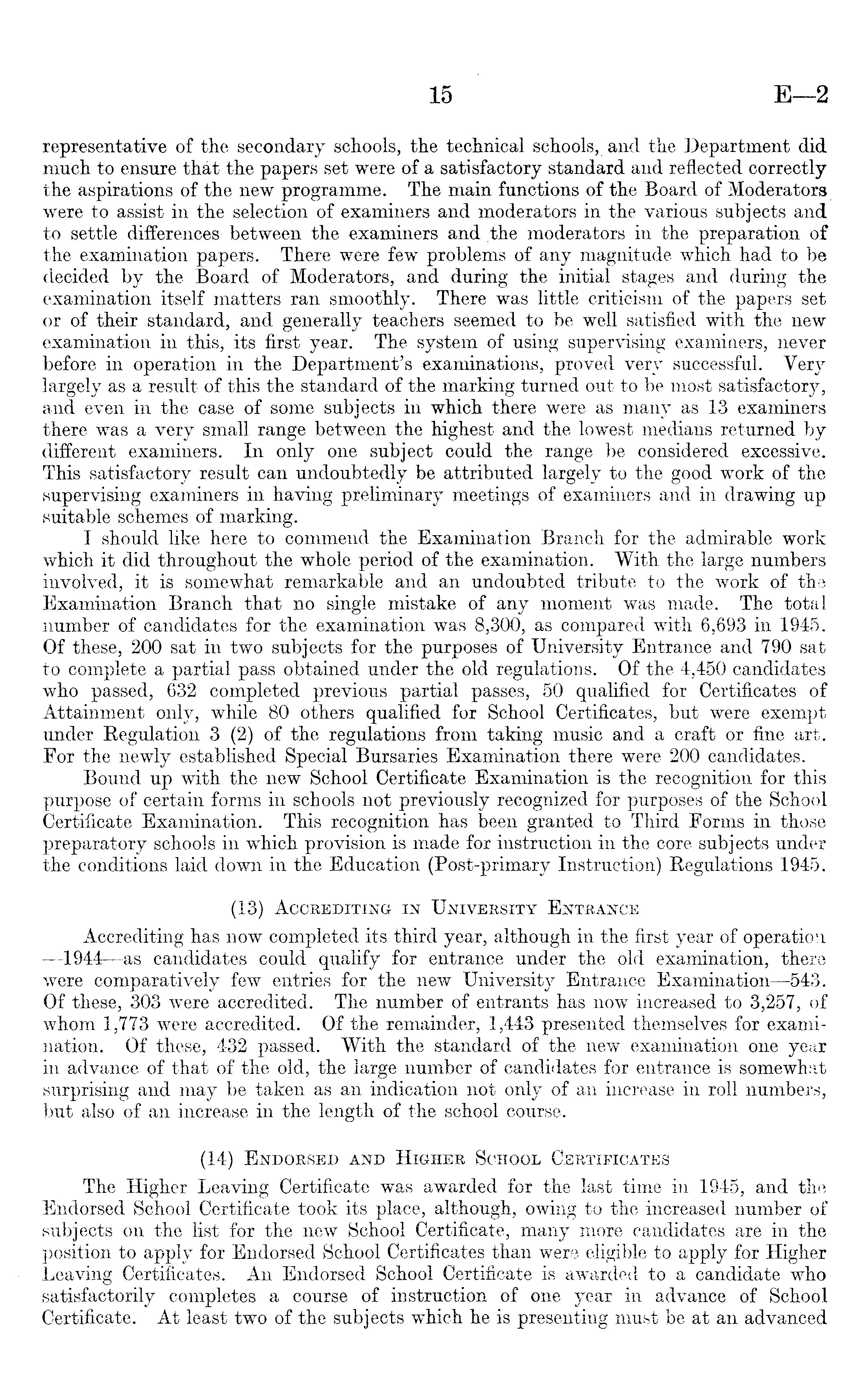 representative of the secondary schools, the technical schools, and the Department did much to ensure that the papers set were of a satisfactory standard and reflected correctly the aspirations of the new programme. The main functions of the Board of Moderators were to assist in the selection of examiners and moderators in the various subjects and to settle differences between the examiners and the moderators in the preparation of the examination papers. There were few problems of any magnitude which had to be decided by the Board of Moderators, and during the initial stages and during the examination itself matters ran smoothly. There was little criticism of the papers set or of their standard, and generally teachers seemed to be well satisfied with the new examination in this, its first year. The system of using supervising examiners, never before in operation in the Department's examinations, proved very successful.. Very largely as a result of this the standard of the marking turned out to be most satisfactory, and even in the case of some subjects in which there were as many as 13 examiners there was a very small range between the highest and the lowest medians returned by different examiners. In only one subject could the range be considered excessive. This satisfactory result can undoubtedly be attributed largely to the good work of the supervising examiners in having preliminary meetings of examiners and in drawing up suitable schemes of marking. I should like here to commend the Examination Branch for the admirable work which it did throughout the whole period of the examination. With the large numbers involved, it is somewhat remarkable and an undoubted tribute to the work of the Examination Branch that no single mistake of any moment was made. The total number of candidates for the examination was 8,300, as compared with 6,693 in 1945. Of these, 200 sat in two subjects for the purposes of University Entrance and 790 sat to complete a partial pass obtained under the old regulations. Of the 4,450 candidates who passed, 632 completed previous partial passes, 50 qualified for Certificates of Attainment only, while 80 others qualified for School Certificates, but were exempt under Regulation 3 (2) of the regulations from taking music and a craft or fine art. For the newly established Special Bursaries Examination there were 200 candidates. Bound up with the new School Certificate Examination is the recognition for this purpose of certain forms in schools not previously recognized for purposes of the School Certificate Examination. This recognition has been granted to Third Forms in those preparatory schools in which provision is made for instruction in the core subjects under the conditions laid down in the Education (Post-primary Instruction) Regulations 1945. (13) Accrediting in University Entrance Accrediting has now completed its third year, although in the first year of operation —l944 —as candidates could qualify for entrance under the old examination, there were comparatively few entries for the new University Entrance Examination —543. Of these, 303 were accredited. The number of entrants has now increased to 3,257, of whom 1,773 were accredited. Of the remainder, 1,443 presented themselves for examination. Of these, 432 passed. With the standard of the new examination one year in advance of that of the old, the large number of candidates for entrance is somewhat surprising and may be taken as an indication not only of an increase in roll numbers, -but also of an increase in the length of the school course. (14) Endorsed and Higher School Certificates The Higher Leaving Certificate was awarded for the last time in 1945, and the Endorsed School Certificate took its place, although, owing to the increased number of subjects on the list for the new School Certificate, many more candidates are in the position to apply for Endorsed School Certificates than were eligible to apply for Higher Leaving Certificates. Air-Endorsed School Certificate is awarded to a candidate who satisfactorily completes a course of instruction of one year in advance of School Certificate. At least two of the subject's which he is presenting must be at an advanced