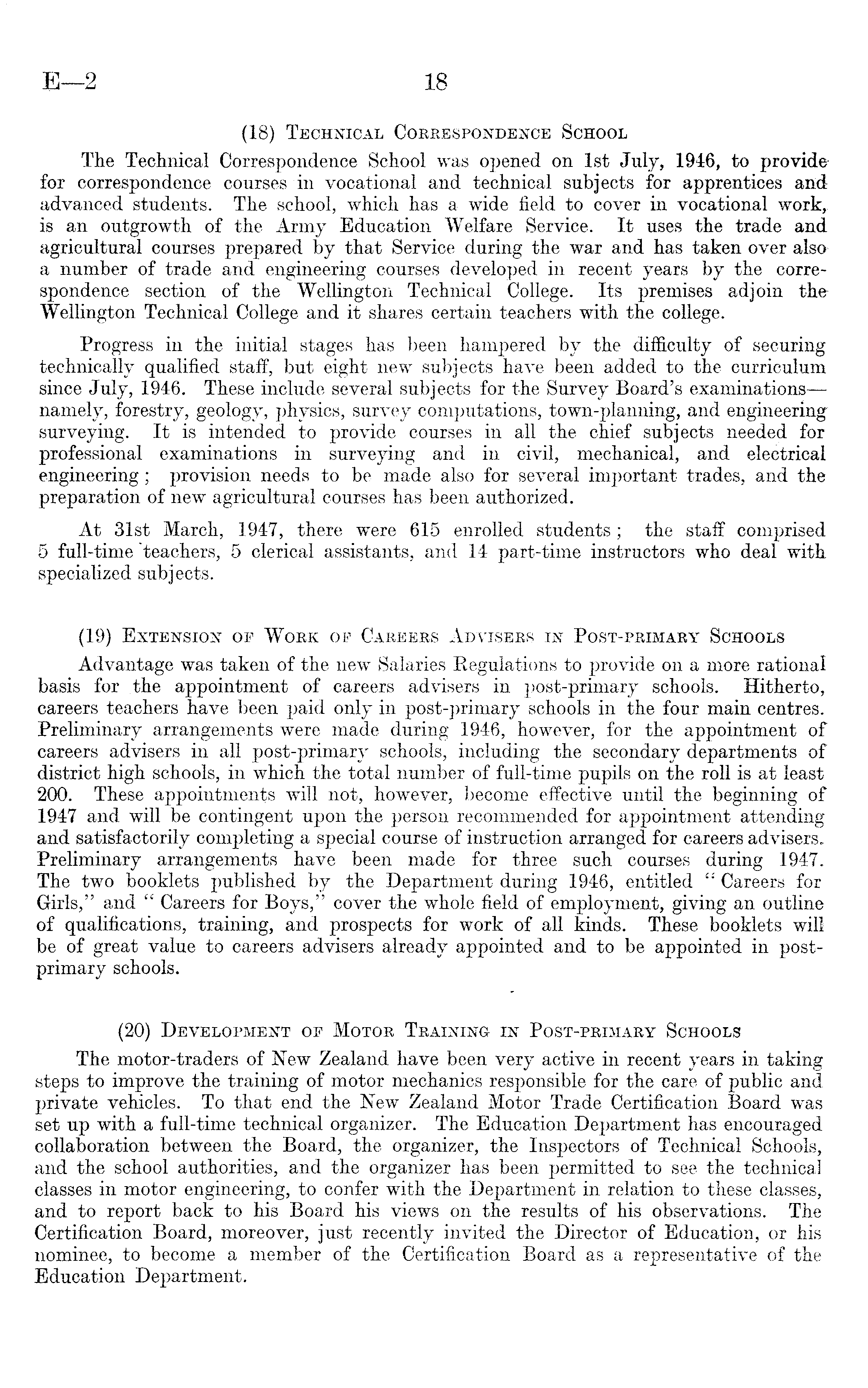 (18) Technical Correspondence School The Technical Correspondence School was opened on Ist July, 1946, to provide for correspondence courses in vocational and technical subjects for apprentices and advanced students. The school, which has a wide field to cover in vocational work,, is an outgrowth of the Army Education Welfare Service. It uses the trade and agricultural courses prepared by that Service during the war and has taken over also a number of trade and engineering courses developed in recent years by the correspondence section of the Wellington Technical College. Its premises adjoin the Wellington Technical College and it shares certain teachers with the college. Progress in the initial stages has been hampered by the difficulty of securing technically qualified staff, but eight new subjects have been added to the curriculum since July, 1946. These include several subjects for the Survey Board's examinations—namely, forestry, geology, physics, survey computations, town-planning, and engineering surveying. It is intended to provide courses in all the chief subjects needed for professional examinations in surveying and in civil, mechanical, and electrical engineering; provision needs to be made also for several important trades, and the preparation of new agricultural courses has been authorized. At 31st March, 1947, there were 615 enrolled students; the staff comprised 5 full-time 'teachers, 5 clerical assistants, and 14 part-time instructors who deal with specialized subjects. (19) Extension of Work of Careers Advisers in Post-primary Schools Advantage was taken of the new Salaries Begulations to provide on a more rational basis for the appointment of careers advisers in post-primary schools. Hitherto, careers teachers have been paid only in post-primary schools in the four main centres. Preliminary arrangements were made during 1946, however, for the appointment of careers advisers in all post-primary schools, including the secondary departments of district high schools, in which the total number of full-time pupils on the roll is at least 200. These appointments will not, however, become effective until the beginning of 1947 and will be contingent upon the person recommended for appointment attending and satisfactorily completing a special course of instruction arranged for careers advisers. Preliminary arrangements have been made for three such courses during 1947. The two booklets published by the Department during 1946, entitled " Careers for Girls," and " Careers for Boys," cover the whole field of employment, giving an outline of qualifications, training, and prospects for work of all kinds. These booklets will be of great value to careers advisers already appointed and to be appointed in postprimary schools. (20) Development of Motor Training in Post-primary Schools The motor-traders of New Zealand have been very active in recent years in taking steps to improve the training of motor mechanics responsible for the care of public and private vehicles. To that end the New Zealand Motor Trade Certification Board was set up with a full-time technical organizer. The Education Department has encouraged collaboration between the Board, the organizer, the Inspectors of Technical Schools, and the school authorities, and the organizer has been permitted to see the technical classes in motor engineering, to confer with the Department in relation to these classes, and to report back to his Board his views on the results of his, observations. The Certification Board, moreover, just recently invited the Director of Education, or his nominee, to become a member of the Certification Board as a representative of the Education Department.