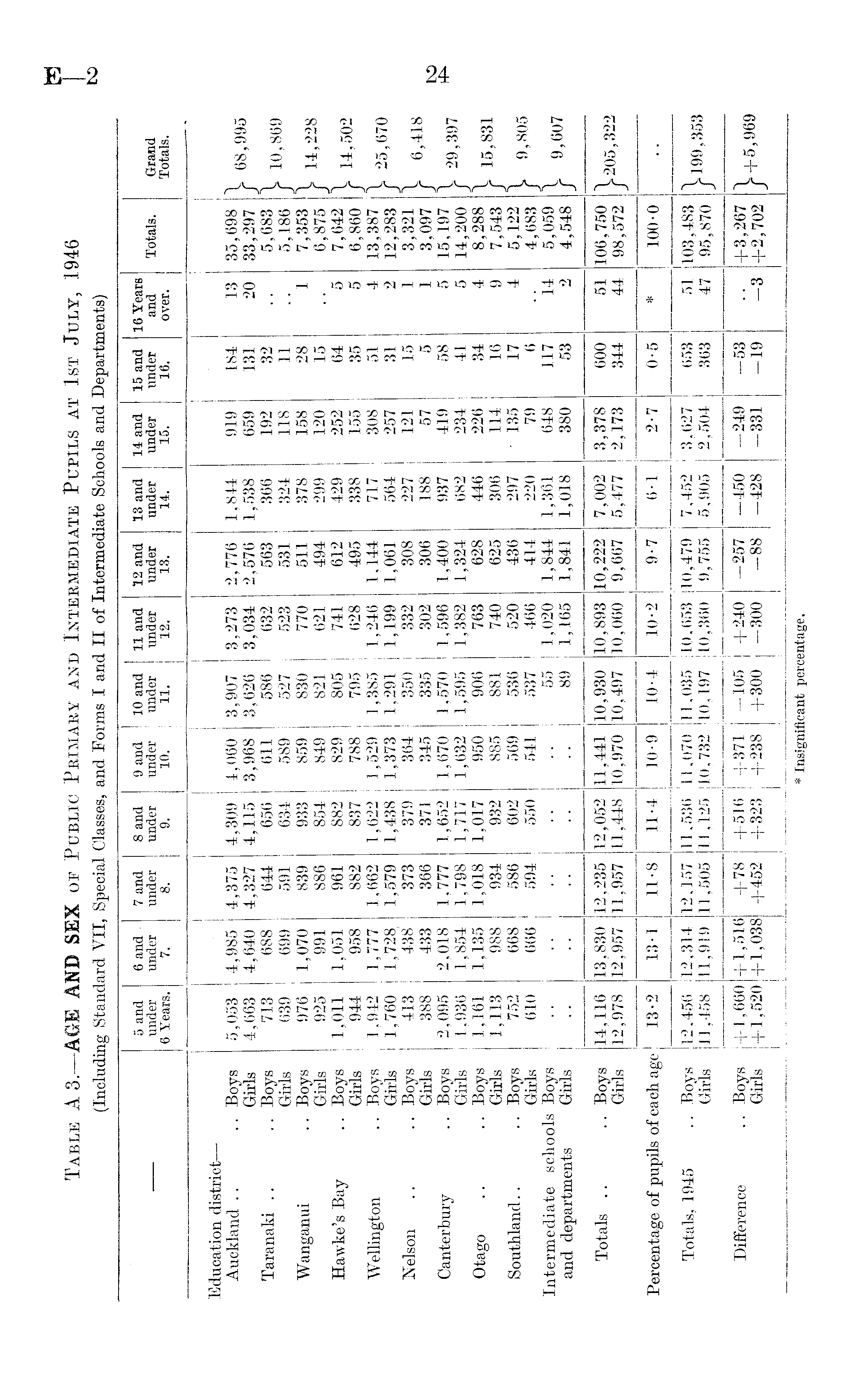 (Including Standard VII, Special Classes, and Forms I and II of Intermediate Schools and Departments) 1 5 and under 6 Years. 6 and under 7. 7 and under 8. 8 and under 9. 9 and under 10. 10 and under 11. 11 and under 12. 12 and under 13. 13 and under 14. 14 and under 15. 15 and under 16. 16 Years and over. Totals. Grand Totals. Education district — Auckland .. .. Boys Girls Taranaki .. .. Boys Girls Wanganui .. Boys Girls Hawke's Bay .. Boys Girls Wellington .. Boys Girls Nelson .. .. Boys Girls Canterbury .. Boys Girls Otago .. .. Boys Girls Southland.. .. Boys Girls Intermediate schools Boys and departments Girls 5,053 4,663 713 639 976 925 1,011 944 1,942 1,760 413 388 2,095 1,936 1,161 1,113 752 610 4,985 4,640 688 699 1,070 991 1,051 958 1,777 1,728 438 433 2,018 1,854 1,135 988 668 666 4,375 4,327 644 591 839 886 961 882 1,662 1,579 373 366 1,777 1,798 1,018 934 586 594 4,309 4,115 656 634 933 854 882 837 1,622 1,438 379 371 1,652 1,717 1,017 932 602 550 4,060 3,968 611 589 859 849 829 788 1,529 1,373 364 345 1,670 1,632 950 885 569 541 3,907 3,626 586 527 830 821 805 795 1,385 1,291 350 335 1,570 1,595 906 881 536 537 55 89 3,273 3,034 632 523 770 621 741 628 1,246 1,199 332 302 1,596 1,382 763 740 520 466 1,020 1,165 2,776 2,576 563 531 511 494 612 495 1,144 1,061 308 306 1,400 1,324 628 625 436 414 1,844 1,841 1,844 1,538 366 324 378 299 429 338 717 564 227 188 937 682 446 306 297 220 1,361 1,018 919 659 192 118 158 120 252 155 308 257 121 57 419 234 226 114 • 135 79 648 380 184 131 32 11 28 15 64 35 51 31 15 5 58 41 34 16 17 6 117 53 13 20 1 5 5 4 2 1 1 5 5 4 9 4 14: 2 35,698 ' 33,297 5,683 ' 5,186 7,353 6,875 7,642 6,860 13,387 12,283 3,321 3,097 15,197 14,200 8,288 7,543 5,122 4,683 5,059 4,548 V 68,995 | 10,869 | 14,228 \ 14,502 i 25,670 \ 6,418 \ 29,397 i 15,831 \ 9,805 | 9,607 Totals .. .. Boys Girls 14,116 12,978 13,830 12,957 12,235 11,957 12,052 11,448 11,441 10,970 10,930 10,497 10,893 10,060 10,222 9,667 7,002 5,477 3,378 2,173 600 344 51 44 106,750 98,572 205, 322 Percentage of pupils of each age 13-2 13-1 11-8 11-4 10-9 10-4 10-2 9-7 6-1 2-7 0-5 * 100-0 Totals, 1945 .. Boys Girls 12,456 11,458 12,314 11,919 12,157 11,505 11,536 11,125 11,070 10,732 11,035 10,197 10,653 10,360 10,479 9,755 7,452 5,905 3,627 2,504 653 363 51 47 103,483 95,870 J* 199, 353 Difference .. Boys Girls + 1,660 + 1,520 + 1,516 + 1,038 +78 +452 +516 +323 +371 +238 -105 +300 +240 -300 -257 -88 -450 -428 -249 -331 -53 -19 -3 +3,267 +2,702 j^+5,969 * Insignificant percentage.