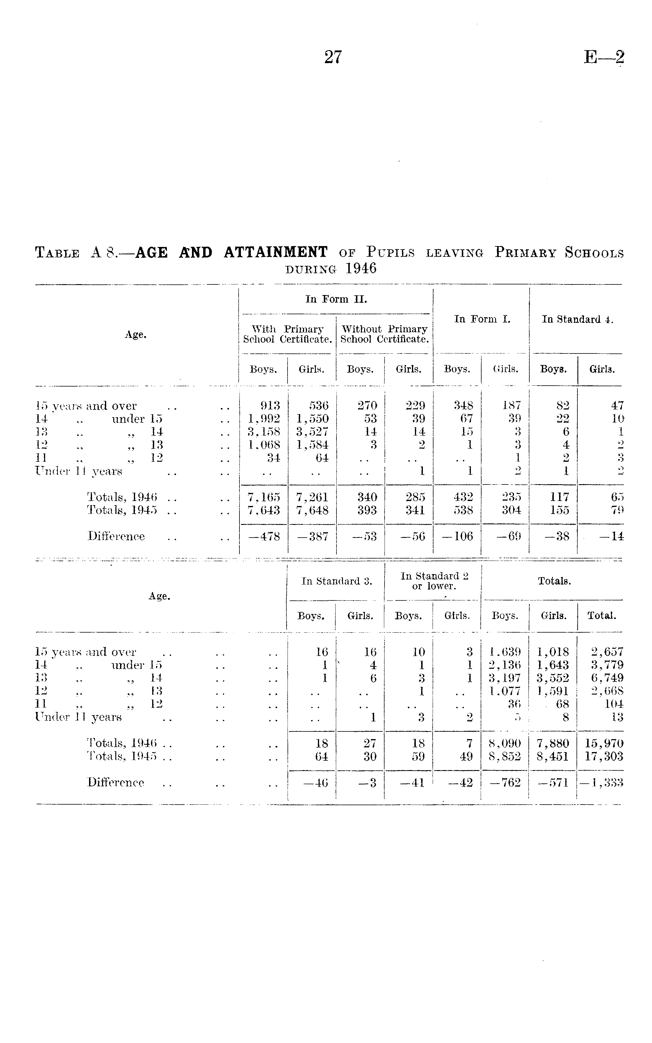 In Form II. Age. With Primary School Certificate. Without Primary School Certificate. In Form I. In Standard 4. Boys. Girls. Boys. Girls. Boys. Girls. Boys. Girls. 15 years and over 14 „ under 15 13 „ „ 14 12 „ „ 13 11 „ „ 12 Under 11 years 913 1,992 3,158 1,068 34 536 1,550 3,527 1,584 64 270 53 14 3 229 39 14 2 1 348 67 15 1 1 187 39 3 3 1 2 82 22 ; 6 4 2 1 47 10 1 2 3 2 Totals, 1946 Totals, 1945 7,165 7,643 7,261 7,648 340 393 285 341 432 538 235 304 117 155 65 79 Difference —478 -387 -53 -56 -106 -69 -38 -14 Age. In Standard 3. In Standard 2 or lower. Totals. Boys. Girls. Boys. Girls. Boys. Girls. Total. 15 years and over 14 „ under 15 13 „ „ 14 12 „ „ 13 11 „ „ 12 Under 11 years 16 1 1 16 4 6 1 10 1 3 1 3 3 1 1 ' '2 1,639 2,136 3,197 1,077 36 5 1,018 1,643 3,552 ] ,591 . 68 8 2,657 3,779 6,749 2,668 104 13 Totals, 194(5 Totals, 1945 18 64 27 30 18 59 7 49 8,090 8,852 7,880 8,451 15,970 17,303 Difference -46 -3 -41 -42 . -762 -571 -1,333