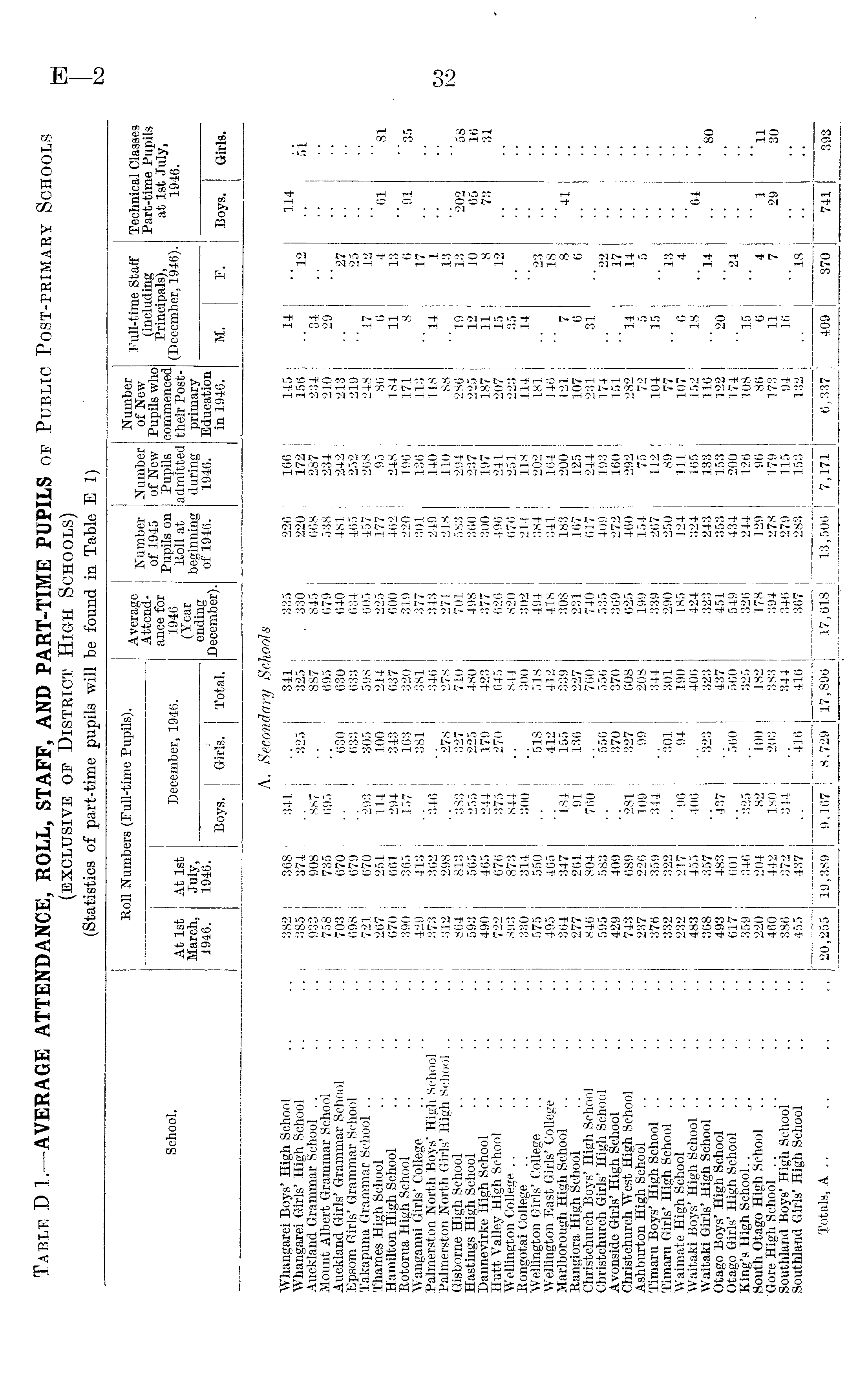 (exclusive op District High Schools) (Statistics of part-time pupils will be found in Table E 1) Roll Numbers (Full-time Pupils). Average Attendance for 1946 (Year ending December). Number Number Number of New Full-time Staff (including Principals), (December, 1946). Technical Classes Part-time Pupils at 1st July, 1946. School. At 1st March, At 1st July, December, 1946. of 1945 Pupils on Roll at beginning of New Pupils admitted during Pupils who commenced their Postprimary J94.6. 1946. Boys. Girls. Total. of 1946. 1946. Education in 1946. M. P. Boys. Girls. A. Secondary Schools Whangarei Boys' High School Whangarei Girls' High School Auckland Grammar School Mount Albert Grammar School Auckland Girls' Grammar School Epsom Girls' Grammar School Takapuna Grammar School Thames High School Hamilton High School Rotorua High School Wanganui Girls' College Palmerston North Boys' High School Palmerston North Girls' High School Gisborne High School Hastings High School Dannevirke High School Hutt Valley High School .. Wellington College Rongotai College Wellington Girls' College Wellington East Girls' College Marlborough High School Rangiora High School Christchurch Boys' High School Christchurch Girls' High School Avonside Girls' High School Christchurch West High School Ashburton High School Timaru Boys' High School Timaru Girls' High School Waimate High School Waitaki Boys' High School Waitaki Girls' High School .. Otago Boys' High School Otago Girls' High School King's High School.. . South Otago High School Gore High School Southland Boys' High School .. Southland Girls' High School .. .. 382 385 933 758 703 698 721 267 670 390 429 373 312 864 593 490 722 893 330 575 495 364 277 846 595 429 743 237 376 332 232 483 368 493 617 359 220 460 386 455 368 374 908 735 670 679 670 251 661 365 413 362 298 813 565 465 676 873 314 550 465 347 261 804 583 409 689 226 359 322 217 455 357 483 601 346 204 442 372 437 341 '887 695 293 114 294 157 346 '383 255 244 375 844 300 'i84 91 760 '281 109 344 "96 406 '437 '325 82 180 344 '325 '630 633 305 100 343 163 381 '278 327 225 179 270 *518 412 155 136 *556 370 327 99 301 94 '323 '560 'ioo 203 '416 341 325 887 695 630 633 598 214 637 320 381 346 278 710 480 423 645 • 844 300 518 412 339 227 760 556 370 608 208 344 301 190 406 323 437 560 325 182 383 344 416 335 . 330 845 679 640 634 605 225 600 319 377 343 271 701 498 377 626 820 302 494 418 308 231 740 535 369 625 199 339 290 185 424 323 451 549 326 178 394 346 367 226 220 668 538 481 465 457 177 462 220 301 249 218 583 360 300 496 676 214 384 341 183 167 617 409 272 460 154 267 250 124 324 243 353 434 244 129 278 279 283 166 172 287 234 242 252 268 95 248 196 136 140 110 294 237 197 241 251 118 202 164 200 125 244 193 160 292 75 112 89 111 165 133 153 200 126 96 179 115 153 145 156 234 210 213 219 248 86 184 171 113 118 88 286 225 187 207 223 114 181 146 121 107 231 174 151 282 72 104 77 107 152 116 122 174 108 86 173 94 132 14 "34 29 "l7 6 11 8 "l4 "l9 12 11 15 35 14 7 6 31 "l4 5 15 6 18 "20 "l5 6 11 16 "l2 "27 25 12 4 13 6 17 1 13 13 10 8 12 "23 18 8 6 "22 17 14 5 "l3 4 "14 "24 4 7 "l8 114 "61 "91 202 65 73 "41 "64 1 29 si "81 "35 "58 16 31 "80 "ll 30 !fotftls, A .. 20,255 19,389 9,167 8,729 17,896 17,618 13,506 7,171 6,337 409 370 741 393