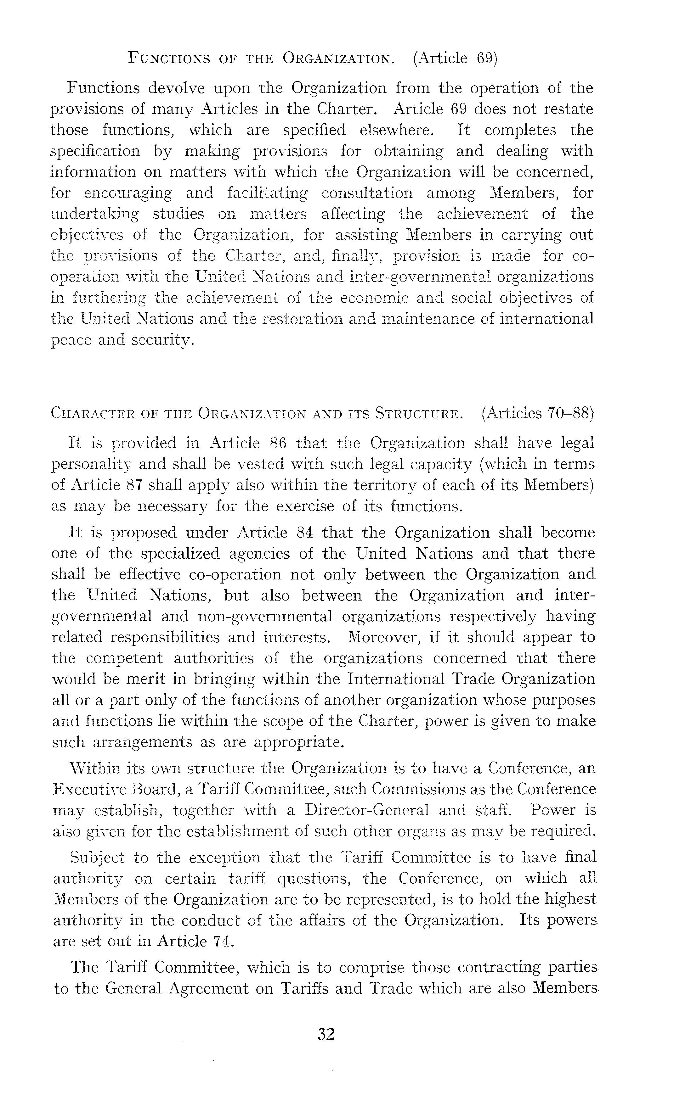 Functions of the Organization. (Article 69) Functions devolve upon the Organization from the operation of the provisions of many Articles in the Charter. Article 69 does not restate those functions, which are specified elsewhere. It completes the specification by making provisions for obtaining and dealing with information on matters with which the Organization will be concerned, for encouraging and facilitating consultation among Members, for undertaking studies on matters affecting the achievement of the objectives of the Organization, for assisting Members in carrying out the provisions of the Charter, and, finally, provision is made for cooperation with the United Nations and inter-governmental organizations in furthering the achievement of the economic and social objectives of the United Nations and the restoration and maintenance of international peace and security. Character of the Organization and its Structure. (Articles 70-88) It is provided in Article 86 that the Organization shall have legal personality and shall be vested with such legal capacity (which in terms of Article 87 shall apply also within the territory of each of its Members) as may be necessary for the exercise of its functions. It is proposed under Article 84 that the Organization shall become one of the specialized agencies of the United Nations and that there shall be effective co-operation not only between the Organization and the United Nations, but also between the Organization and intergovernmental and non-governmental organizations respectively having related responsibilities and interests. Moreover, if it should appear to the competent authorities of the organizations concerned that there would be merit in bringing within the International Trade Organization all or a part only of the functions of another organization whose purposes and functions lie within the scope of the Charter, power is given to make such arrangements as are appropriate. Within its own structure the Organization is to have a Conference, an Executive Board, a Tariff Committee, such Commissions as the Conference may establish, together with a Director-General and staff. Power is also given for the establishment of such other organs as may be required. Subject to the exception that the Tariff Committee is to have final authority on certain tariff questions, the Conference, on which all Members of the Organization are to be represented, is to hold the highest authority in the conduct of the affairs of the Organization. Its powers are set out in Article 74. The Tariff Committee, which is to comprise those contracting parties to the General Agreement on Tariffs and Trade which are also Members