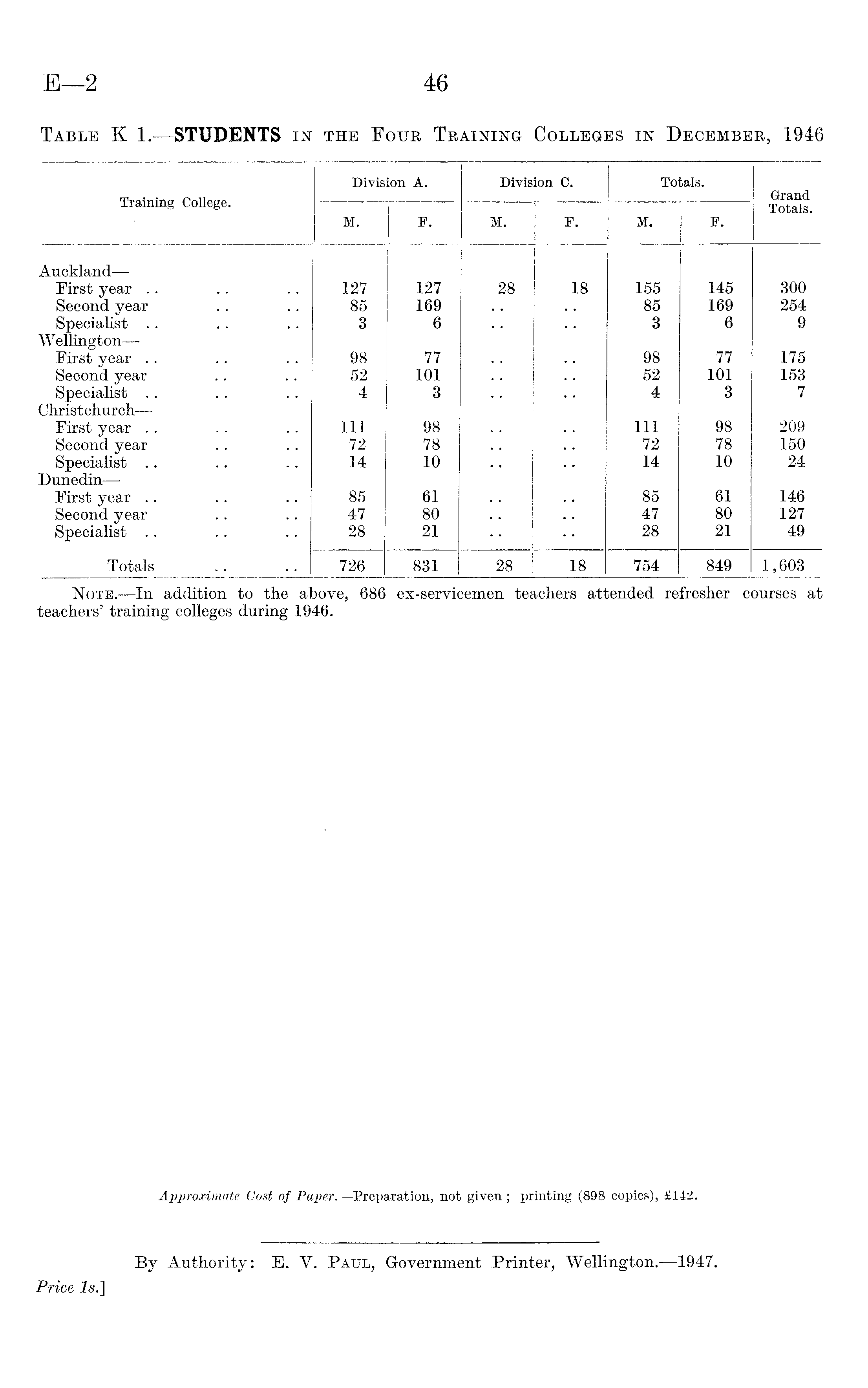 Division A. Division 0. Totals. G-rand 1 raining College. Totals. M. F. M. F. M. F. Auckland — First year 127 127 28 18 155 145 300 Second year 85 169 85 169 254 Specialist 3 6 3 6 9 Wellington— First year 98 77 98 77 175 Second year 52 101 52 101 153 Specialist 4 3 4 3 7 Christchurch — First year 111 98 111 98 209 Second year 72 78 72 78 150 Specialist 14 10 14 10 24 Dunedin— First year 85 61 85 61 146 Second year 47 80 47 80 127 Specialist 28 21 28 21 49 Totals 726 831 28 18 754 849 1,603 Note. —In addition to the above, 686 ex-servicemen teachers attended refresher courses at teachers' training colleges during 1946.
