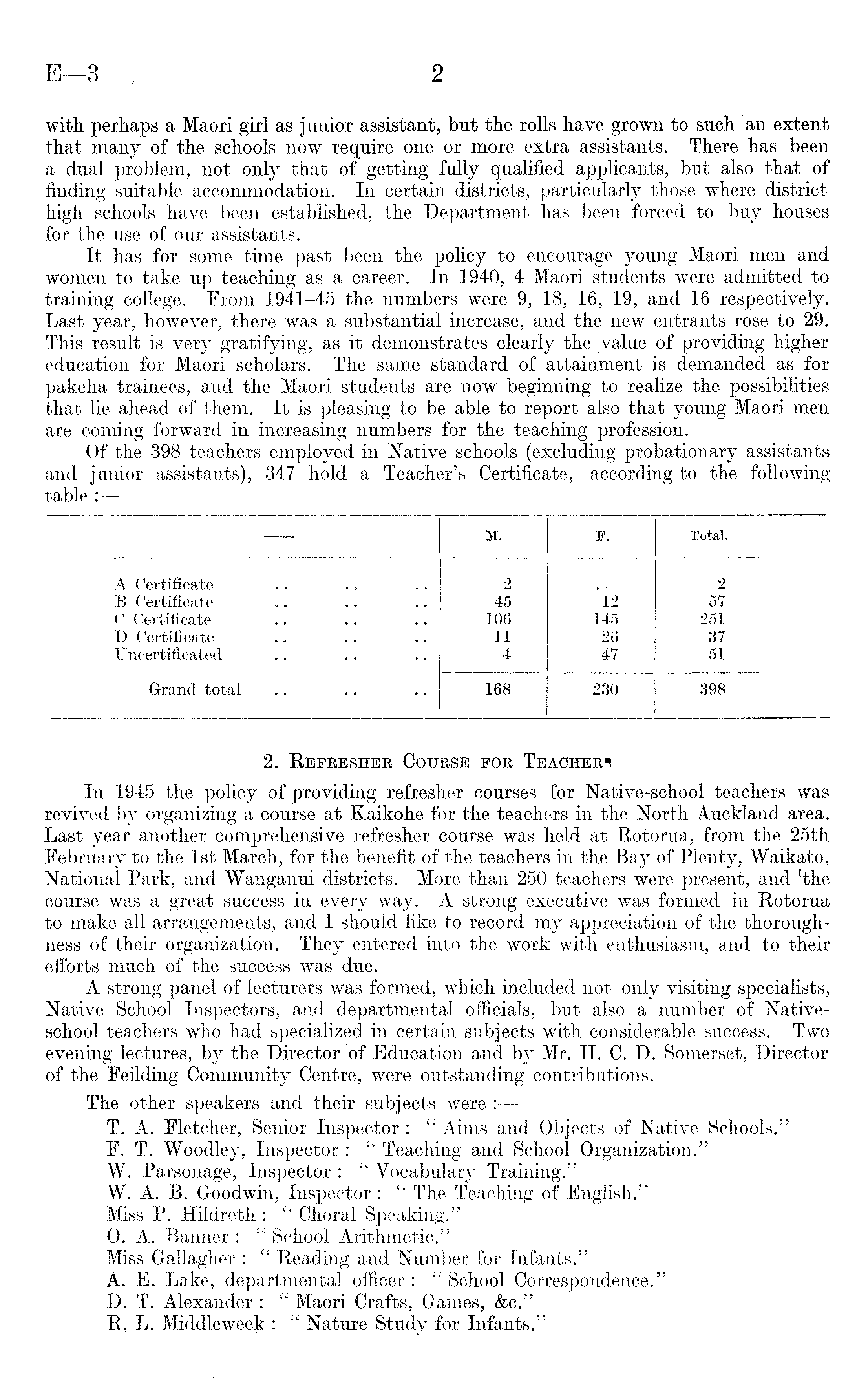 2. Refresher Course for Teachers In 1945 the policy of providing refresher courses for Native-school teachers was revived by organizing a course at Kaikohe for the teachers in the North Auckland area. Last year another comprehensive refresher course was held at Rotorua, from the 25th February to the Ist March, for the benefit of the teachers in the Bay of Plenty, Waikato, National Park, and Wanganui districts. More than 250 teachers were present, and 'the course was a great success in every way. A strong executive was formed in Rotorua to make all arrangements, and I should like to record my appreciation of the thoroughness of their organization. They entered into the work with enthusiasm, and to their efforts much of the success was due. A strong panel of lecturers was formed, which included not only visiting specialists, Native School Inspectors, and departmental officials, but also a number of Nativeschool teachers who had specialized in certain subjects with considerable success. Two evening lectures, by the Director of Education and by Mr. H. C. D. Somerset, Director of the Feilding Community Centre, were outstanding contributions. The other speakers and their subjects were : T. A. Fletcher, Senior Inspector : " Aims and Objects of Native Schools." F. T. Woodley, Inspector: "Teaching and School Organization." W. Parsonage, Inspector : " Vocabulary Training." W. A. B. Goodwin, Inspector: " The Teaching of English." Miss P. Hildreth : " Choral Speaking." 0. A. Banner : " School Arithmetic." Miss Gallagher : " Reading and Number for Infants." A. E. Lake, departmental officer : " School Correspondence." D. T. Alexander : " Maori Crafts, Games, &c." R, L, Middleweek ; " Nature Study for Infants."
