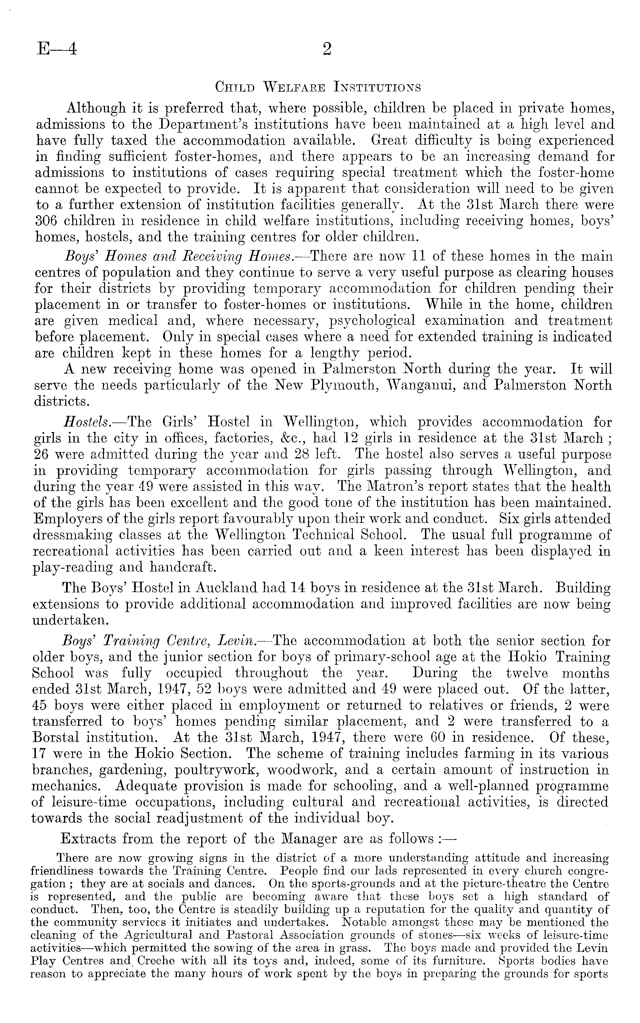 Child Welfare Institutions Although it is preferred that, where possible, children be placed in private homes, admissions to the Department's institutions have been maintained at a high level and have fully taxed the accommodation available. Great difficulty is being experienced in finding sufficient foster-homes, and there appears to be an increasing demand for admissions to institutions of cases requiring special treatment which the foster-home cannot be expected to provide. It is apparent that consideration will need to be given to a further extension of institution facilities generally. At the 31st March there were 306 children in residence in child welfare institutions, including receiving homes, boys' homes, hostels, and the training centres for older children. Boys' Homes and Receiving Homes. —There are now 11 of these homes in the main centres of population and they continue to serve a very useful purpose as clearing houses for their districts by providing temporary accommodation for children pending their placement in or transfer to foster-homes or institutions. While in the home, children are given medical and, where necessary, psychological examination and treatment before placement. Only in special cases where a need for extended training is indicated are children kept in these homes for a lengthy period. A new receiving home was opened in Palmerston North during the year. It will serve the needs particularly of the New Plymouth, Wanganui, and Palmerston North districts. Hostels.-—'The Girls' Hostel in Wellington, which provides accommodation for girls in the city in offices, factories, &c., had 12 girls in residence at the 31st March ; 26 were admitted during the year and 28 left. The hostel also serves a useful purpose in providing temporary accommodation for girls passing through Wellington, and during the year 49 were assisted in this way. The Matron's report states that the health of the girls has been excellent and the good tone of the institution has been maintained. Employers of the girls report favourably upon their work and conduct. Six girls attended dressmaking classes at the Wellington Technical School. The usual full programme of recreational activities has been carried out and a keen interest has been displayed in play-reading and handcraft. The Boys' Hostel in Auckland had 14 boys in residence at the 31st March. Building extensions to provide additional accommodation and improved facilities are now being undertaken. Boys' Training Centre, Levin.—The accommodation at both the senior section for older boys, and the junior section for boys of primary-school age at the Hokio Training School was fully occupied throughout the year. During the twelve months ended 31st March, 1947, 52 boys were admitted and 49 were placed out. Of the latter, 45 boys were either placed in employment or returned to relatives or friends, 2 were transferred to boys' homes pending similar placement, and 2 were transferred to a Borstal institution. At the 31st March, 1947, there were 60 in residence. Of these, 17 were in the Hokio Section. The scheme of training includes farming in its various branches, gardening, poultrywork, woodwork, and a certain amount of instruction in mechanics. Adequate provision is made for schooling, and a well-planned programme of leisure-time occupations, including cultural and recreational activities, is directed towards the social readjustment of the individual boy. Extracts from the report of the Manager are as follows : There are now growing signs in the district of a more understanding attitude and increasing friendliness towards the Training Centre. People find our lads represented in every church congregation ; they are at socials and dances. On the sports-grounds and at the picture-theatre the Centre is represented, and the public are becoming aware that these boys set a high standard of conduct. Then, too, the Centre is steadily building up a reputation for the quality and quantity of the community services it initiates and undertakes. Notable amongst these may be mentioned the cleaning of the Agricultural and Pastoral Association grounds of stones —six weeks of leisure-time activities—which permitted the sowing of the area in grass. The boys made and provided the Levin Play Centres and_ Creche with all its toys and, indeed, some of its furniture. Sports bodies have reason to appreciate the many hours of work spent by the boys in preparing the grounds for sports