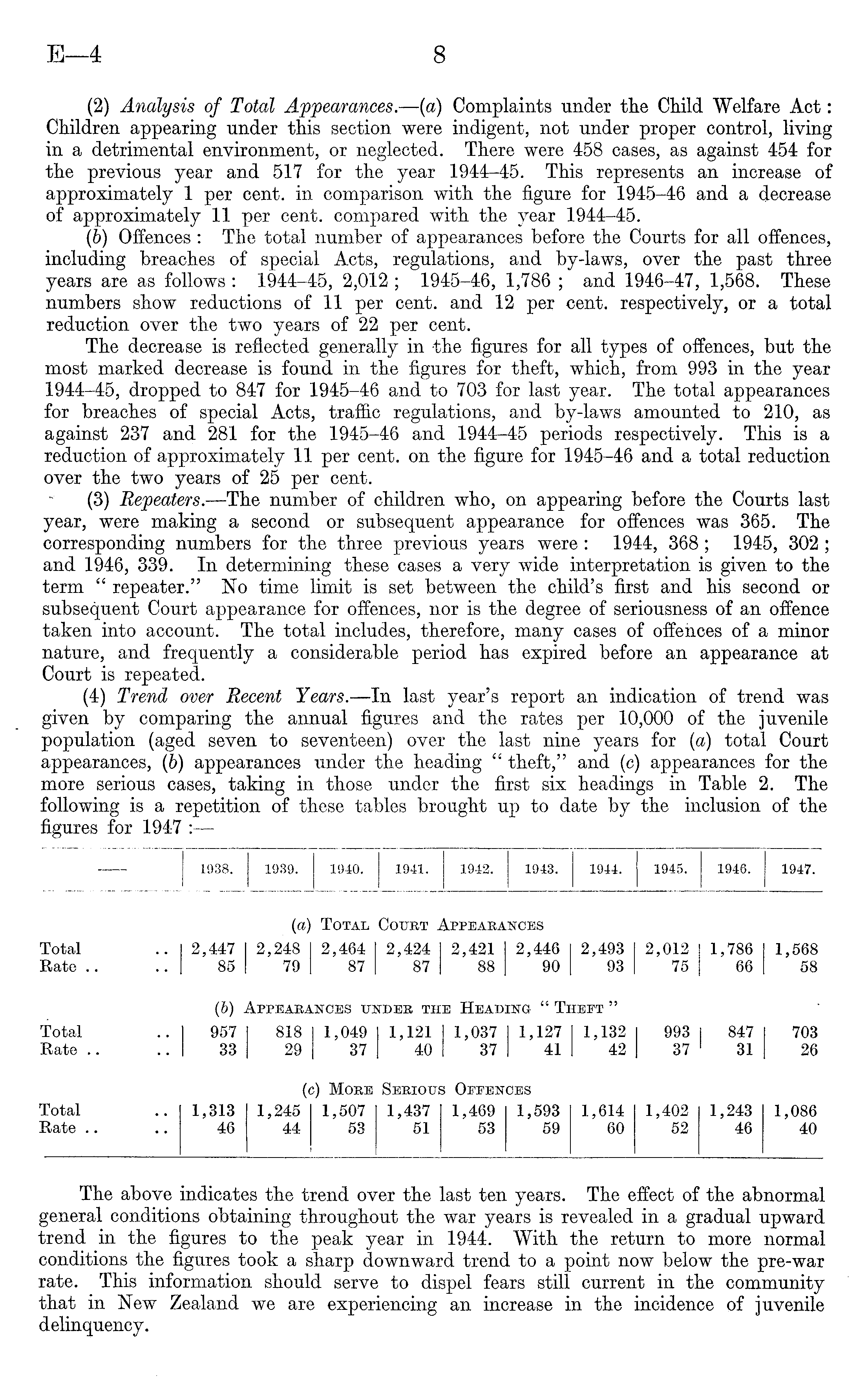 (2) Analysis of Total Appearances.—[a) Complaints under the Child Welfare Act: Children appearing under this section were indigent, not under proper control, living in a detrimental environment, or neglected. There were 458 cases, as against 454 for the previous year and 517 for the year 1944-45. This represents an increase of approximately 1 per cent, in comparison with the figure for 1945-46 and a decrease of approximately 11 per cent, compared with the year 1944-45. (b) Offences : The total number of appearances before the Courts for all offences, including breaches of special Acts, regulations, and by-laws, over the past three years are as follows : 1944-45, 2,012 ; 1945-46, 1,786 ; and 1946-47, 1,568. These numbers show reductions of 11 per cent, and 12 per cent, respectively, or a total reduction over the two years of 22 per cent. The decrease is reflected generally in the figures for all types of offences, but the most marked decrease is found in the figures for theft, which, from 993 in the year 1944-45, dropped to 847 for 1945-46 and to 703 for last year. The total appearances for breaches of special Acts, traffic regulations, and by-laws amounted to 210, as against 237 and 281 for the 1945-46 and 1944-45 periods respectively. This is a reduction of approximately 11 per cent, on the figure for 1945-46 and a total reduction over the two years of 25 per cent. (3) Repeaters.—The number of children who, on appearing before the Courts last year, were making a second or subsequent appearance for offences was 365. The corresponding numbers for the three previous years were : 1944, 368 ; 1945, 302 ; and 1946, 339. In determining these cases a very wide interpretation is given to the term " repeater." No time limit is set between the child's first and his second or subsequent Court appearance for offences, nor is the degree of seriousness of an offence taken into account. The total includes, therefore, many cases of offences of a minor nature, and frequently a considerable period has expired before an appearance at Court is repeated. (4) Trend over Recent Years.—ln last year's report an indication of trend was given by comparing the annual figures and the rates per 10,000 of the juvenile population (aged seven to seventeen) over the last nine years for (a) total Court appearances, (b) appearances under the heading " theft," and (c) appearances for the more serious cases, taking in those under the first six headings in Table 2. The following is a repetition of these tables brought up to date by the inclusion of the figures for 1947
