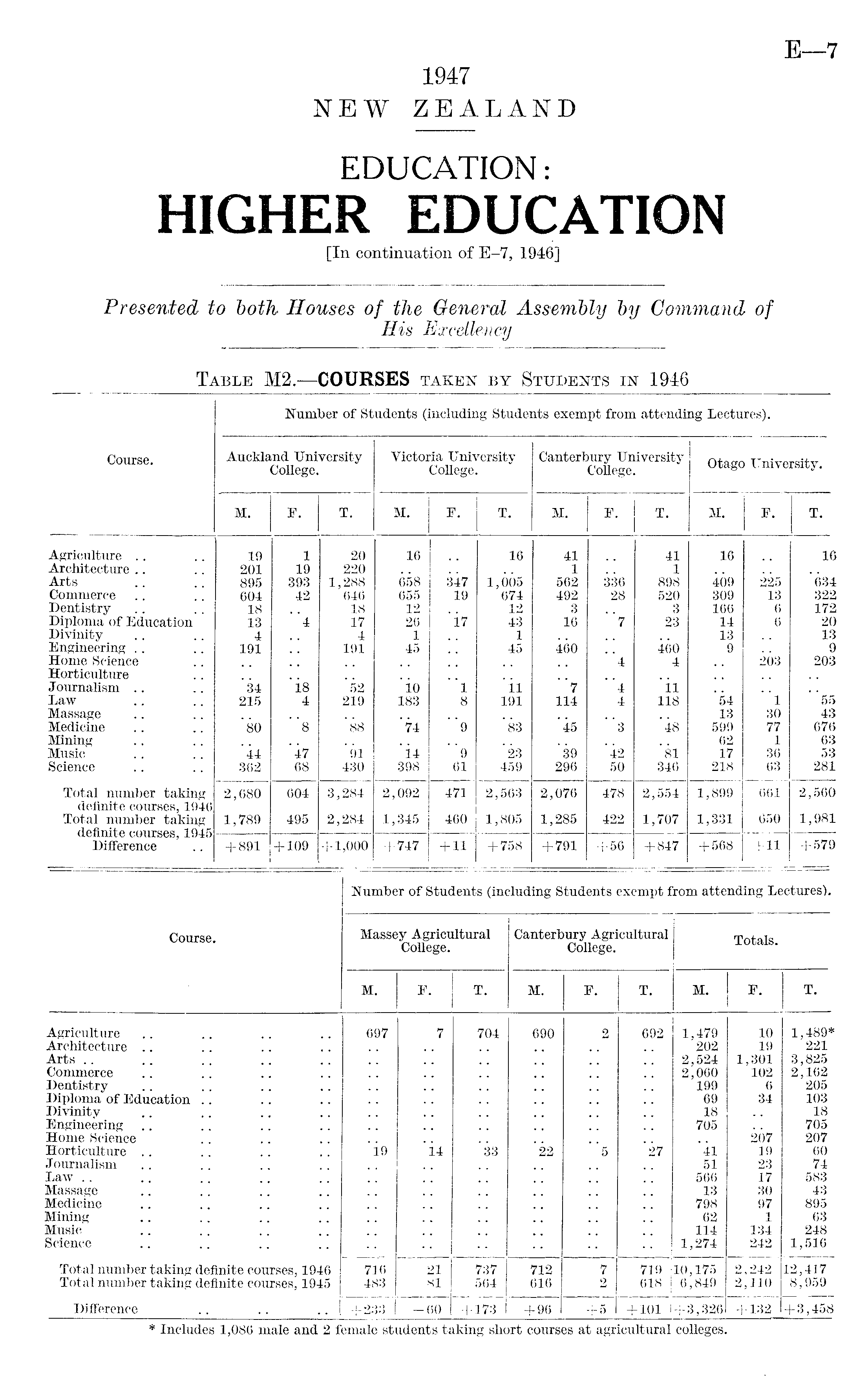 Course. Number of Students (including Students exempt from attending Lectures). Auckland University College. Victoria University College. Canterbury University College. Otago University. M. E. T. M. E. T. M. E. T. M. E. T. Agriculture Architecture Arts Commerce Dentistry Diploma of Education Divinity Engineering Home Science Horticulture Journalism Law Massage Medicine Mining Music Science Total number taking definite courses, 1946 Total number taking definite courses, 1945 Difference 19 201 895 604 18 13 4 191 '34 215 80 '44 362 1 19 393 42 "4 'is 4 ' '8 47 68 20 220 1,288 646 18 17 4 191 '52 219 '88 91 430 16 658 655 12 26 1 45 'io 183 '74 U 398 347 19 "i7 "l 8 ' 9 "9 61 16 1,005 674 12 43 1 45 ii 191 '83 '23 459 41 1 562 492 3 16 460 ' '7 114 '45 39 296 336 28 "7 ' '4 "4 4 ' 3 '42 50 41 1 898 520 3 23 460 4 ii 118 '48 81 346 16 409 309 166 14 13 9 '54 13 599 62 17 218 225 13 6 6 203 ' 1 30 77 1 36 63 16 '634 322 172 20 13 9 203 ' 55 43 676 63 53 281 2,680 1,789 604 495 3,284 2,284 2,092 1,345 471 460 2,563 1,805 2,076 1,285 478 422 2,554 1,707 1,899 1,331 661 650 2,560 1,981 +891 + 109 + 1,000 + 747 + 11 + 758 +791 + 56 + 847 + 568 +11 + 579 Course. Number of Students (including Students exempt from attending Lectures). Massey Agricultural College. Canterbury Agricultural College. Totals. M. E. T. M. E. T. M. F. T. Agriculture Architecture Arts Commerce Dentistry Diploma of Education Divinity Engineering Home Science Horticulture Journalism .. .. Law Massage Medicine Mining Music Science Total number taking definite courses, 1946 Total number taking definite courses, 1945 Difference 697 "i9 7 "i4 704 33 690 *22 2 ' 5 692 '27 1,479 202 2,524 2,060 199 69 18 705 '41 51 566 13 798 62 114 1,274 10 19 1,301 102 6 34 207 19 23 17 30 97 1 134 242 1,489* 221 3,825 2,162 205 103 18 705 207 60 74 583 43 895 63 248 1,516 716 483 21 81 737 564 712 616 7 2 719 618 10,175 6,849 2,242 2,110 12,417 8,959 + 233 -60 + 173 + 96 + 5 + 101 + 3,326 + 132 + 3,458 * Includes 1,086 male and 2 female students taking short courses at agricultural colleges.