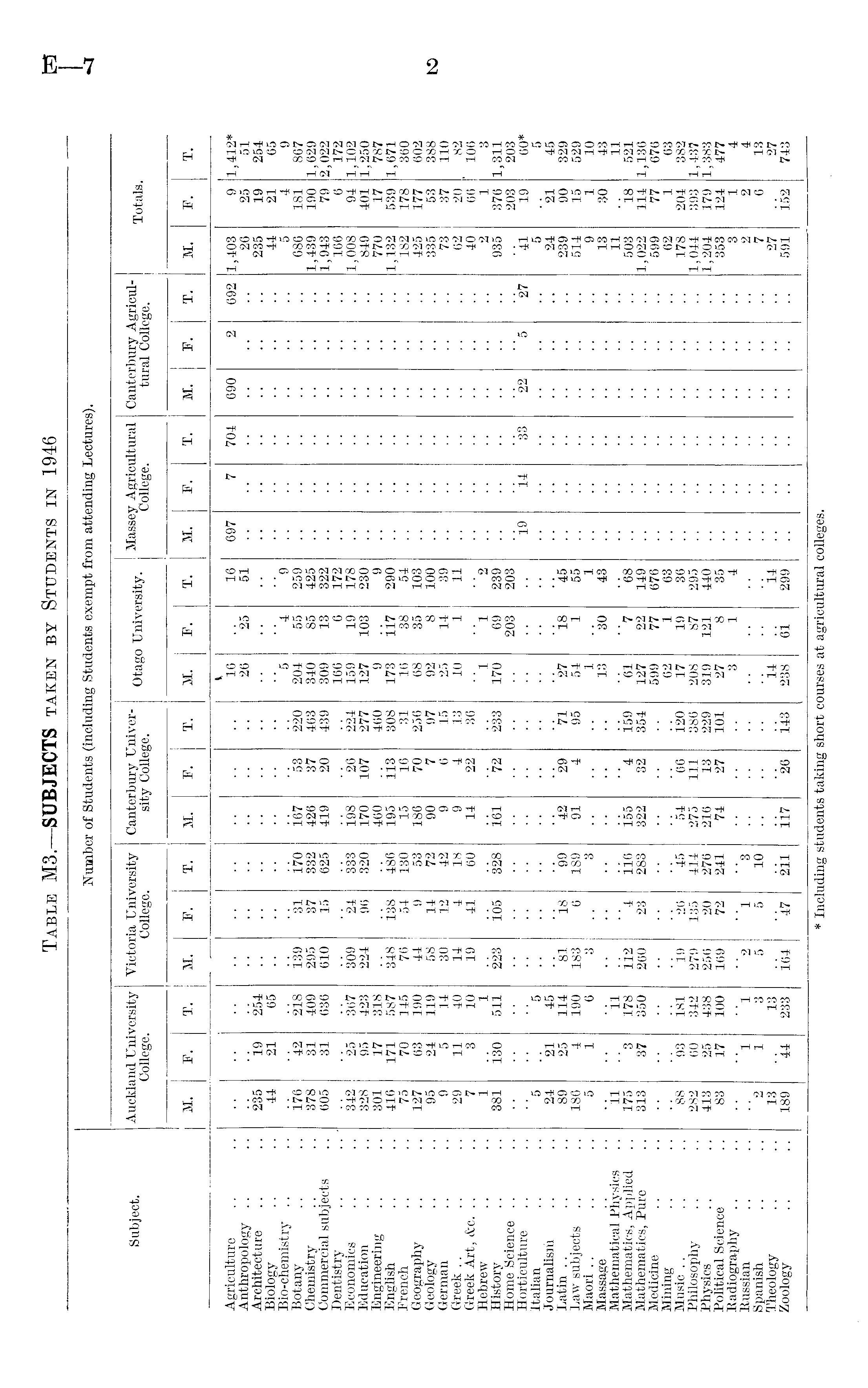 Number of Students (including Students exempt from attending Lectures). Subject. Auckland University "Victoria University Canterbury UniverOtago University. Massey Agricultural Canterbury AgriculTotals. College. College. sity College. College. tural College. M. F. T. M. F. T. M. F. T. M. F. T, M. F. T. M. F. T. M. F. T. Agriculture 16 16 697 7 704 690 2 692 1,403 9 1,412* Anthropology 26 '25 51 26 25 51 Architecture 235 "i9 254 235 19 254 Biology 44 21 65 44 21 65 Bio-chemistry ' '5 "4 9 5 4 9 Botany i76 '42 2i8 i.39 '31 i70 167 '53 220 204 55 259 686 181 867 Chemistry 378 31 409 295 37 332 426 37 463 340 85 425 1,439 190 1,629 Commercial subjects 605 31 636 610 15 625 419 20 439 309 13 322 1,943 79 2,022 Dentistry 166 6 172 166 6 172 Economics 342 *25 367 309 '24 333 1.98 *26 224 159 19 178 1,008 94 1,102 Education 328 95 423 224 96 320 170 107 277 127 103 230 849 401 1,250 Engineering 301 17 318 460 460 9 9 770 17 787 English 416 171 587 348 JL38 486 195 ii3 308 173 ii7 290 1,132 539 1,671 French 75 70 145 76 54 130 15 16 31 16 38 54 182 178 360 Geography 127 63 190 44 9 53 186 70 256 68 35 103 425 177 602 Geology 95 24 119 58 14 72 90 7 97 92 8 100 335 53 388 German 9 5 14 30 12 42 9 6 15 25 14 39 73 37 110 Greek 29 11 40 14 4 18 9 4 13 10 1 11 62 20 , 82 Greek Art, &c. 7 3 10 19 41 60 14 22 36 40 66 106 Hebrew 1 1 ' 'l ' 'l ' '2 2 1 3 History 381 i.30 511 223 io5 328 i61 '72 233 170 69 239 935 376 1,311 Home Science 203 203 203 203 Horticulture i9 "i4 '33 '22 "5 '27 - 41 19 60* Italian "5 "5 5 5 Journalism 24 '21 45 24 *21 45 Latin 89 25 114 81 'is '99 '42 '29 ■71 '27 'is '45 239 90 329 Law subjects 186 4 190 183 6 189 91 4 95 54 1 55 514 15 529 Maori Massage 5 1 6 3 3 1 13 '30 1 43 9 13 1 30 10 43 Mathematical Physics 'ii 'ii 11 11 Mathematics, Applied 175 ' 3 178 ii2 ' '4 ii6 i.55 "4 i.59 '61 "7 '68 503 'is 521 Mathematics, Pure 313 37 350 260 23 283 322 32 354 127 22 149 1,022 114 1,136 Medicine 599 77 676 599 • 77 676 Mining - 62 1 63 62 1 63 Music 88 '93 isi 'i9 *26 '45 '54 '66 i20 17 19 36 178 204 382 Philosophy 282 60 342 279 135 414 275 111 386 208 87 295 1,044 393 1,43? Physics 413 25 438 256 20 276 216 13 229 319 121 440 1,204 179 1,383 Political Science 83 17 100 169 72 241 74 27 101 27 8 35 353 124 477 Radiography 3 1 4 3 1 4 Russian Spanish ' '2 ' 1 1 ' 1 3 ' '2 5 ' 1 5 "3 10 2 7 2 6 4 13 Theology 13 13 'i4 "i4 27 27 Zoology 189 44 233 i.64 '47 2ii ii7 '26 i.43 238 esi 299 591 i52 743 * Including students taking short courses at agricultural colleges.