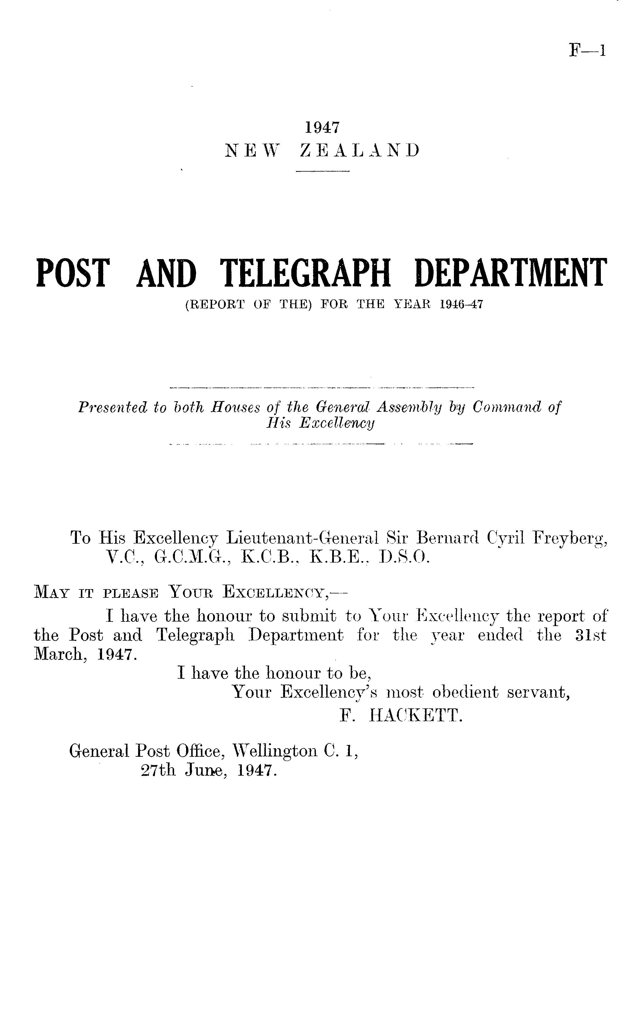 To His Excellency Lieutenant-General Sir Bernard Cyril Freyberg, V.C., G.C.M.G., K.C.8., K.8.E., D.S.O. May it please Your Excellency,— I have the honour to submit to Your Excellency the report of the Post and Telegraph Department for the year ended the 31st March, 1947. I have the honour to be, Your Excellency's most obedient servant, F. HACKETT. General Post Office, Wellington C. 1, 27th June, 1947.