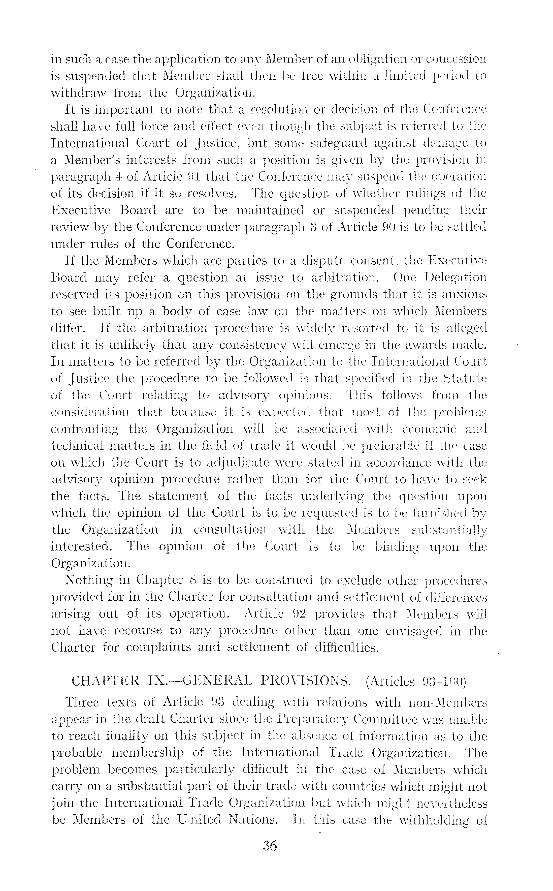 in such a case the application to any Member of an obligation or Concession is suspended that Member shall then be free within a limited period to withdraw from the Organization. It is important to note that a resolution or decision of the Conference shall have full force and effect even though the subject is referred to the International Court of Justice, but some safeguard against damage to a Member's interests from such a position is given by the provision in paragraph 4 of Article 91 that the Conference may suspend the operation of its decision if it so resolves. The question of whether rulings of the Executive Board are to be maintained or suspended pending their review by the Conference under paragraph 3 of Article 90 is to be settled under rules of the Conference. If the Members which are parties to a dispute consent, the Executive Board may refer a question at issue to arbitration. One Delegation reserved its position on this provision on the grounds that it is anxious to see built up a body of case law on the matters on which Members differ. If the arbitration procedure is widely resorted to it is alleged that it is unlikely that any consistency will emerge in the awards made. In matters to be referred by the Organization to the International Court of Justice the procedure to be followed is that specified in the Statute of the Court relating to advisory opinions. This follows from the consideration that because it is expected that most of the problems confronting the Organization will be associated with economic and technical matters in the field of trade it would be preferable if the case on which the Court is to adjudicate were stated in accordance with the advisory opinion procedure rather than for the Court to have to seek the facts. The statement of the facts underlying the question upon which the opinion of the Court is to be requested is to be furnished by the Organization in consultation with the Members substantially interested. The opinion of the Court is" to be binding upon the Organization. Nothing in Chapter 8 is to be construed to exclude other procedures provided for in the Charter for consultation and settlement of differences arising out of its operation. Article 92 provides that Members will not have recourse to any procedure other than one envisaged in the Charter for complaints and settlement of difficulties. CHAPTER IX.—GENERAL PROVISIONS. (Articles 93-100) Three texts of Article 93 dealing with relations with non-Members appear in the draft Charter since the Preparatory Committee was unable to reach finality on this subject in the absence of information as to the probable membership of the International Trade Organization. The problem becomes particularly difficult in the case of Members which carry on a substantial part of their trade with countries which might not join the International Trade Organization but which might nevertheless be Members of the United Nations. In this case the withholding of