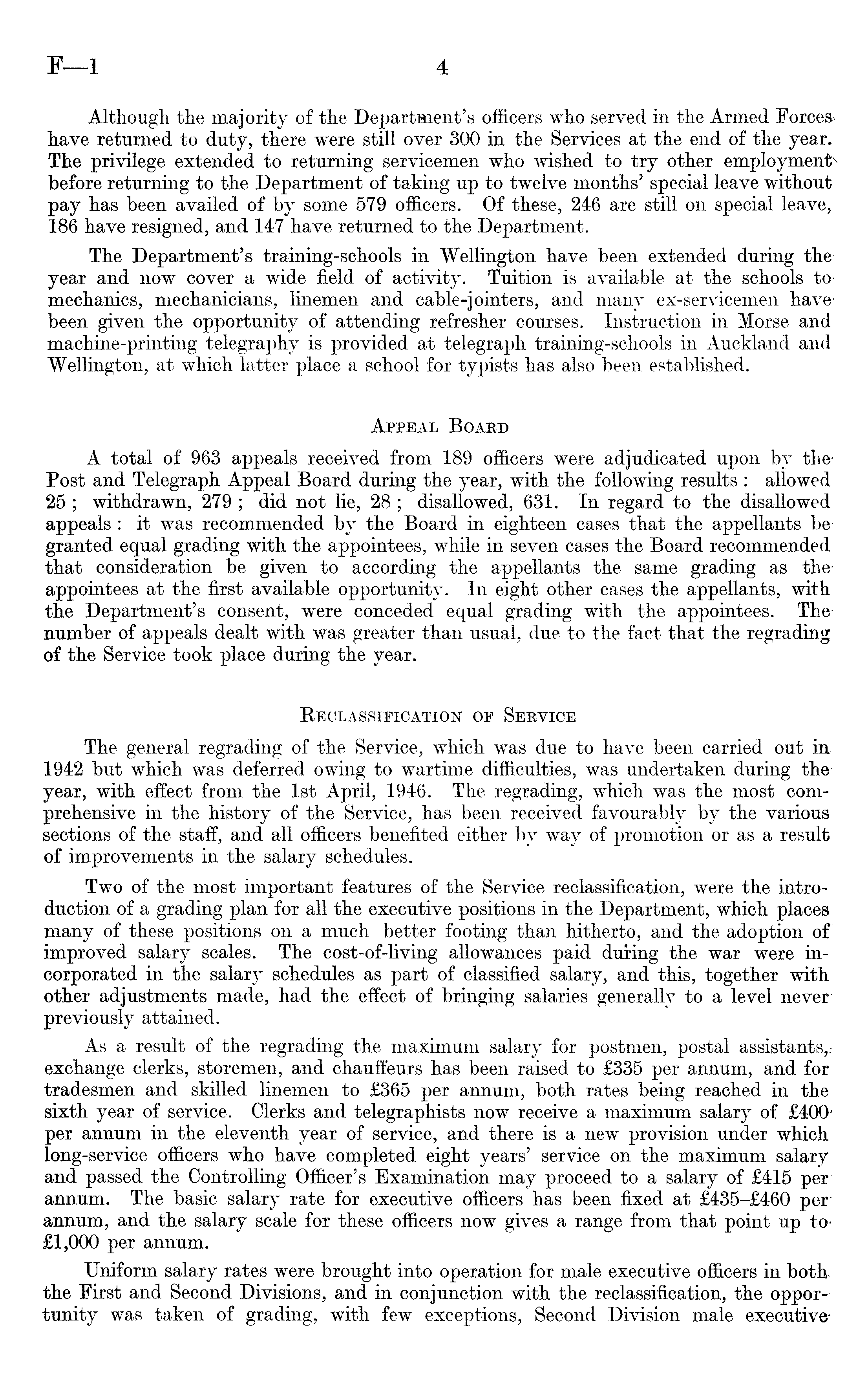 Although the majority of the Department's officers who served in the Armed Forceshave returned to duty, there were still over 300 in the Services at the end of the year. The privilege extended to returning servicemen who wished to try other before returning to the Department of taking up to twelve months' special leave without pay has been availed of by some 579 officers. Of these, 246 are still on special leave,. 186 have resigned, and 147 have returned to the Department. The Department's training-schools in Wellington have been extended during theyear and now cover a wide field of activity. Tuition is available at the schools tomechanics, mechanicians, linemen and cable-jointers, and many ex-servicemen havebeen given the opportunity of attending refresher courses. Instruction in Morse and machine-printing telegraphy is provided at telegraph training-schools in Auckland and Wellington, at which latter place a school for typists has also been established. Appeal Board A total of 963 appeals received from 189 officers were adjudicated upon by thePost and Telegraph Appeal Board during the year, with the following results : allowed 25 ; withdrawn, 279 ; did not lie, 28 ; disallowed, 631. In regard to the disallowed appeals : it was recommended by the Board in eighteen cases that the appellants begranted equal grading with the appointees, while in seven cases the Board recommended that consideration be given to according the appellants the same grading as theappointees at the first available opportunity- In eight other cases the appellants, with the Department's consent, were conceded equal grading with the appointees. The number of appeals dealt with was greater than usual, due to the fact that the regrading of the Service took place during the year. Reclassification of Service The general regrading of the Service, which was due to have been carried out in 1942 but which was deferred owing to wartime difficulties, was undertaken during the year, with effect from the Ist April, 1946. The regrading, which was the most comprehensive in the history of the Service, has been received favourably by the various sections of the staff, and all officers benefited either by way of promotion or as a result of improvements in the salary schedules. Two of the most important features of the Service reclassification, were the introduction of a grading plan for all the executive positions in the Department, which places many of these positions on a much better footing than hitherto, and the adoption of improved salary scales. The cost-of-living allowances paid during the war were incorporated in the salary schedules as part of classified salary, and this, together with other adjustments made, had the effect of bringing salaries generally to a level never previously attained. As a result of the regrading the maximum salary for postmen, postal assistants,.exchange clerks, storemen, and chauffeurs has been raised to £335 per annum, and for tradesmen and skilled linemen to £365 per annum, both rates being reached in the sixth year of service. Clerks and telegraphists now receive a maximum salary of £4oo' per annum in the eleventh year of service, and there is a new provision under which long-service officers who have completed eight years' service on the maximum salary and passed the Controlling Officer's Examination may proceed to a salary of £415 per annum. The basic salary rate for executive officers has been fixed at £435-£460 per annum, and the salary scale for these officers now gives a range from that point up to£l,ooo per annum. Uniform salary rates were brought into operation for male executive officers in both the First and Second Divisions, and in conjunction with the reclassification, the opportunity was taken of grading, with few exceptions, Second Division male executive-