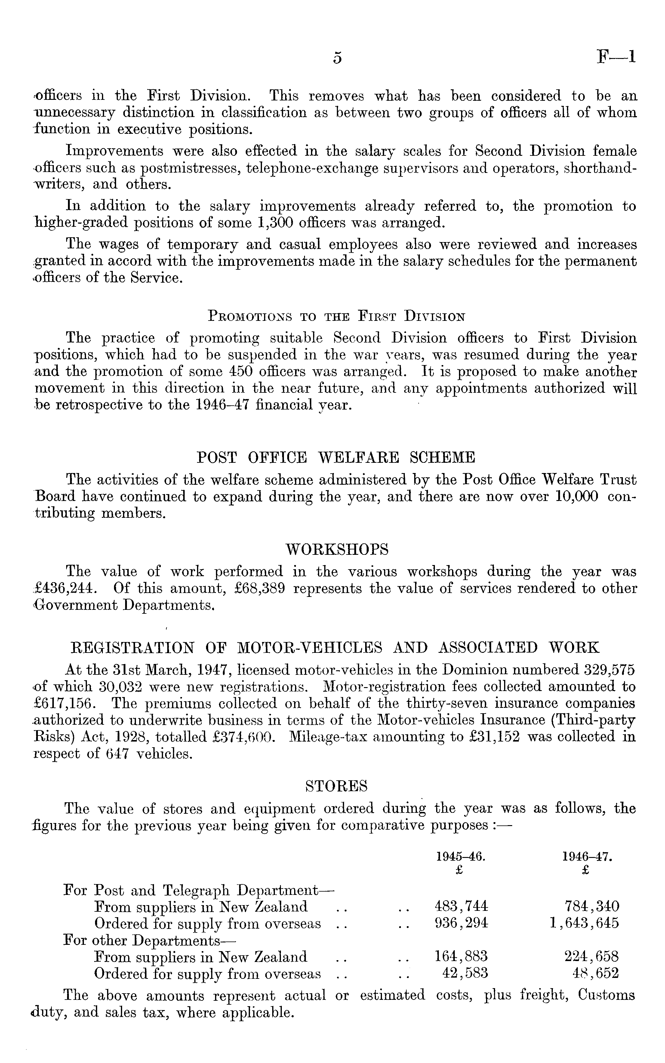 -officers in the First Division. This removes what has been considered to be an unnecessary distinction in classification as between two groups of officers all of whom function in executive positions. Improvements were also effected in the salary scales for Second Division female ■officers such as postmistresses, telephone-exchange supervisors and operators, shorthandwriters, and others. In addition to the salary improvements already referred to, the promotion to higher-graded positions of some 1,300 officers was arranged. The wages of temporary and casual employees also were reviewed and increases .granted in accord with the improvements made in the salary schedules for the permanent officers of the Service. Promotions to the First Division The practice of promoting suitable Second Division officers to First Division positions, which had to be suspended in the war years, was resumed during the year and the promotion of some 450 officers was arranged. It is proposed to make another movement in this direction in the near future, and any appointments authorized will •be retrospective to the 1946-47 financial year. POST OFFICE WELFARE SCHEME The activities of the welfare scheme administered by the Post Office Welfare Trust Board have continued to expand during the year, and there are now over 10,000 contributing members. WORKSHOPS The value of work performed in the various workshops during the year was £436,244. Of this amount, £68,389 represents the value of services rendered to other "Government Departments. REGISTRATION OF MOTOR-VEHICLES AND ASSOCIATED WORK At the 31st March, 1947, licensed motor-vehicles in the Dominion numbered 329,575 of which 30,032 were new registrations. Motor-registration fees collected amounted to £617,156. The premiums collected on behalf of the thirty-seven insurance companies .authorized to underwrite business in terms of the Motor-vehicles Insurance (Third-party Risks) Act, 1928, totalled £374,600. Mileage-tax amounting to £31,152 was collected in respect of 647 vehicles. STORES The value of stores and equipment ordered during the year was as follows, the figures for the previous year being given for comparative purposes : 1945-46. 1946-47. £ £ For Post and Telegraph Department — From suppliers in New Zealand .. .. 483,744 784,340 Ordered for supply from overseas .. .. 936,294 1,643,645 For other Departments — From suppliers in New Zealand .. .. 164,883 224,658 Ordered for supply from overseas .. .. 42,583 48,652 The above amounts represent actual or estimated costs, plus freight, Customs duty, and sales tax, where applicable.