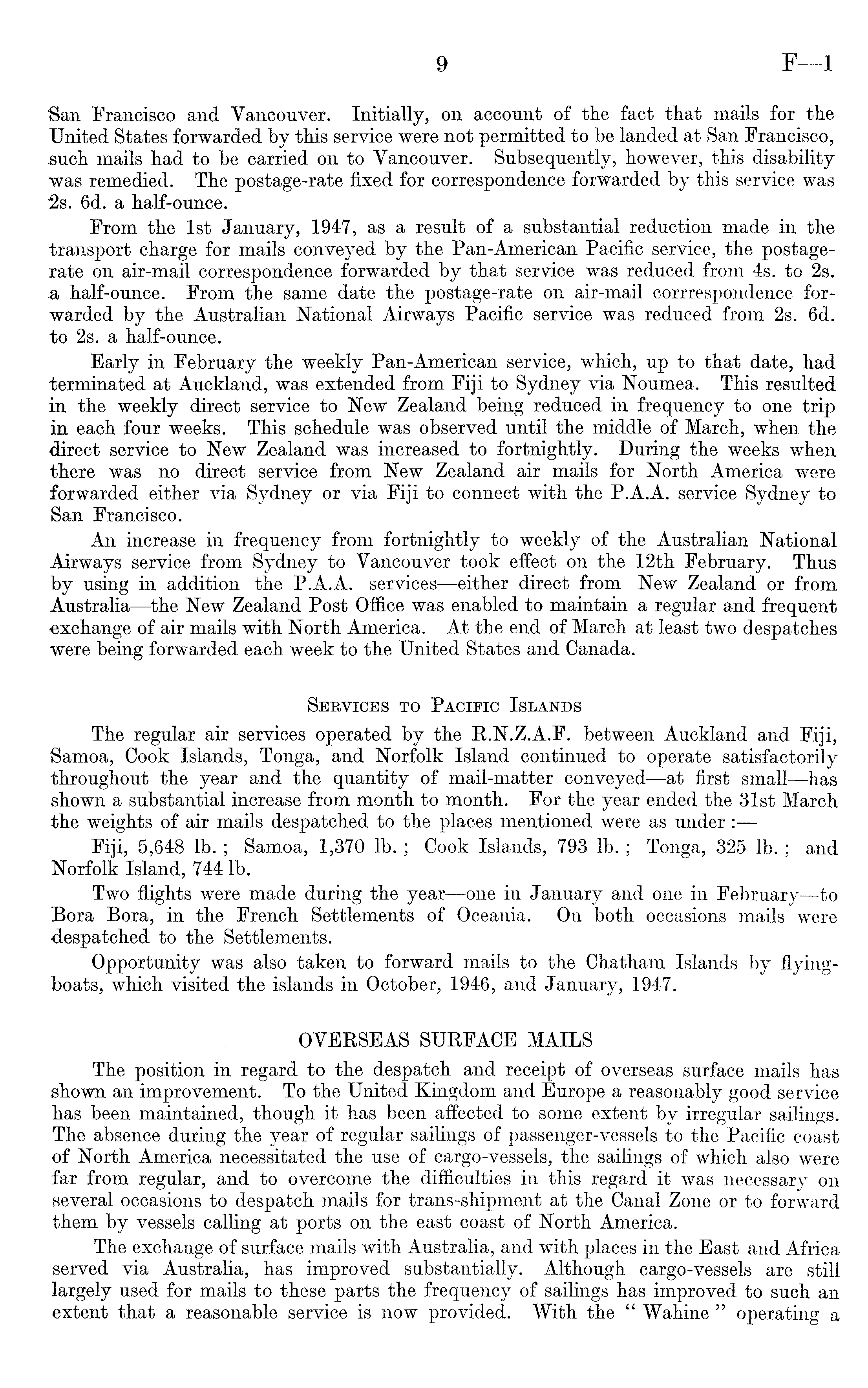 San Francisco and Vancouver. Initially, on account of tlie fact tliat mails for the United States forwarded by this service were not permitted to be landed at San Francisco, such mails had to be carried on to Vancouver. Subsequently, however, this disability was remedied. The postage-rate fixed for correspondence forwarded by this service was 2s. 6d. a half-ounce. From the Ist January, 1947, as a result of a substantial reduction made in the -transport charge for mails conveyed by the Pan-American Pacific service, the postagerate on air-mail correspondence forwarded by that service was reduced from 4s. to 2s. a half-ounce. From the same date the postage-rate on air-mail corrrespondence forwarded by the Australian National Airways Pacific service was reduced from 2s. 6d. to 2s. a half-ounce. Early in February the weekly Pan-American service, which, up to that date, had terminated at Auckland, was extended from Fiji to Sydney via Noumea. This resulted in the weekly direct service to New Zealand being reduced in frequency to one trip in each four weeks. This schedule was observed until the middle of March, when the ■direct service to New Zealand was increased to fortnightly. During the weeks when there was no direct service from New Zealand air mails for North America were forwarded either via Sydney or via Fiji to connect with the P.A.A. service Sydney to San Francisco. An increase in frequency from fortnightly to weekly of the Australian National Airways service from Sydney to Vancouver took effect on the 12th February. Thus by using in addition the P.A.A. services—either direct from New Zealand or from Australia—the New Zealand Post Office was enabled to maintain a regular and frequent exchange of air mails with North America. At the end of March at least two despatches were being forwarded each week to the United States and Canada. Services to Pacific Islands The regular air services operated by the R.N.Z.A.F. between Auckland and Fiji, Samoa, Cook Islands, Tonga, and Norfolk Island continued to operate satisfactorily throughout the year and the quantity of mail-matter conveyed —at first small —has shown a substantial increase from month to month. For the year ended the 31st March the weights of air mails despatched to the places mentioned were as under : Fiji, 5,648 lb. ; Samoa, 1,370 lb. ; Cook Islands, 793 lb.; Tonga, 325 lb.; and Norfolk Island, 744 lb. Two flights were made during the year —one in January and one in February —to Bora Bora, in the French Settlements of Oceania. On both occasions mails were despatched to the Settlements. Opportunity was also taken to forward mails to the Chatham Islands by flyingboats, which visited the islands in October, 1946, and January, 1947. OVERSEAS SURFACE MAILS The position in regard to the despatch and receipt of overseas surface mails has £hown an improvement. To the United Kingdom and Europe a reasonably good service has been maintained, though it has been affected to some extent by irregular sailings. The absence during the year of regular sailings of passenger-vessels to the Pacific coast of North America necessitated the use of cargo-vessels, the sailings of which also were far from regular, and to overcome the difficulties in this regard it was necessary on several occasions to despatch mails for trans-shipment at the Canal Zone or to forward them by vessels calling at ports on the east coast of North America. The exchange of surface mails with Australia, and with places in the East and Africa served via Australia, has improved substantially. Although cargo-vessels are still largely used for mails to these parts the frequency of sailings has improved to such an extent that a reasonable service is now provided. With the " Wahine " operating a
