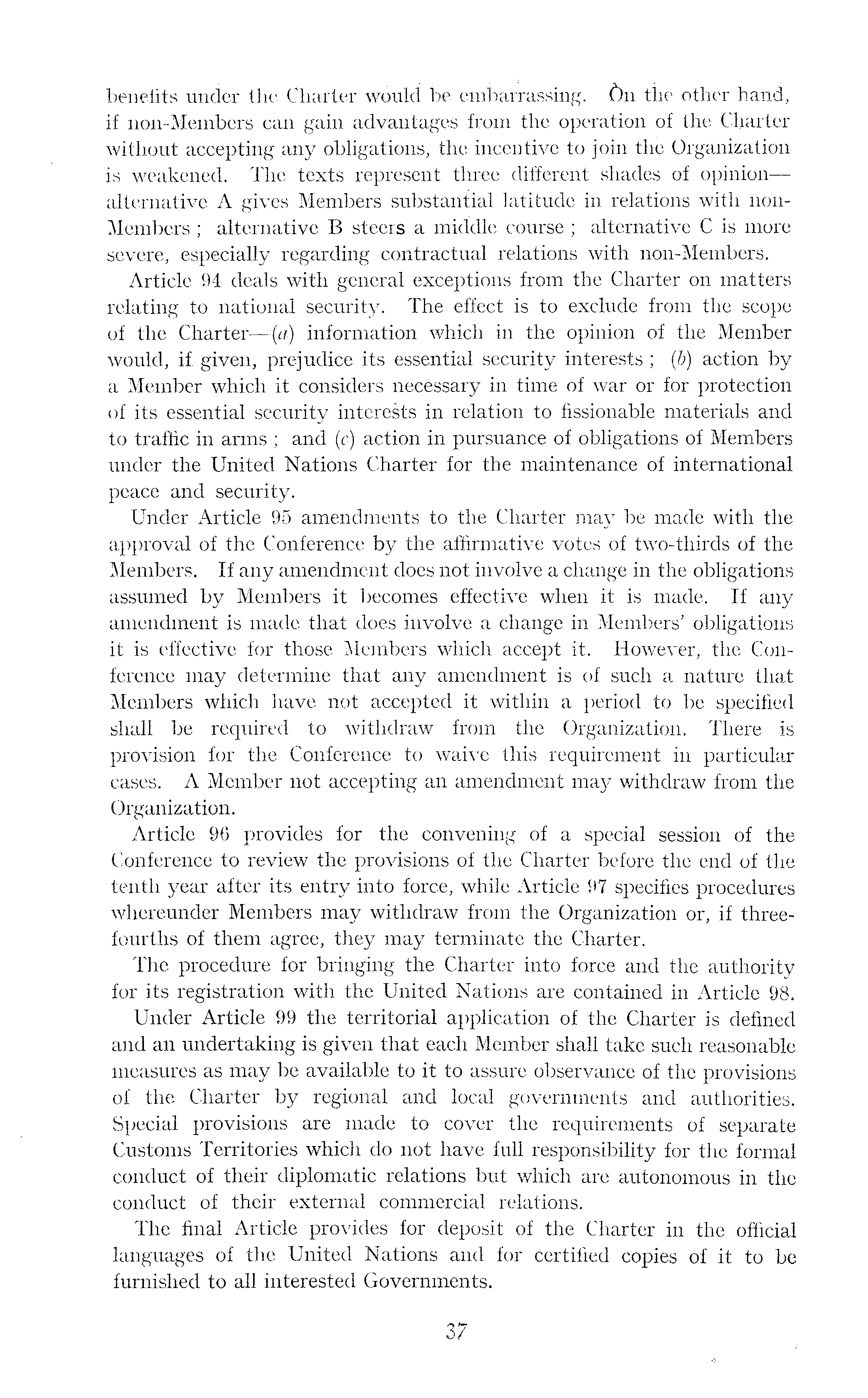 benefits under the Charter wouid fee embarrassing. 6n the other hand, if non-Members can gain advantages from the operation of the Charter without accepting any obligations, the incentive to join the Organization is weakened. The texts represent three different shades of opinion—alternative A gives Members substantial latitude in relations with nonMembers ; alternative B steers a middle course ; alternative C is more severe, especially regarding contractual relations with non-Members. Article 94 deals with general exceptions from the Charter on matters relating to national security. The effect is to exclude from the scope of the Charter —{a) information which in the opinion of the Member would, if..given, prejudice its essential security interests ; (b) action by a Member which it considers necessary in time of war or for protection of its essential security interests in relation to fissionable materials and to traffic in arms ; and (c) action in pursuance of obligations of Members under the United Nations Charter for the maintenance of international peace and security. Under Article 95 amendments to the Charter may be made with the approval of the Conference by the affirmative votes of two-thirds of the Members. If any amendment does not involve a change in the obligations assumed by Members it becomes effective when it is made. If any amendment is made that does involve a change in Members' obligations it is effective for those Members which accept it. However, the Conference may determine that any amendment is of such a nature that Members which have not accepted it within a period to be specified shall be required to withdraw from the Organization. There is provision for the Conference to waive this requirement in particular cases. A Member not accepting an amendment may withdraw from the Organization. Article 96 provides for the convening of a special session of the Conference to review the provisions of the Charter before the end of the tenth year after its entry into force, while Article 97 specifies procedures whereunder Members may withdraw from the Organization or, if threefourths of them agree, they may terminate the Charter. The procedure for bringing the Charter into force and the authority for its registration with the United Nations are contained in Article 98. Under Article 99 the territorial application of the Charter is defined and an undertaking is given that each Member shall take such reasonable measures as may be available to it to assure observance of the provisions of the Charter by regional and local governments and authorities. Special provisions are made to cover the requirements of separate Customs Territories which do not have full responsibility for the formal conduct of their diplomatic relations but which are autonomous in the conduct of their external commercial relations. The final Article provides for deposit of the Charter in the official languages of the United Nations and for certified copies of it to be furnished to all interested Governments.