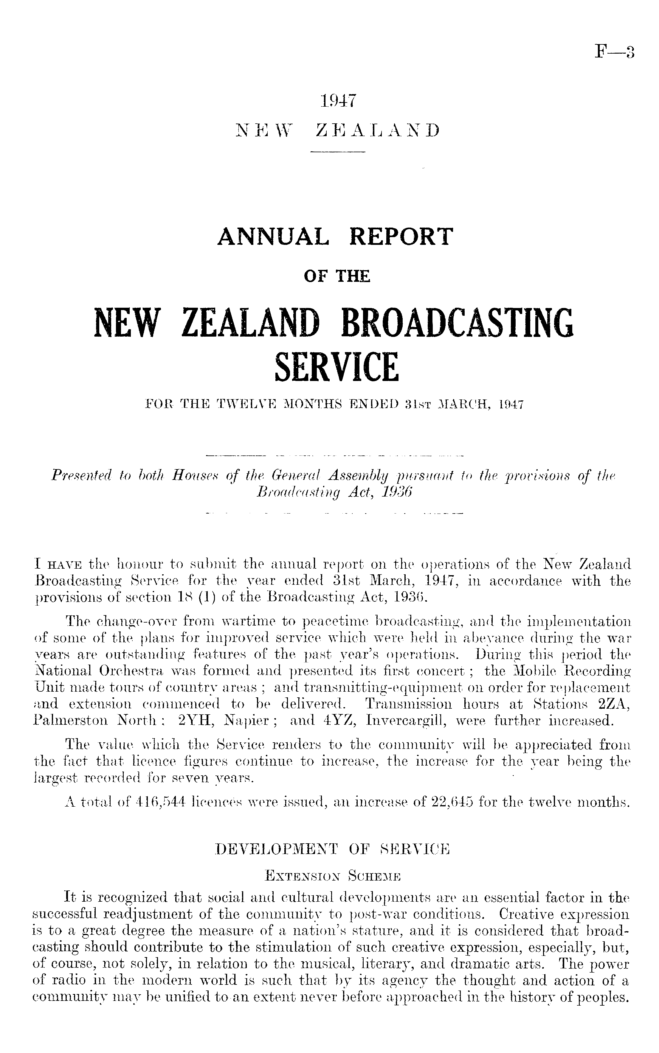 I have the honour to submit the annual report on the operations of the New Zealand Broadcasting Service for the year ended 31st March, 1947, in accordance with the provisions of section 18 (1) of the Broadcasting Act, 1936. The change-over from wartime to peacetime broadcasting, and the implementation of some of the plans for improved service which were held in abeyance during the war years are outstanding features of the past year's operations. During this period the National Orchestra was formed and presented its first concert; the Mobile Recording Unit made tours of country areas ; and transmitting-equipment on order for replacement and extension commenced to be delivered. Transmission hours at Stations 2ZA, Palmerston North ; 2YH, Napier ; and 4YZ, Invercargill, were further increased. The value which the Service renders to the community will be appreciated from the fact that licence figures continue to increase, the increase for the year being the largest recorded for seven years. A total of 416,544 licences were issued, an increase of 22,645 for the twelve months. DEVELOPMENT OF SERVICE Extension Scheme It is recognized that social and cultural developments are an essential factor in the successful readjustment of the community to post-war conditions. Creative expression is to a great degree the measure of a nation's stature, and it is considered that broadcasting should contribute to the stimulation of such creative expression, especially, but, of course, not solely, in relation to the musical, literary, and dramatic arts. The power of radio in the modern world is such that by its agency the thought and action of a community may be unified to an extent never before approached in the history of peoples.