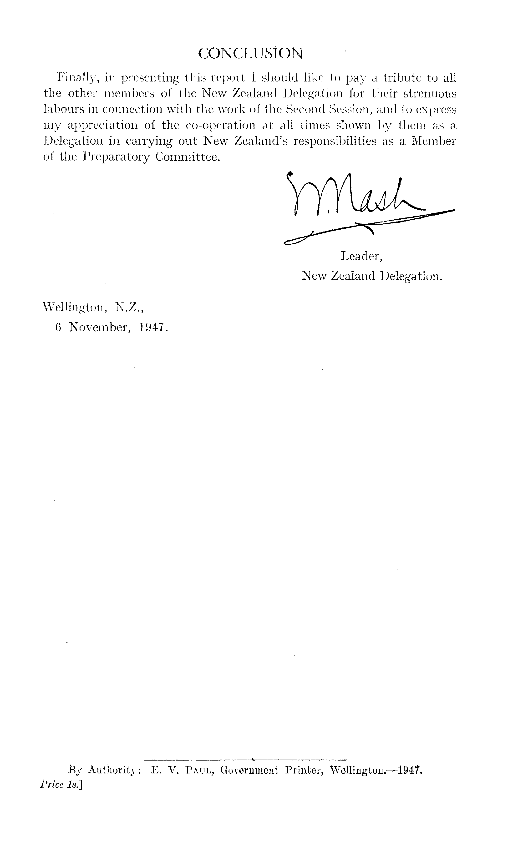 CONCLUSION Finally, in presenting this report I should like to pay a tribute to all the other members of the New Zealand Delegation for their strenuous labours in connection with the work of the Second Session, and to express my appreciation of the co-operation at all times shown by them as a Delegation in carrying out New Zealand's responsibilities as a Member of the Preparatory Committee. VtTW Leader, New Zealand Delegation. Wellington, N.Z., 6 November, 1947. By Authority: E. Y. Paul, Government Printer, Wellington.—l 947. Price Is.]