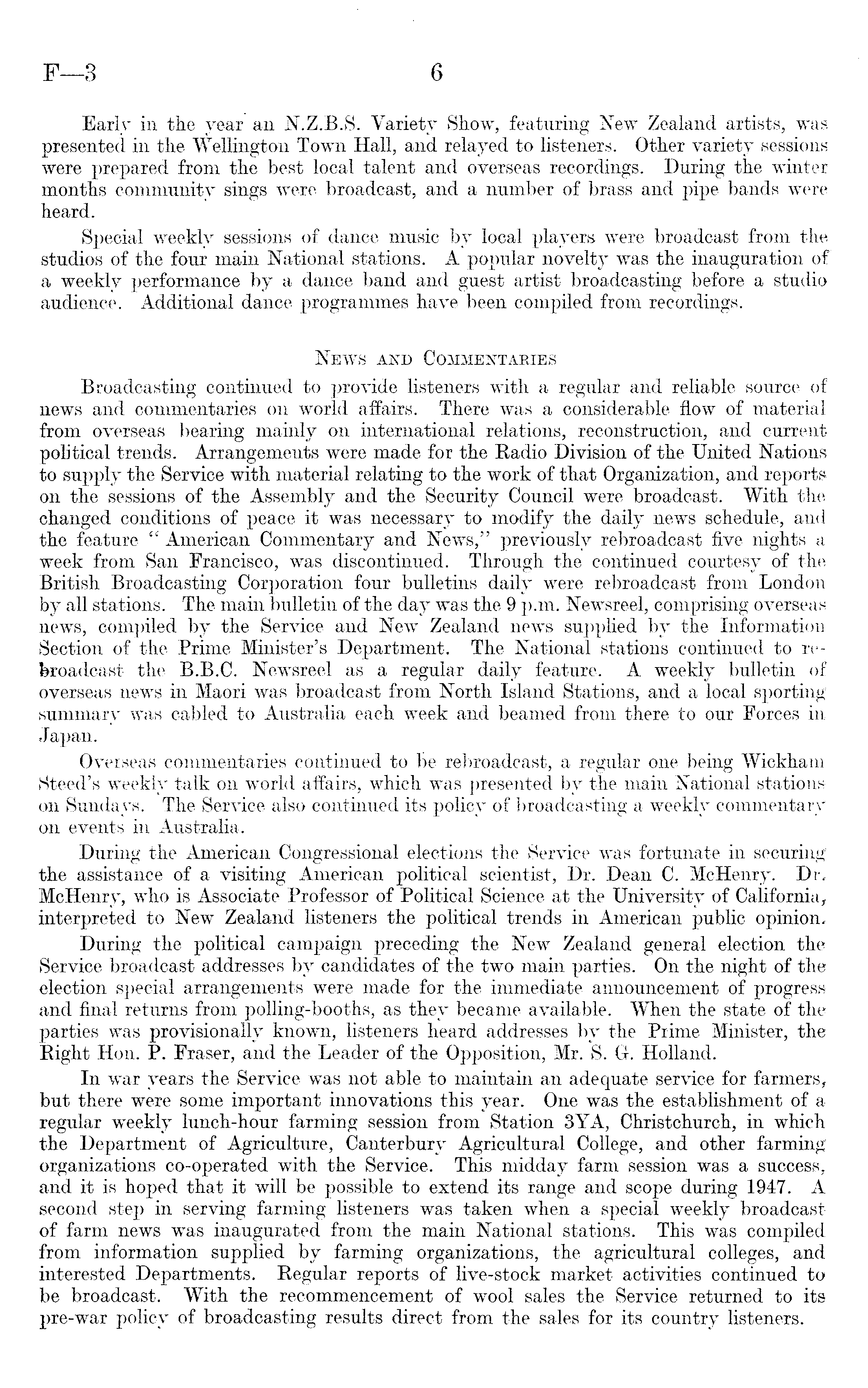Early in the year an N.Z.B.S. Variety Show, featuring New Zealand artists, was presented in the Wellington Town Hall, and relayed to listeners. Other variety sessionswere prepared from the best local talent and overseas recordings. During the winter months community sings were broadcast, and a number of brass and pipe bands were heard. Special weekly sessions of dance music by local players were broadcast from the studios of the four main National stations. A popular novelty was the inauguration of a weekly performance by a dance band and guest artist broadcasting before a studio audience. Additional dance programmes have been compiled from recordings. News and Commentaries Broadcasting continued to provide listeners with a regular and reliable source of news and commentaries on world affairs. There was a considerable flow of material from overseas bearing mainly on international relations, reconstruction, and current political trends. Arrangements were made for the Radio Division of the United Nations to supply the Service with material relating to the work of that Organization, and reports on the sessions of the Assembly and the Security Council were broadcast. With the changed conditions of peace it was necessary to modify the daily news schedule, and the feature " American Commentary and News," previously rebroadcast five nights a week from San Francisco, was discontinued. Through the continued courtesy of the British Broadcasting Corporation four bulletins daily were rebroadcast from London by all stations. The main bulletin of the day was the 9 p.m. Newsreel, comprising overseas news, compiled by the Service and New Zealand news supplied by the Information Section of the Prime Minister's Department. The National stations continued to referoadcast the 8.8.C. Newsreel as a regular daily feature. A weekly bulletin of overseas news in Maori was broadcast from North Island Stations, and a local sporting summary was cabled to Australia each week and beamed from there to our Forces in Japan. Overseas commentaries continued to be rebroadcast, a regular one being Wickham Steed's weekly talk on world affairs, which was presented by the main National stations on Sundays. The Service also continued its policy of broadcasting a weekly commentary on events in Australia. During the American Congressional elections the Service was fortunate in securing the assistance of a visiting American political scientist, Dr. Dean C. McHenry. Dr, McHenry, who is Associate Professor of Political Science at the University of California, interpreted to New Zealand listeners the political trends in American public opinion. During the political campaign preceding the New Zealand general election the Service broadcast addresses by candidates of the two main parties. On the night of the election special arrangements were made for the immediate announcement of progress and final returns from polling-booths, as they became available. When the state of the parties was provisionally known, listeners heard addresses by the Prime Minister, the Right Hon. P. Fraser, and the Leader of the Opposition, Mr. S. G. Holland. In war years the Service was not able to maintain an adequate service for farmers, but there were some important innovations this year. One was the establishment of a regular weekly lunch-hour farming session from Station 3YA, Christchurch, in which the Department of Agriculture, Canterbury Agricultural College, and other farming organizations co-operated with the Service. This midday farm session was a success, and it is hoped that it will be possible to extend its range and scope during 1947. A second step in serving farming listeners was taken when a special weekly broadcast of farm news was inaugurated from the main National stations. This was compiled from information supplied by farming organizations, the agricultural colleges, and interested Departments. Regular reports of live-stock market activities continued to be broadcast. With the recommencement of wool sales the Service returned to its pre-war policy of broadcasting results direct from the sales for its country listeners.