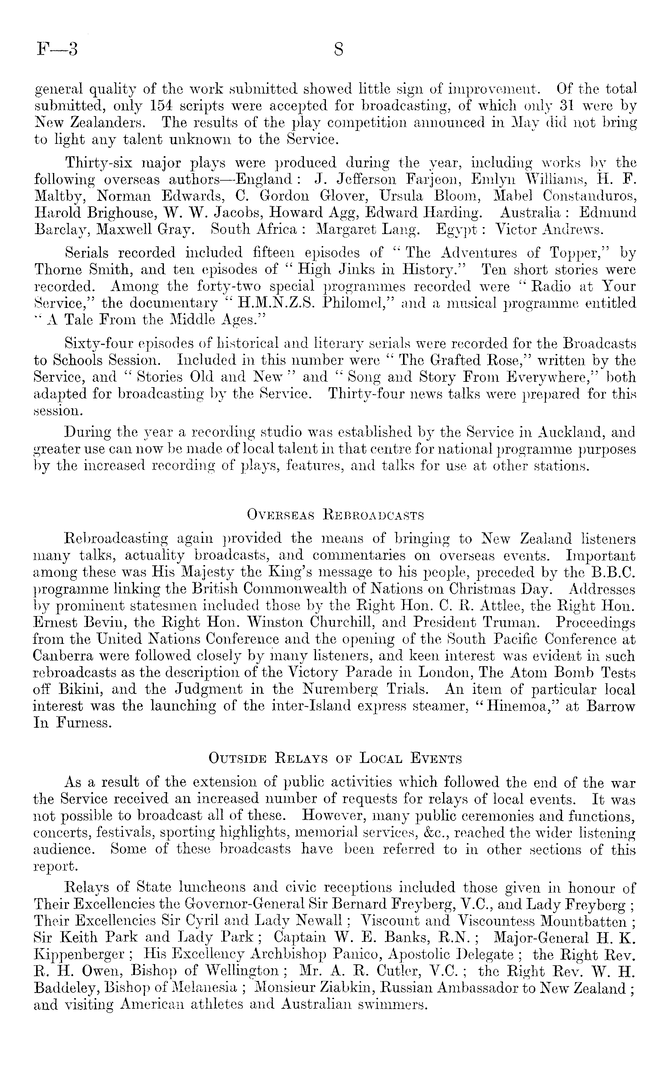 general quality of the work submitted showed little sign of improvement. Of the total submitted, only 154 scripts were accepted for broadcasting, of which only 31 were by New Zealanders. The results of the play competition announced in May did not bring to light any talent unknown to the Service. Thirty-six major plays were produced during the year, including works by the following overseas authors—England : J. Jefferson Farjeon, Emlyn Williams, H. F. Maltby, Norman Edwards, C. Gordon Glover, Ursula Bloom, Mabel Constanduros, Harold Brighouse, W. W. Jacobs, Howard Agg, Edward Harding. Australia : Edmund Barclay, Maxwell Gray. South Africa : Margaret Lang. Egypt: Victor Andrews. Serials recorded included fifteen episodes of " The Adventures of Topper," by Thorne Smith, and ten episodes of " High Jinks in History." Ten short stories were recorded. Among the forty-two special programmes recorded were " Radio at Your Service," the documentary " H.M.N.Z.S. Philomel," and a musical programme entitled " A Tale From the Middle Ages." Sixty-four episodes of historical and literary serials were recorded for the Broadcasts to Schools Session. Included in this number were " The Grafted Rose," written by the Service, and " Stories Old and New " and " Song and Story From Everywhere," both adapted for broadcasting by the Service. Thirty-four news talks were prepared for this session. During the year a recording studio was established by the Service in Auckland, and greater use can now be made of local talent in that centre for national programme purposes by the increased recording of plays, features, and talks for use at other stations. Overseas Rebroadcasts Rebroadcasting again provided the means of bringing to New Zealand listeners many talks, actuality broadcasts, and commentaries on overseas events. Important among these was His Majesty the King's message to his people, preceded by the 8.8.C. programme linking the British Commonwealth of Nations on Christmas Day. Addresses by prominent statesmen included those by the Right Hon. C. R. Attlee, the Right Hon. Ernest Bevin, the Right Hon. Winston Churchill, and President Truman. Proceedings from the United Nations Conference and the opening of the South Pacific Conference at Canberra were followed closely by many listeners, and keen interest was evident in such rebroadcasts as the description of the Victory Parade in London, The Atom Bomb Tests off Bikini, and the Judgment in the Nuremberg Trials. An item of particular local interest was the launching of the inter-Island express steamer, " Hinemoa," at Barrow In Furness. Outside Relays of Local Events As a result of the extension of public activities which followed the end of the war the Service received an increased number of requests for relays of local events. It was not possible to broadcast all of these. However, many public ceremonies and functions, concerts, festivals, sporting highlights, memorial services, &c., reached the wider listening audience. Some of these broadcasts have been referred to in other sections of this report. Relays of State luncheons and civic receptions included those given in honour of Their Excellencies the Governor-General Sir Bernard Freyberg, V.C., and Lady Freyberg ; Their Excellencies Sir Cyril and Lady Newall; Viscount and Viscountess Mountbatten ; Sir Keith Park and Lady Park; Captain W. E. Banks, R.N.; Major-General H. K. Kippenberger ; His Excellency Archbishop Panico, Apostolic Delegate ; the Right Rev. R. H. Owen, Bishop of Wellington ; Mr. A. R. Cutler, V.C. ; the Right Rev. W. H. Baddeley, Bishop of Melanesia ; Monsieur Ziabkin, Russian Ambassador to New Zealand ; and visiting American athletes and Australian swimmers.