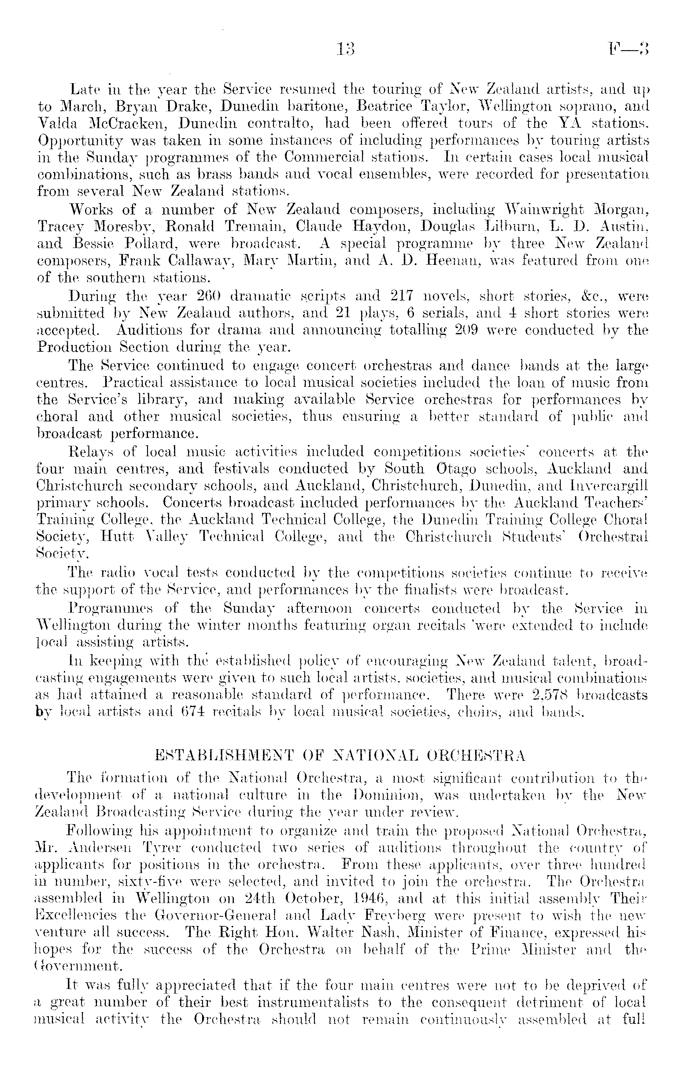 Late in the year the Service resumed the touring of New Zealand artists, and up to March, Bryan Drake, Dunedin baritone, Beatrice Taylor, Wellington soprano, and Valda McCracken, Dunedin contralto, had been offered tours of the YA stations. Opportunity was taken in some instances of including performances by touring artists in the Sunday programmes of the Commercial stations. In certain cases local musical combinations, such as brass bands and vocal ensembles, were recorded for presentation from several New Zealand stations. Works of a number of New Zealand composers, including Wainwright Morgan, Tracey Moresby, Ronald Tremain, Claude Haydon, Douglas Lilburn, L. D. Austin, and Bessie Pollard, were broadcast. A special programme by three New Zealand composers, Frank Callaway, Mary Martin, and A. D. Heenan, was featured from one of the southern stations. During the year 260 dramatic scripts and 217 novels, short stories, &c., were submitted by New Zealand authors, and 21 plays, 6 serials, and 4 short stories were accepted. Auditions for drama and announcing totalling 209 were conducted by the Production Section during the year. The Service continued to engage concert orchestras and dance bands at the large centres. Practical assistance to local musical societies included the loan of music from the Service's library, and making available Service orchestras for performances by choral and other musical societies, thus ensuring a better standard of public and broadcast performance. Relays of local music activities included competitions societies' concerts at the four main centres, and festivals conducted by South Otago schools, Auckland and Christchurch secondary schools, and Auckland, Christchurch, Dunedin, and Invercargill primary schools. Concerts broadcast included performances by the Auckland Teachers' Training College, the Auckland Technical College, the Dunedin Training College Choral Society, Hutt Yalley Technical College, and the Christchurch Students' Orchestral Society. The radio vocal tests conducted by the competitions societies continue to receive the support of the Service, and performances by the finalists were broadcast. Programmes of the Sunday afternoon concerts conducted by the Service in Wellington during the winter months featuring organ recitals 'were extended to include local assisting artists. In keeping with the established policy of encouraging New Zealand talent, broadcasting engagements were given to such local artists, societies, and musical combinations as had attained a reasonable standard of performance. There were 2,578 broadcasts by local artists and 674 recitals by local musical societies, choirs, and bands. ESTABLISHMENT OF NATIONAL ORCHESTRA The formation of the National Orchestra, a most significant contribution to the development of a national culture in the Dominion, was undertaken by the New Zealand Broadcasting Service during the year under review. Following his appointment to organize and train the proposed National Orchestra, Mr. Andersen Tyrer conducted two series of auditions throughout the country of applicants for positions in the orchestra. From these applicants, over three hundred in number, sixty-five were selected, and invited to join the orchestra. The Orchestra assembled in Wellington on 24th October, 1946, and at this initial assembly Their Excellencies the Governor-General and Lady Freyberg were present to wish the new venture all. success. The Right Hon. Walter Nash, Minister of Finance, expressed his hopes for the success of the Orchestra on behalf of the Prime Minister and the Government. It was fully appreciated that if the four main centres were not to be deprived of a great number of their best instrumentalists to the consequent detriment of local musical activity the Orchestra should not remain continuously assembled at full