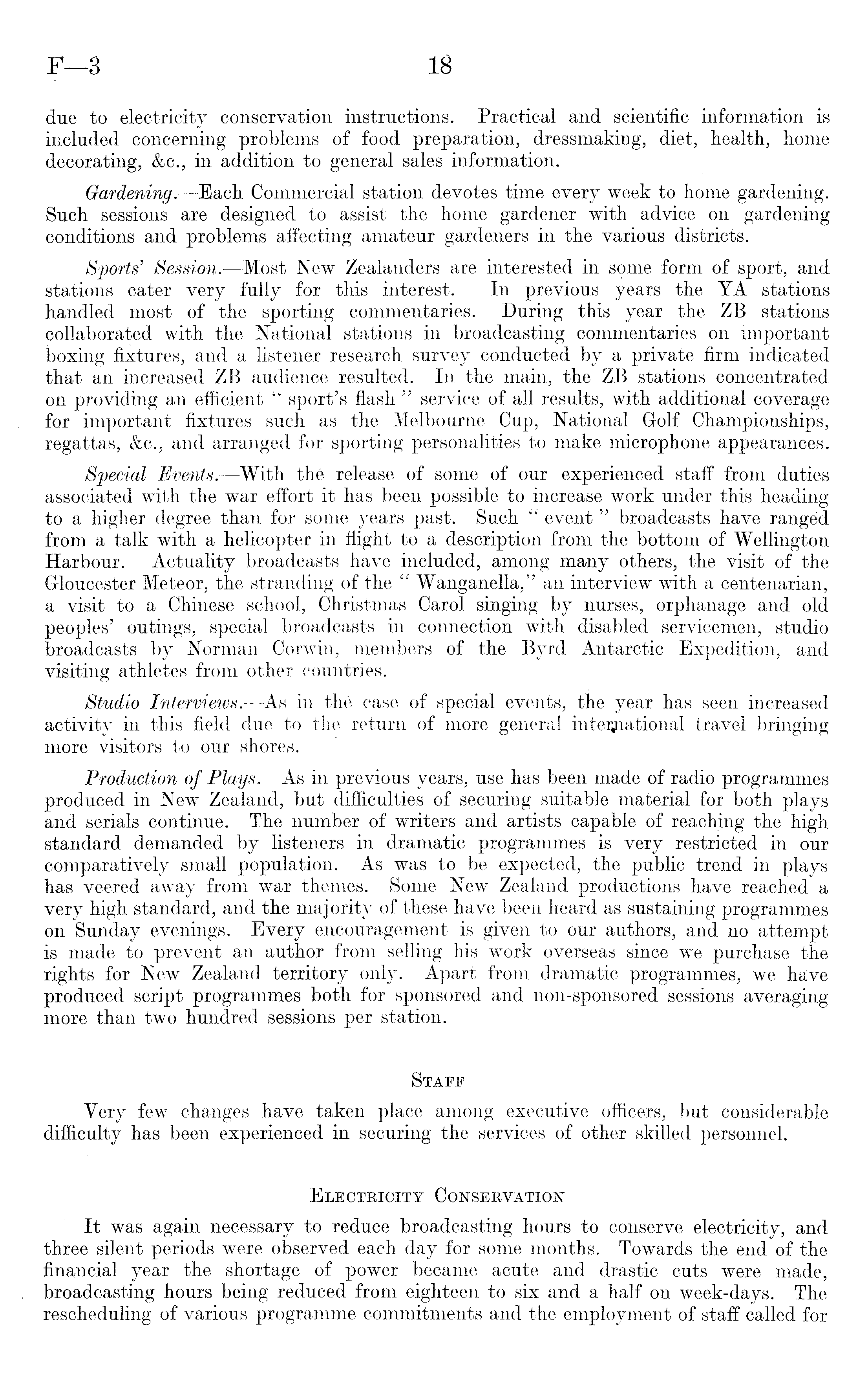 due to electricity conservation instructions. Practical and scientific information is included concerning problems of food preparation, dressmaking, diet, health, home decorating, &c./in addition to general sales information. Gardening.—Each ,Commercial station devotes time every week to home gardening. Such sessions are designed to assist the home gardener with advice on gardening conditions and problems affecting amateur gardeners in the various districts. Sports' Session. —Most New Zealanders are interested in some form of sport, and stations cater very fully for 'this interest. In previous years the YA stations handled most of the sporting commentaries. During this year the ZB stations collaborated with the National stations in broadcasting commentaries on important boxing fixtures, and a listener research survey conducted by a private firm indicated that an increased ZB audience resulted. In the main, the ZB stations concentrated on providing an efficient " sport's flash " service of all results, with additional coverage for important .fixtures such as the Melbourne Cup, National Golf Championships, regattas, &c., and arranged for sporting personalities to make microphone appearances. Events. —With the release of some of our experienced staff from duties associated with the war effort it has been possible to increase work under this heading to a higher degree than for some years past. Such " event" broadcasts have ranged from a talk with a helicopter in flight to a description from the bottom of Wellington Harbbur. Actuality broadcasts have included, among many others, the visit of the Gloucester Meteor, the stranding of the " Wanganella," an interview with a centenarian, a visit to a Chinese school, Christmas Carol singing by nurses, orphanage and old peoples' outings* special broadcasts in connection with disabled servicemen, studio broadcasts by Norman Corwin, members of the Byrd Antarctic Expedition, and 'visiting athletes from other countries. . Studio Interviews. —As in the case of special events, the year has 1 seen increased activity in this field due_to the return of more general international travel bringing more Visitors to our shores. Production of Plays.—As in previous years, use has been made of radio programmes produced in New Zealand, but difficulties of securing suitable material for both plays and serials continue. The number of writers and artists capable of reaching the high •standard demanded by listeners in dramatic programmes is very restricted in our coihparatively small population. As was to be expected, the public trend in plays has veered away from war themes. Some New Zealand productions have reached a very high standard, and the majority of these have been heard as sustaining programmes on Sunday evenings. Every encouragement is given to our authors, and no attempt is made to prevent an author from selling his work overseas since we purchase the rights for New Zealand territory only. Apart from dramatic programmes, we have produced script programmes both for sponsored and non-sponsored sessions averaging more than two hundred sessions per station. Staff % Very few changes have taken place among executive officers, but considerable difficulty has been experienced in securing the services of other skilled personnel. Electricity Conservation It was again necessary to reduce broadcasting hours to conserve electricity, and three silent periods were observed each day for some months. Towards the end of'the financial year the shortage of power became acute and drastic cuts were made, broadcasting hours being reduced from eighteen to six and a half on week-days. The •rescheduling of' various programme commitments and the employment of staff called for