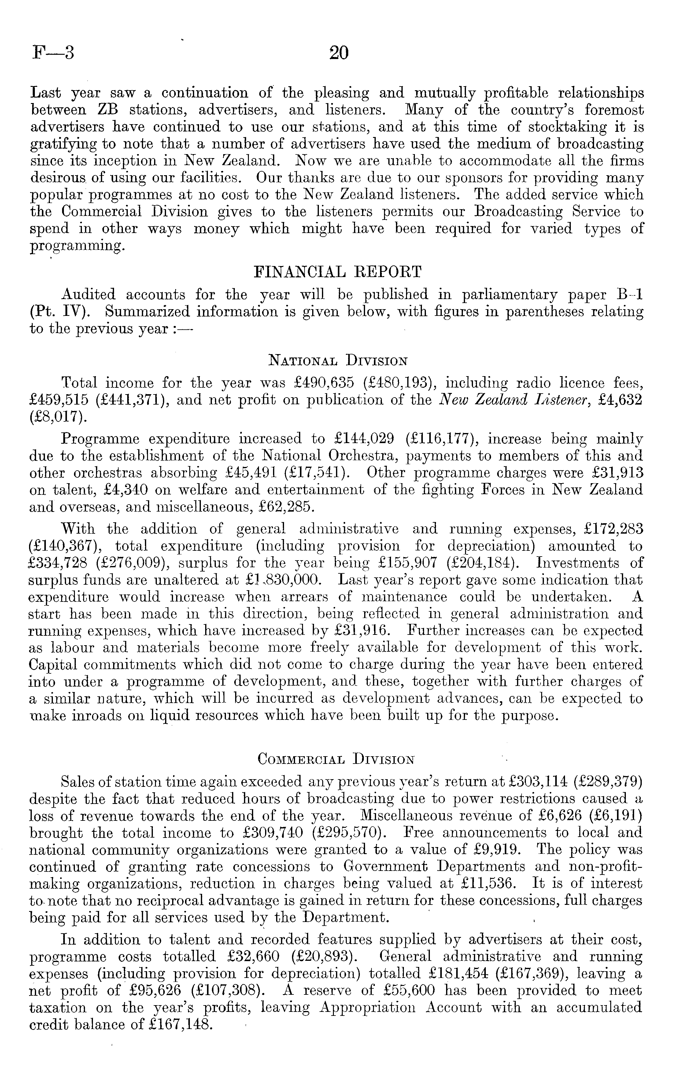 Last year saw a continuation of the pleasing and mutually profitable relationships between ZB stations, advertisers,, and listeners. Many of the country's foremost advertisers have continued to use our stations, and at this time of stocktaking it is gratifying to note that a number of advertisers have used the medium of broadcasting since its inception in New Zealand, Now we are unable to accommodate all the firms desirous, of using our facilities. Our thanks are due to our sponsors for providing many popular programmes at no cost to the New Zealand listeners. The added service which the Commercial Division gives to the listeners permits our Broadcasting Service to spend in other ways money which might have been required for varied types of programming. FINANCIAL REPORT Audited accounts for the year will be published in parliamentary paper B-l (Pt. IY). Summarized information is given below, with figures in parentheses relating to the previous year : National Division, Total income for the year was £490,635 (£480,193), including radio licence fees, £459,515 (£441,371), and net profit on publication of the New Zealand Listener, £4,632 (£8,017). . Programme expenditure increased to £144,029 (£116,177), increase being mainly due to the establishment of the National Orchestra, payments to members of this and other orchestras absorbing £45,491 (£17,541). Other programme charges were £31,913 on talent, £4,340 on welfare and entertainment of the fighting Forces in New Zealand and* overseas, and miscellaneous, £62,285. With the addition of general administrative and running expenses, £172,283 (£140,367), total expenditure (including provision for depreciation) amounted to £334,728 (£276,009), surplus for the year being £155,907 (£204,184). Investments of surplus funds are unaltered at £1,830",000. Last year's report gave some indication that expenditure would increase when arrears of maintenance could be undertaken. A start-has been made in this%direction, being reflected in general administration and running expenses, which have increased by £31,916. Further increases can be expected as labour and materials become more freely available for development of this work. Capital commitments which did not come to charge during the year have been entered into under a programme of development, and these, together with further charges Of a similar nature, which will be incurred as development advances, can be expected to make inroads on liquid resources which have been built up for the purpose. Commercial Division Sales of station time again exceeded any previous year's return at £303,114 (£289,379) despite the fact that reduced hours of broadcasting due to power restrictions caused a loss of revenue towards the end of the year. Miscellaneous revenue of £6,626 (£6,191) brought the total income to £309,740 (£295,570). Free announcements to local and national community organizations were granted to a value of £9,919. The policy was 'continued of .granting rate concessions to Government Departments and non-profit-'making organizations, reduction in charges being valued at £11,536. It is of interest to, note that no reciprocal advantage is gained in return for these concessions, full charges being paid for all services used by the Department. s '' In addition to talent and recorded features supplied by advertisers at their cost, programme costs totalled £32,660 (£20,893). General administrative and running expenses (including provision for depreciation) totalled £181,454 (£167,369), leaving a net profit of £95,626 (£107,308). A reserve of £55,600 has been provided to meet taxation on the year's profits, leaving Appropriation Account \tith an accumulated credit balance of £167,148.