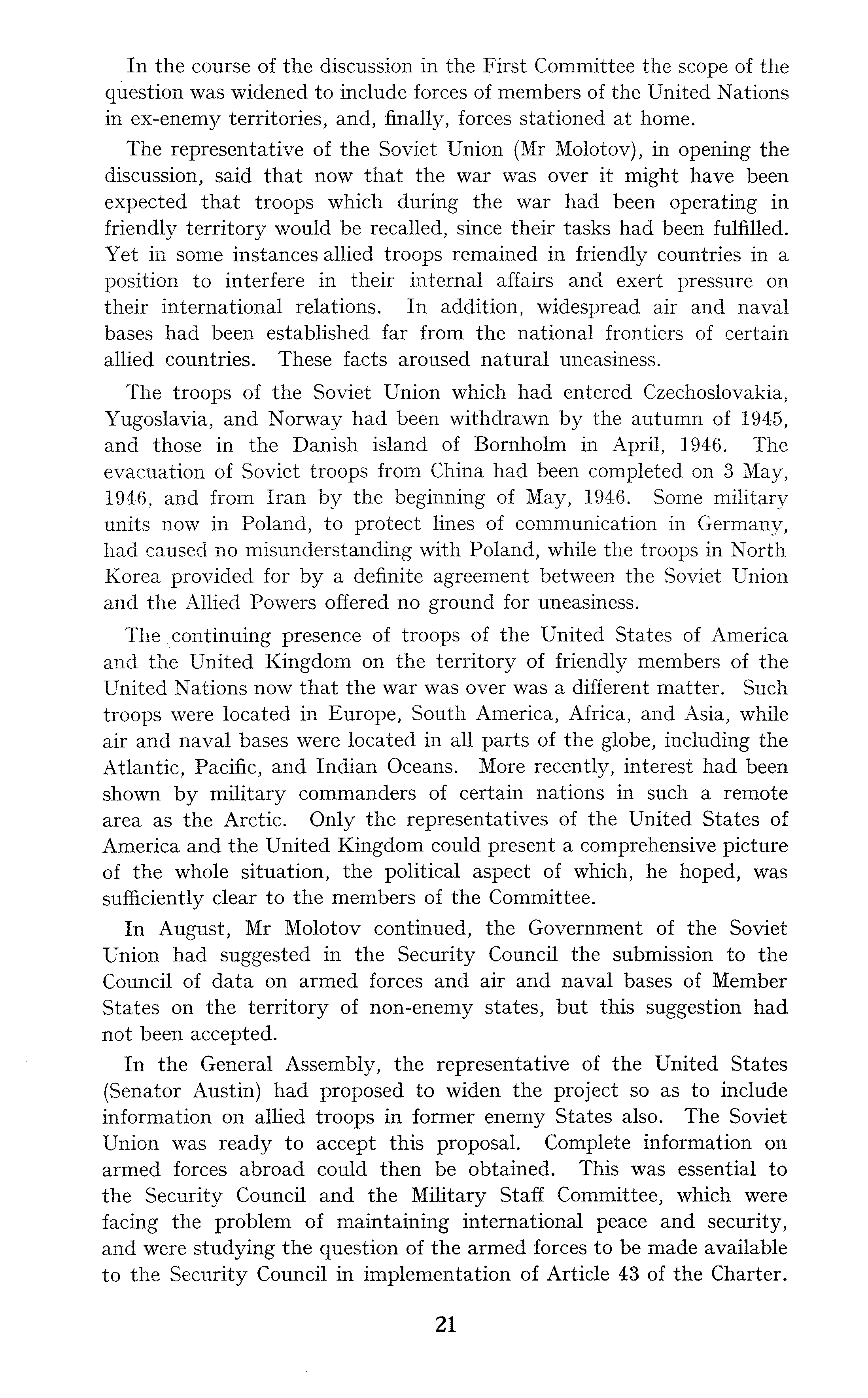 In the course of the discussion in the First Committee the scope of the question was widened to include forces of members of the United Nations in ex-enemy territories, and, finally, forces stationed at home. The representative of the Soviet Union (Mr Molotov), in opening the discussion, said that now that the war was over it might have been expected that troops which during the war had been operating in friendly territory would be recalled, since their tasks had been fulfilled. Yet in some instances allied troops remained in friendly countries in a position to interfere in their internal affairs and exert pressure on their international relations. In addition, widespread air and naval bases had been established far from the national frontiers of certain allied countries. These facts aroused natural uneasiness. The troops of the Soviet Union which had entered Czechoslovakia, Yugoslavia, and Norway had been withdrawn by the autumn of 1945, and those in the Danish island of Bornholm in April, 1946. The evacuation of Soviet troops from China had been completed on 3 May, 1946, and from Iran by the beginning of May, 1946. Some military units now in Poland, to protect lines of communication in Germany, had caused no misunderstanding with Poland, while the troops in North Korea provided for by a definite agreement between the Soviet Union and the Allied Powers offered no ground for uneasiness. The presence of troops of the United States of America and the United Kingdom on the territory of friendly members of the United Nations now that the war was over was a different matter. Such troops were located in Europe, South America, Africa, and Asia, while air and naval bases were located in all parts of the globe, including the Atlantic, Pacific, and Indian Oceans. More recently, interest had been shown by military commanders of certain nations in such a remote area as the Arctic. Only the representatives of the United States of America and the United Kingdom could present a comprehensive picture of the whole situation, the political aspect of which, he hoped, was sufficiently clear to the members of the Committee. In August, Mr Molotov continued, the Government of the Soviet Union had suggested in the Security Council the submission to the Council of data on armed forces and air and naval bases of Member States on the territory of non-enemy states, but this suggestion had not been accepted. In the General Assembly, the representative of the United States (Senator Austin) had proposed to widen the project so as to include information on allied troops in former enemy States also. The Soviet Union was ready to accept this proposal. Complete information on armed forces abroad could then be obtained. This was essential to the Security Council and the Military Staff Committee, which were facing the problem of maintaining international peace and security, and were studying the question of the armed forces to be made available to the Security Council in implementation of Article 43 of the Charter.