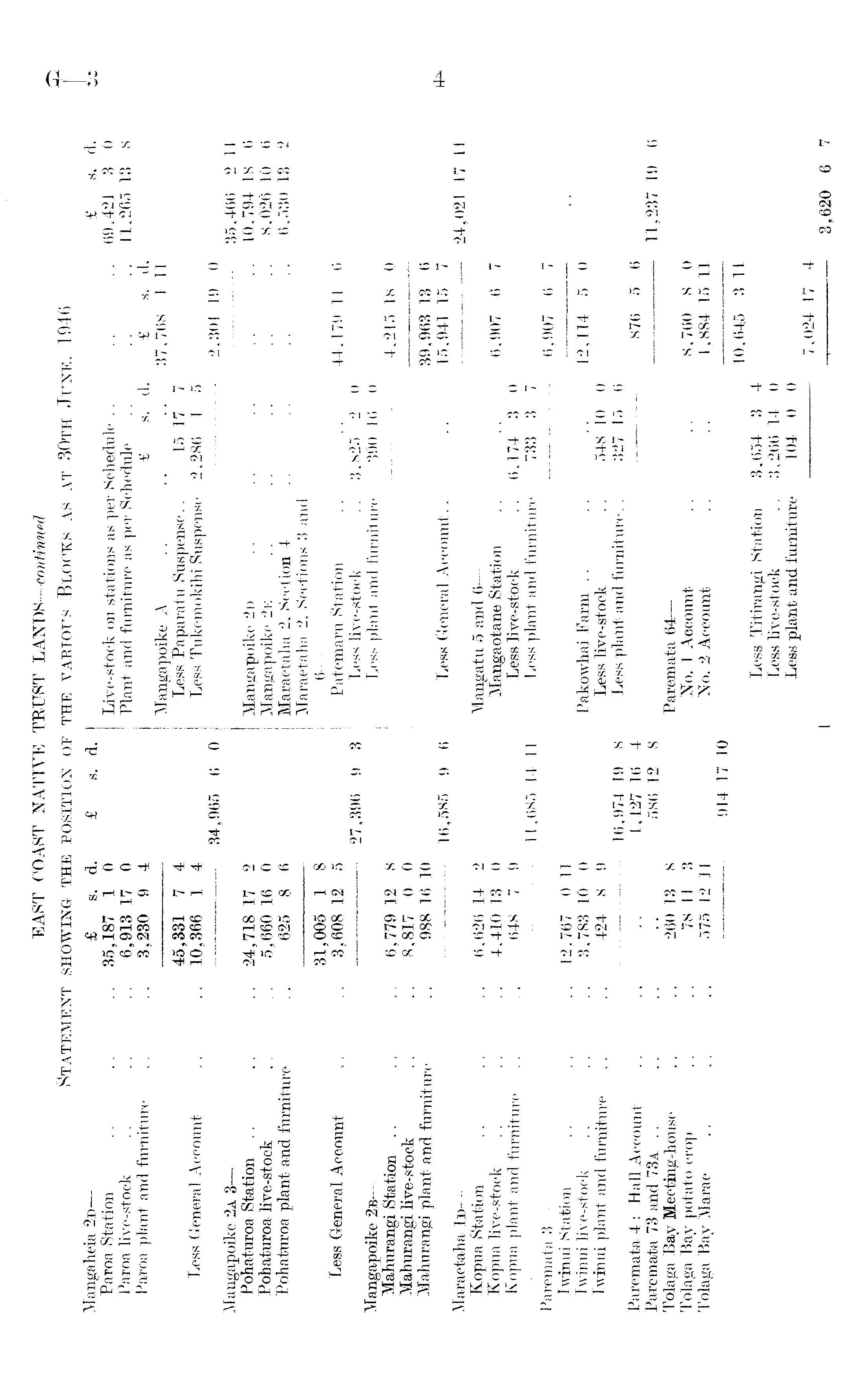 EAST COAST NATIVE TRUST LANDS— confirmed Statement showing the position of the various Blocks as at 30th June. 1946 Mangaheia 2d— £ s. d. £ s. d. £ s, d. Paroa Station .. .. .. 35,187 1 0 Live-stock on stations as per Schedule . . .. .. 69,421 3 0 Paroa live-stock .. .. .. 6,913 17 0 Plant and furniture as per Schedule .. .. .. 11,265 13 8 Paroa plant and furniture .. .. 3,230 9 4 £ s. d. £ s. d. Mangapoike A . . .. .. 37,70S 1 1 1 45,331 7 4 Less Paparatu Suspense. . 15 17 7 Less General Account .. .. 10,366 1 4 Less Tukemokihi Suspense 2,286 1 5 34,965 6 0 2,301 19 0 Mangapoike 2a 3 35,466 2 11 Pohaturoa Station .. .. .. 24,718 17 2 Mangapoike 2n .. .. .. .. .. 10,794 18 (i Pohaturoa live-stock .. ~ 5,660 16 0 Mangapoike 2 k .. .. .. .. ..8,026 10 6 Pohaturoa plant and furniture .. 625 8 6 Maraetaha 2. Section 4 .. .. .. .. 6,530 13 2 Maraetaha Maraetaha 2, Sections 3 and 31,005 1 8 6 Less General Account .. .. 3,608 12 5 Patemaru Station .. .. 44,179 11 6 - 27,396 9 3 Less live-stock .. 3.825 2 0 Mangapoike 2b— Less plant and furniture 390 16 0 Mahurangi Station .. .. .. 6,779 12 8 4,215 18 0 Mahurangi live-stock .. .. 0 0 Mahurangi plant and furniture .. 988 16 10 39,963 13 6 —— 16,585 9 6 Less General Account. . .. 15,941 15 7 Maraetaha Id— 24,021 17 11 Kopua Station . . . . . . 6,626 14 2 Mangatu 5 and 6 Kopua live-stock .. .. .. 4,410 13 0 Mangaotane Station .. .. 6,907 6 7 Kopua plant and furniture .*. .. 648 7 9 Less live-stock .. 6,174 3 0 11,685 1-1 11 Less plant and furniture 733 3 7 Paremata 3 6,907 6 7 Iwimii Station .. .. .. 12.767 0 11 Iwinui live-stock .. ..3,783 10 0 Pakowhai Farm .. .. .. 12,114 5 0 Iwinui plant and furniture . . . . 424 8 9 Less live-stock . . 548 10 0 16,974 19 8 Less plant and furniture. . 327 15 li Paremata 4: Hall Account .. .. .. 1,127 16 4 876 5 6 Paremata 73 and 73a .. .. .. .. 586 12 8 11,237 19 6 Tolaga Bay Meeting-house .. .. 260 13 8 Paremata 64 Tolaga Bav potato crop .. .. 78 11 3 No. 1 Account .. .. 8,760 8 0 Tolaga Bay Marae '.. .. .. 575 12 11 No. 2 Account .. .. 1,884 15 11 10,645 3 11 Less Titirangi Station 3,654 3 4 Less live-stock .. 3,266 14 0 Less plant and furniture 104 0 0 7,024 17 4 I -, 3,620 6 7