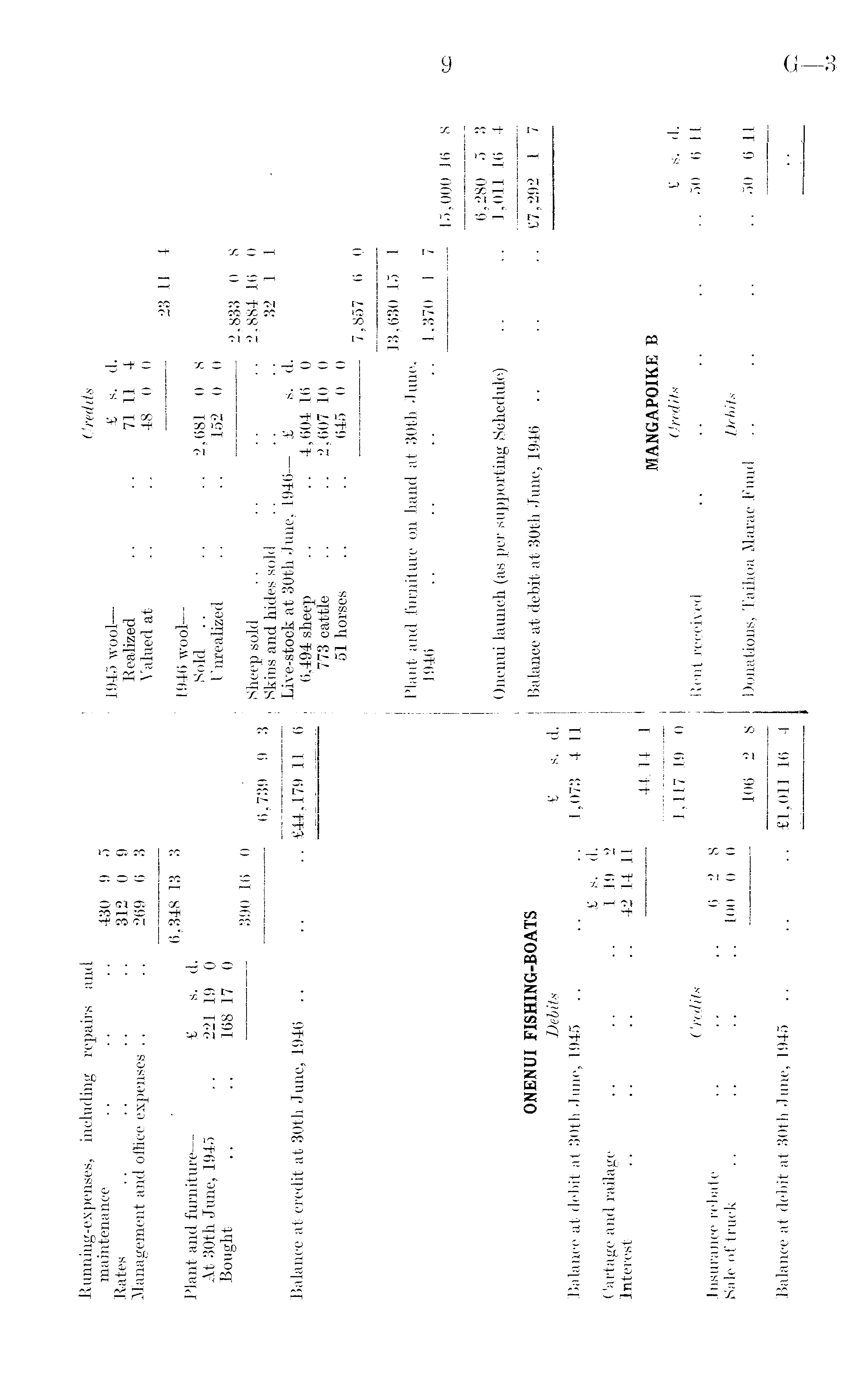 Running-expenses, including repairs and Credits maintenance 430 ,9 6 1945 wool- £ s. d. S ateS + 'J ffi ?!2 ? 5 Realized .. .. 71 11 4 Management and office expenses .. .. 269 6 3 Valued at 48 0 0 , 23 11 4 !,,,!,.. „ 6,348 13 3 1946 woolriant and iurniture— £ s. d. «ij 9 «ai n a At 30th June, 1945 .. 22119 0 " .'. 152 0 0 Bought .. 168 17 0 I g 833 0 8 3901(i ° fl7 , q o , Sheep sold l6 0 __!_____ Skins and hides sold • • • • • ■ 32 1 1 i> i !•. . onu t on , „r. n-. Live-stock at 30th June, 1946 £ s. d. Balance at credit at 30th June, 1946 .. .. ..£44,179 11 6 6,494 sheep .. .. 4,604 16 0 773 cattle .. .. 2'607 10 0 51 horses .. . . 645 0 0 7,857 6 0 13,630 15 1 Plant and furniture on hand at 30th June, 1946 .. .. .. .. 1,370 1 7 — 15,000 16 8 6,280 5 3 Onenui launch (as per supporting Schedule) .. .. 1,011 16 4 ONENUI FISHING-BOATS Balance at debit at 30th June, 1946 .. .. .. £7,292 1 7 Debits £ s. d. ._..— Balance at debit at 30th June, 1945 .. .. .. 1,073 4 11 £ s. d. Cartage and railage .. .. .. 1 19 2 Interest . . .. .. . . 42 14 11 44 14 1 MANGAPOIKE B 1 117 19 0 Credits I s. d. Credit* Rent received .. .. .. .. . . 50 6 11 Insurance rebate .. .. .. 6 2 8 Sale of truck .. .. .. .. 100 0 0 Debits lO6 2 8 Donations, Taihoa Marae Fund . . .. . . .. 50 6 11 Balance at debit at 30th June, 1945 .. .. .. £1,01116 4