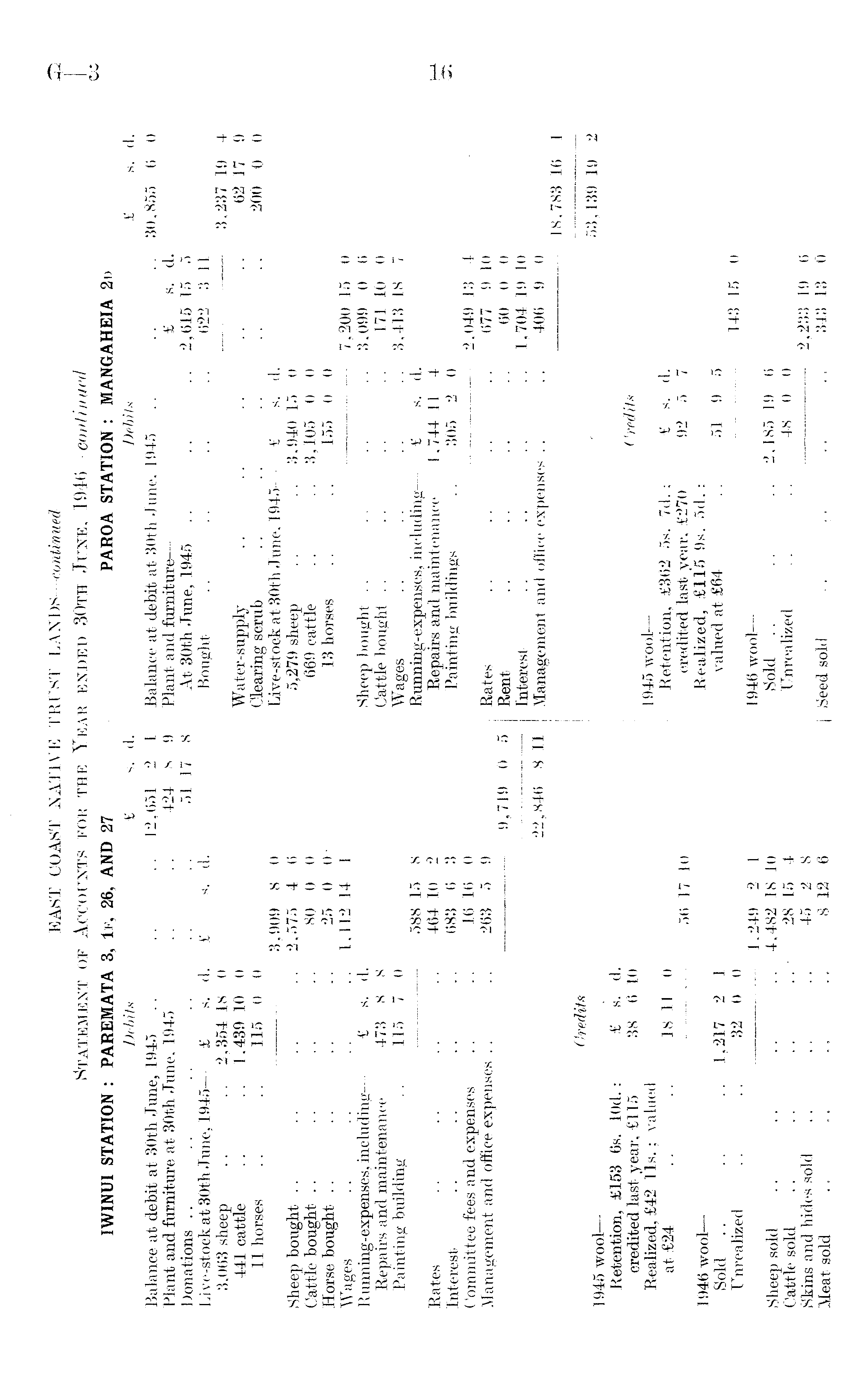 EAST COAST NATIVE TRUST LANDS— continued Statement of Accounts for the Year ended 30th June, 1946— continued IWINUI STATION : PAREMATA 3, If, 26, AND 27 PAROA STATION : MANGAHEIA 2d Debits £ s. d. Debits £ s. d. Balance at debit at 30th June, 1945 .. .. .. 12,651 2 1 Balance at debit at 30th June. 1945 .. .. .. 30,855 6 0 Plant and furniture at 30th June. 1945 . . . . 424 8 9 Plant and furniture— £ s. d. Donations .. .. .. .. .. .. 51 17 8 At 30th June, 1945 .. .. .. 2,615 15 5 Live-stock at 30th June, 1945 £ s. d. £ s. d. Bought .. .. .. .. 622 3 11 3,063 sheep .. .. 2,354 18 0 3,237 19 4 441 cattle .. .. 1,439 10 0 Water-supply .. .. .. .. .. 62 17 9 11 horses .. .. 115 0 0 j Clearing scrub .. .. .. .. .. 200 0 (l 3,909 8 0 Live-stock at 30th June. 1945 £ s. d. Sheep bought .. .. .. .. 2,575 4 6 5,279 sheep .. . . 3,940 15 0 Cattle bought .. .. .. .. 80 0 0 669 cattle .. .. 3,105 0 0 Horse bought .. .. .. .. 25 0 0 • 13 horses .. .. 155 0 0 Wages .. .. .. .. 1.112 14 1 7,200 15 0 Running-expenses, including-— £ s. d. Sheep bought .. .. .. .. 3,099 0 6 Repairs and maintenance 473 8 8 Cattle bought .. .. .. .. 171 10 0 Painting building .. 115 7 0 Wages .. .. .. .. 3,413 18 7 5BB 15 S Running-expenses, including— £ s. d. Rates .. .. .. .. 464 10 2 Repairs and maintenance 1,744 11 4 Interest .. .. . . .. 683 6 3 Painting buildings . . 305 2 0 Committee fees and expenses .. .. 16 16 0 ■— 2,049 13 4 Management and office expenses . . .. 263 5 9 Rates . . . . . . . . 677 9 10 _ 9,719 0 5 Rent .. .. .. .. 60 0 () ——— Interest .. .. .. .. 1,704 19 10 22,846 8 11 Management and office expenses .. .. 406 9 0 18,783 16 1 1945 wool- . ' 53 > 139 ly 2 Retention, £153 6s. lOd. : £ s. d. credited last year, £ll5 38 6 10 Credits Realized, £42 lis.; valued 1945 wool—at £24 .. .. 18 11 0 Retention, £362 ss. 7d. ; £ s. d. _- 56 17 10 credited last year, £270 92 5 7 1946 wool— Realized, £ll5 9s. sd. ; Sold .. .. .. 1,217 2 1 valued at £64 .. 51 9 5 Unrealized .. .. 32 0 0 143 15 0 1.249 2 I 1946 woolSheep sold .. .. .. .. 4,482 18 10 Sold .. .. .. 2,185 19 6 Cattle sold .. .. . . . . • 28 15 4 Unrealized . . . . 48 0 0 Skins and hides sold .. .. .. 45 2 8 2,233 19 6 Meat sold .. .. .. .. 8 12 6 | Seed sold . . .. .. . . 343 13 0