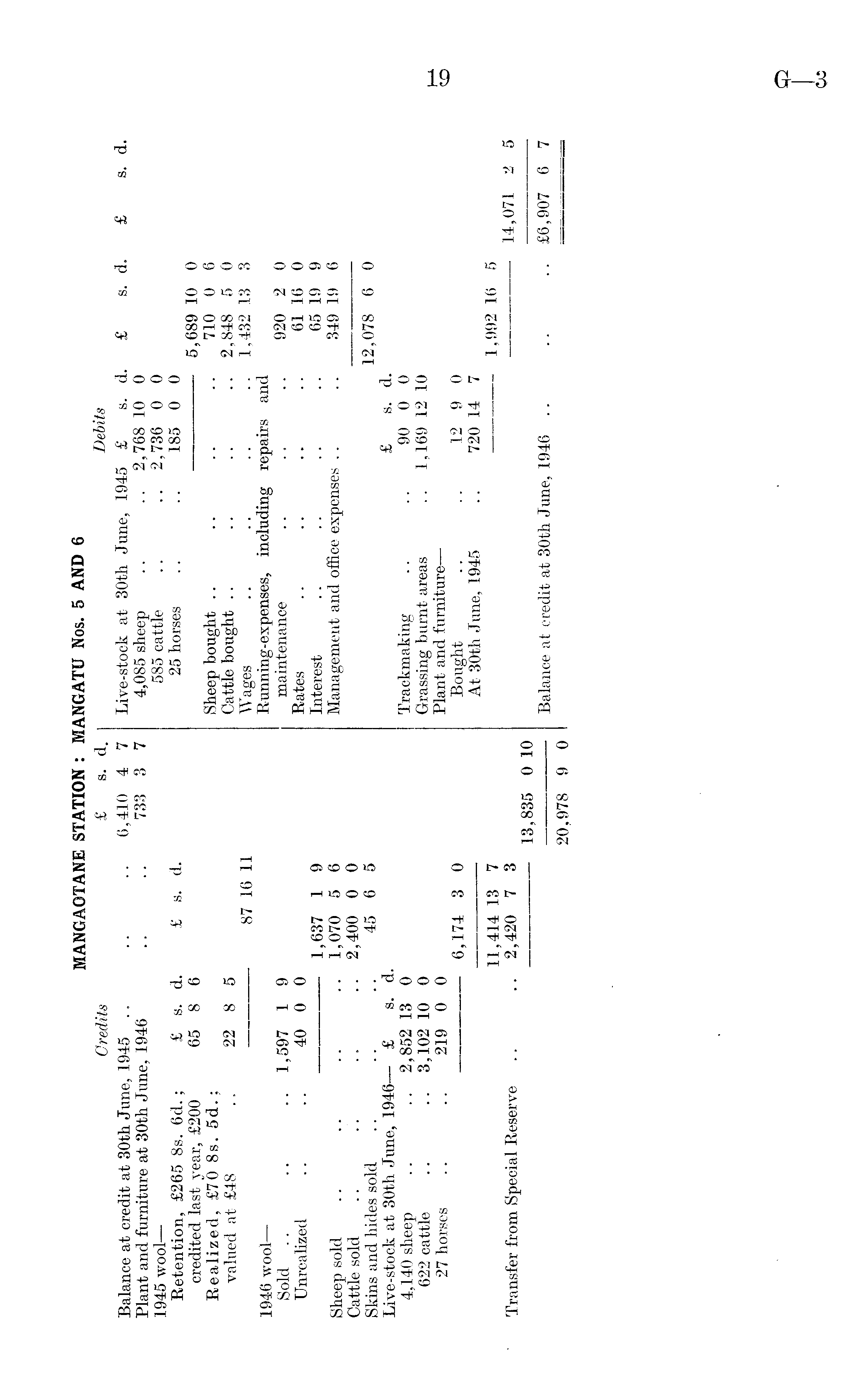 MANGAOTANE STATION : MANGATU Nos. 5 AND 6 Credits £ s. d. Debits Balance at credit at 30th June, 1945 .. .. .. 6,410 4 7 Live-stock at 30th June, 1945 £ s. d. £ s. d. £ s. d. Plant and furniture at 30th June, 1946 .. .. 733 3 7 4,085 sheep .. .. 2,768 10 0 1945 wool— 585 cattle .. .. 2,736 0 0 Retention, £265 Bs. 6d.; £ s. d. £ s. d. 25 horses .. .. 185 0 0 credited last year, £2OO 65 8 6 5,689 10 0 Realized, £7O Bs. 5d.; Sheep bought .. .. .. .. 710 0 6 valued at £4B .. 22 8 5 Cattle bought .. .. .. .. 2,848 5 0 , 87 16 11 Wages .. .. .. .. 1,432 13 3 1946 wool— Running-expenses, including repairs and Sold .. .. .. 1,597 1 9 maintenance .. .. .. 920 2 0 Unrealized .. .. 40 0 0 Rates .. .. .. .. 61 16 0 1,637 1 9 Interest .. .. .. .. 65 19 9 Sheep sold .. .. .. .. 1,070 5 6 Management and office expenses .. .. 349 19 6 Cattle sold .. .. .. .. 2,400 0 0 Skins and hides sold ...... 45 6 5 12,078 6 0 Live-stock at 30th June, 1946 £ s. d. £ s. d. 4,140 sheep .. .. 2,852 13 0 Trackmaking .. .. 90 0 0 622 cattle .. .. 3,102 10 0 Grassing burnt areas .. 1,169 12 10 27 horses .. .. 219 0 0 Plant and furniture— 6,174 3 0 Bought .. .. 12 9 0 At 30th June, 1945 .. 720 14 7 11,414 13 7 1,992 16 5 Transfer from Special Reserve .. .. 2,420 7 3 14,071 2 5 13,835 0 10 Balance at credit at 30th June, 1946 .. .. .. £6,907 6 7 20,978 9 0 =======