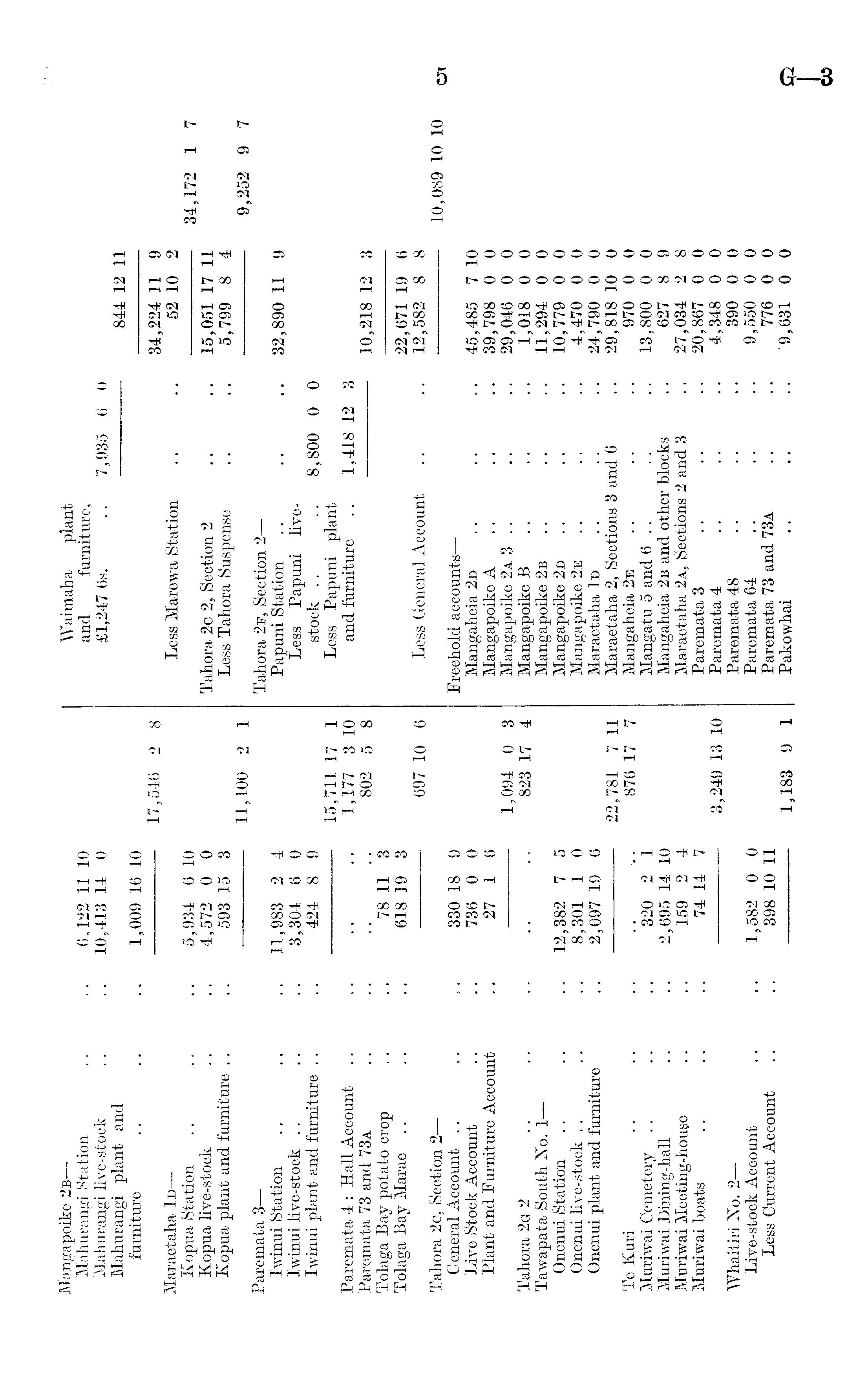 Mangapoike 2b— Waimaha plant Mahurangi Station . > .. 6,122 11 10 and furniture, Mahurangi live-stock .. .. 10,413 14 0 £1,247 6s. .. 7,935 6 0 Mahurangi plant and 844 12 11 furniture .. .. .. 1,009 16 10 17,546 2 8 34,224 11 9 Maraetaha Id— Less Marewa Station .. .. 52 10 2 Kopua Station .. .. .. 5,934 6 10 34,172 1 7 Kopua live-stock .. .. 4,572 0 0 Tahora 2c 2, Section 2 .. .. 15,051 17 11 Kopua plant and furniture .. .. 593 15 3 Less Tahora Suspense .. .. 5,799 8 4 ll,lOO 2 1 9,252 9 7 Paremata 3 Tahora 2f, Section 2 Iwinui Station .. .. .. 11,983 2 4 Papuni Station .. .. .. 32,890 11 9 Iwinui live-stock .. .. .. 3,304 6 0 Less Papuni liveIwinui plant and furniture .. .. 424 8 9 stock .. .. 8,800 0 0 15,711 17 1 Less Papuni plant Paremata 4: Hall Account .. .. .. .. 1,177 3 10 and furniture .. 1,418 12 3 Paremata 73 and 73a .. .. .. .. 802 5 8 10,218 12 3 Tolaga Bay potato crop .. .. 78 11 3 Tolaga Bay Marae .. .. .. 618 19 3 22,671 19 6 697 10 6 Less General Account .. .. 12,582 8 8 Tahora 2c, Section 2 10,089 10 10 General Account .. .. .. 330 18 9 Freehold accounts— Live Stock Account .. .. 736 0 0 Mangaheia 2d .. .. .. 45,485 7 10 Plant and Furniture Account .. 27 1 6 Mangapoike A .. .. .. 39,798 0 0 1,094 0 3 Mangapoike 2a 3 .. .. .. 29,046 0 0 Tahora 2g 2 ... .. .. .. .. 823 17 4 Mangapoike B .. .. .. 1,018 0 0 Tawapata South No. 1— Mangapoike 2b .. .. .. 11,294 0 0 Onenui Station .. .. .. 12,382 7 5 Mangapoike 2d .. .. .. 10,779 0 0 Onenui live-stock .. .. .. 8,301 1 0 Mangapoike 2e .. .. .. 4,470 0 0 Onenui plant and furniture .. 2,097 19 6 Maraetaha Id .. .. .. 24,790 0 0 22,781 7 11 Maraetaha 2, Sections 3 and 6 .. 29,818 10 0 Te Kuri .. .. .. .. ... 876 17 7 Mangaheia 2e .. .. .. 970 0 0 Muriwai Cemetery .. .. .. 320 2 1 Mangatu 5 and 6 .. . . .. 13,800 0 0 Muriwai Dining-hall .. .. 2,695 14 10 Mangaheia 2b and other blocks .. 627 8 9 Muriwai Meeting-house .. .. 159 2 4 Maraetaha 2a, Sections 2 and 3 .. 27,034 2 8 Muriwai boats .. .. .. 74 14 7 Paremata 3 .. .. .. 20,867 0 0 3,249 13 10 Paremata 4 .. .. .. 4,348 0 0 Whaitiri No. 2 Paremata 48 .. . . .. 390 0 0 Live-stock Account .. .. 1,582 0 0 Paremata 64 .. .. .. 9,550 0 0 Less Current Account .. .. 398 10 11 Paremata 73 and 73a .. .. 776 0 0 1,183 9 1 Pakowhai .. .. .. '9,631 0 0
